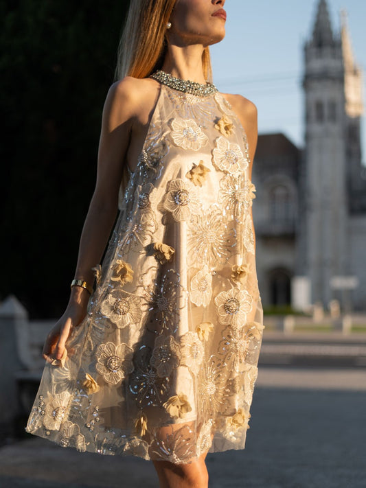 Diamond Embossed Floral Embroidered Dress - Star Queen