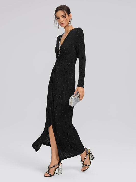 Crystal-Embellished Black Sheer Evening Gown