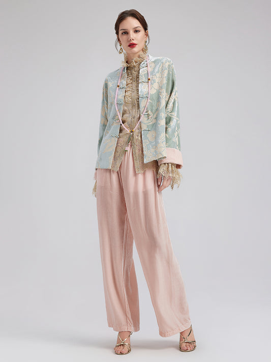 French Ramie Lace-Trimmed Pants with Braided Belt