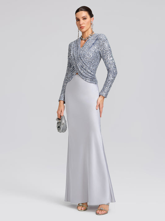 Sequin Panel Satin V Neck Dress (Belt Included)