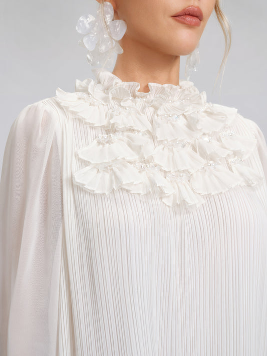 Pearl Beaded Fan Pleated Lantern Sleeve Blouse