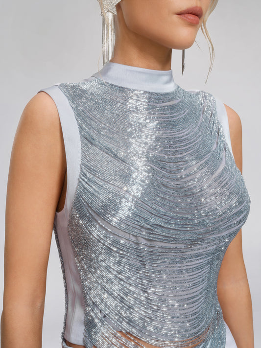 Hand Beaded Fringe Mock Neck Top