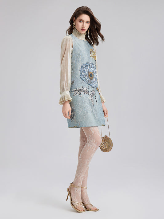 Artistic Print Pleated High Neck Dress
