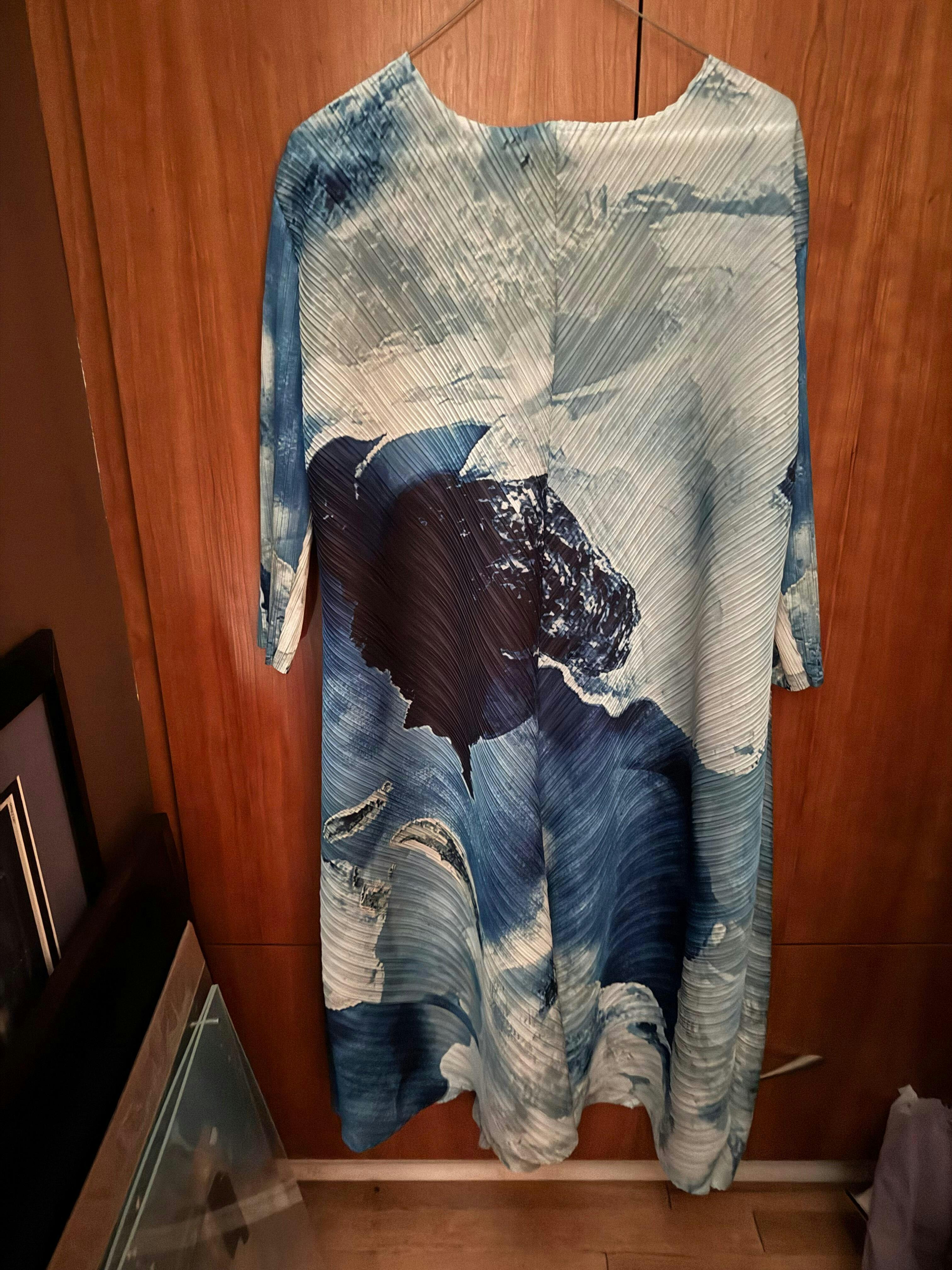 Crafted from finely pleated fabric with excellent elasticity and shape retention, this dress offers comfort and flexibility. Its irregular color block print breaks traditional monotony, showcasing a free, relaxed style. Three-quarter sleeves perfectly reveal slender wrists, paired with a loose fit flattering all body types.