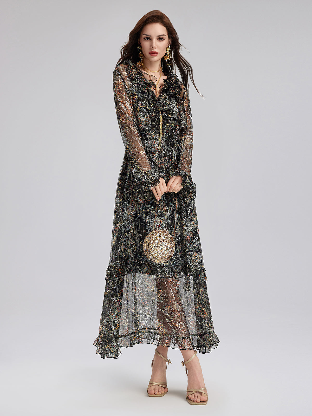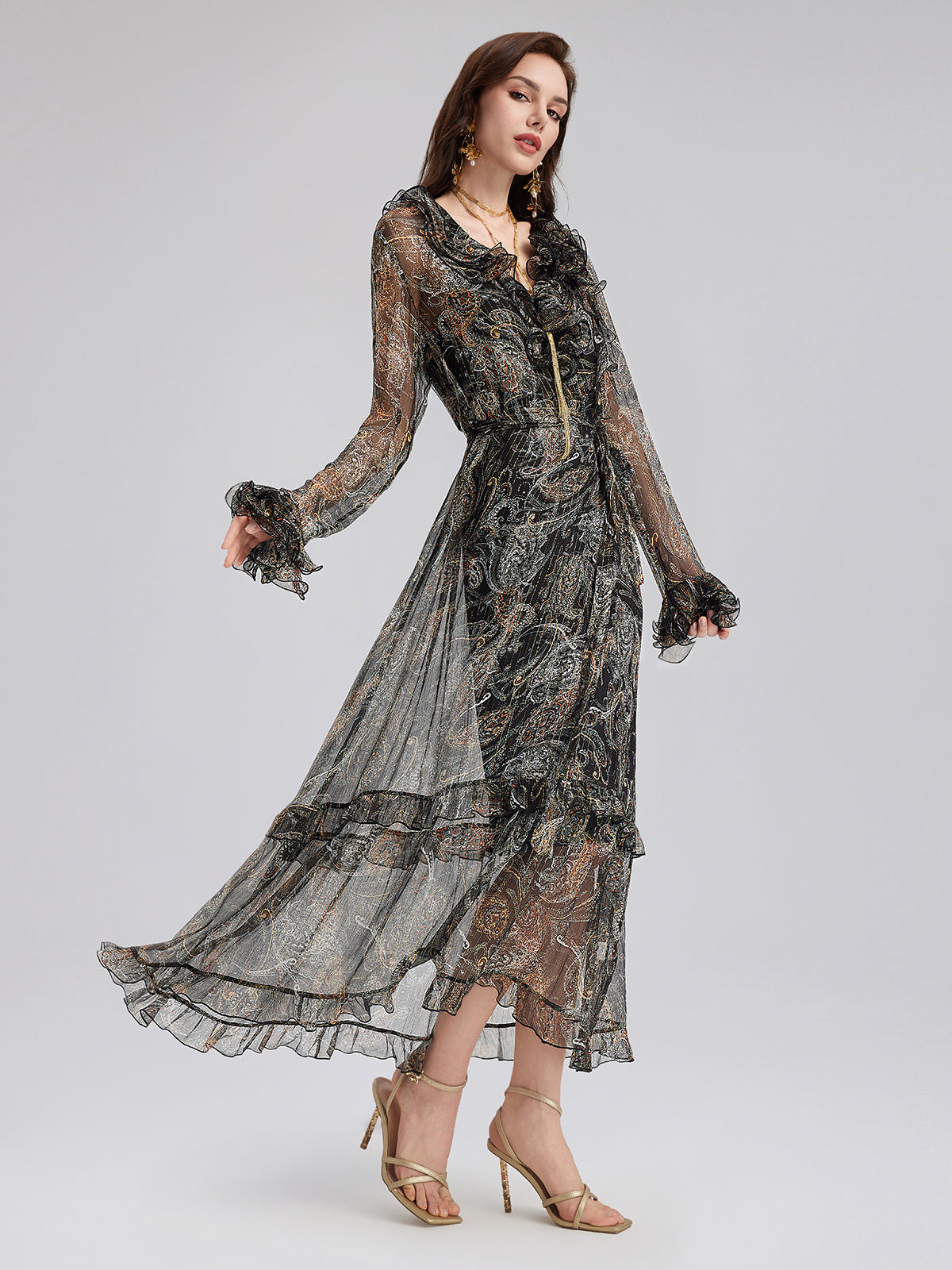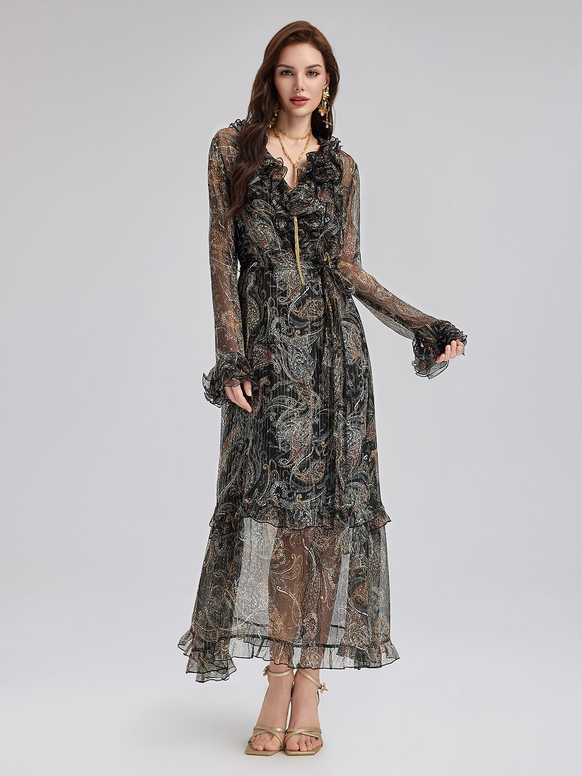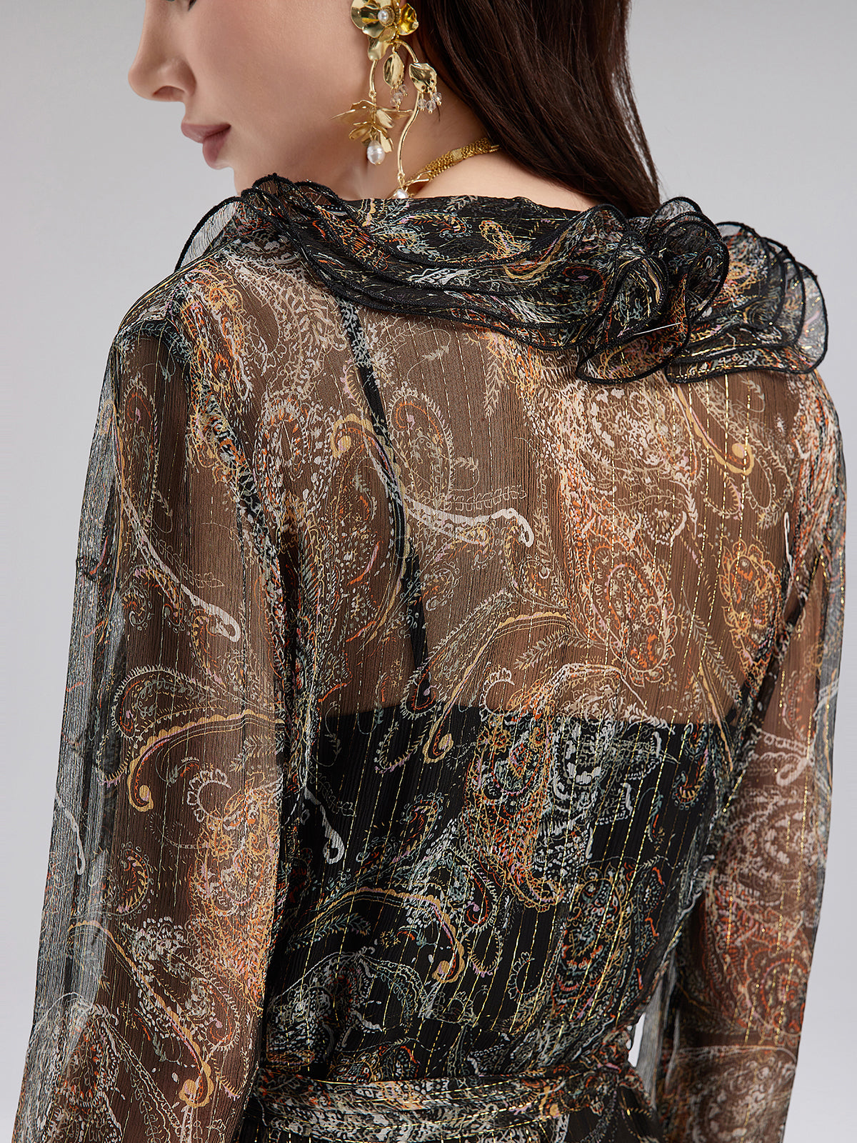 Premium mulberry silk offers a soft feel, natural sheen, and elegant drape. Loose A-line fit suits all body types. V-neckline flatters the face and neck. Ruffled collar and sleeves add airy charm, with hand-rolled floral ruffles for refined detail. (Includes stretchy knit slip and matching fabric belt.)