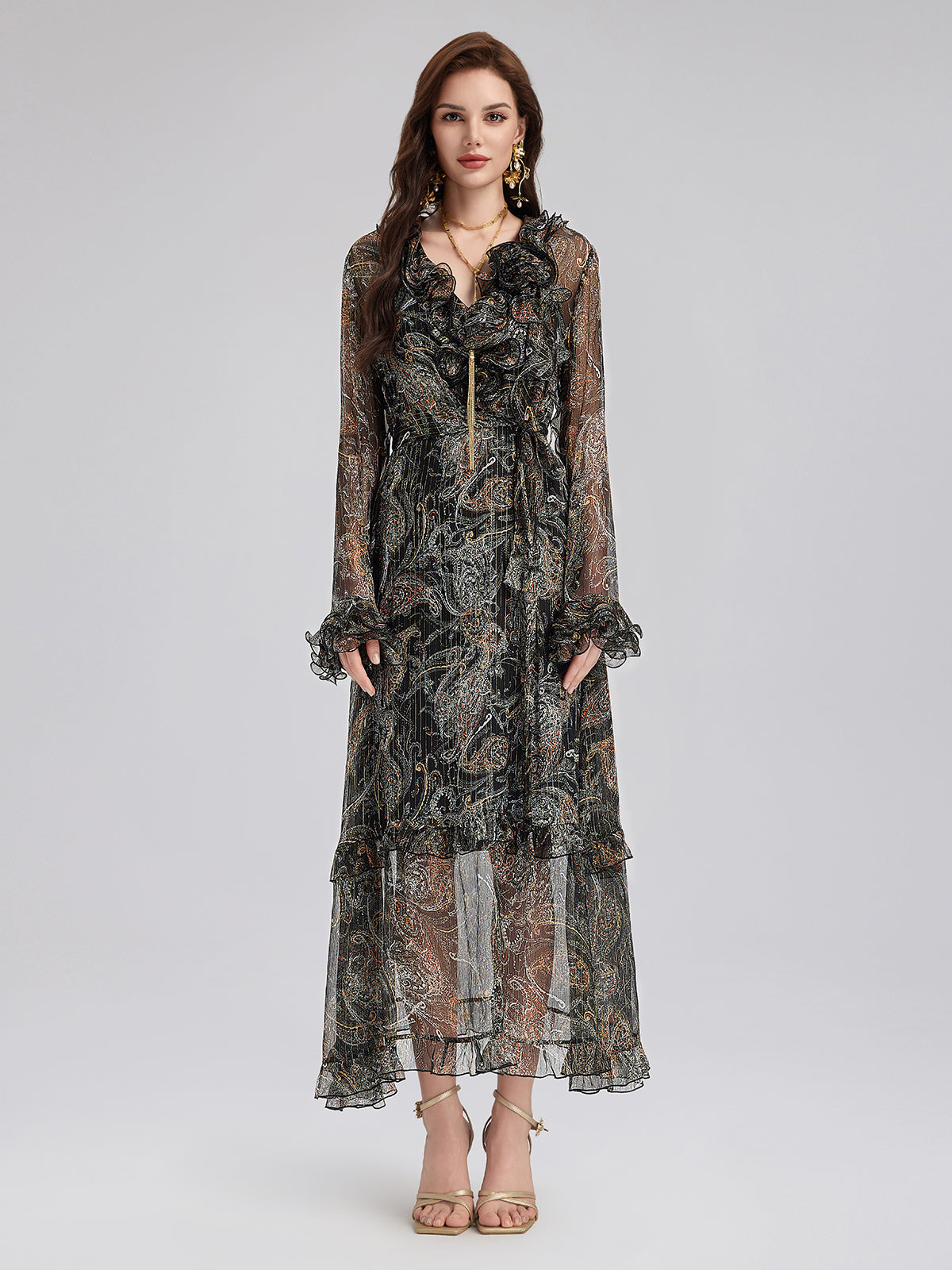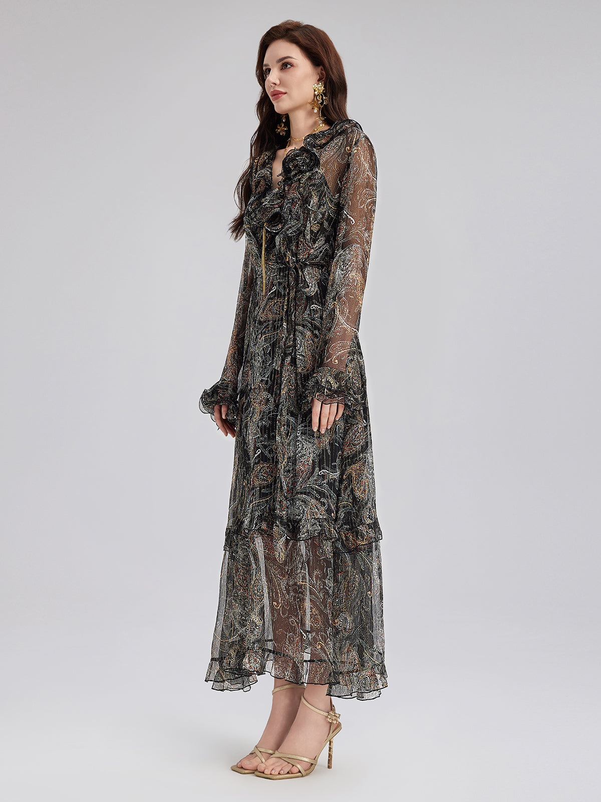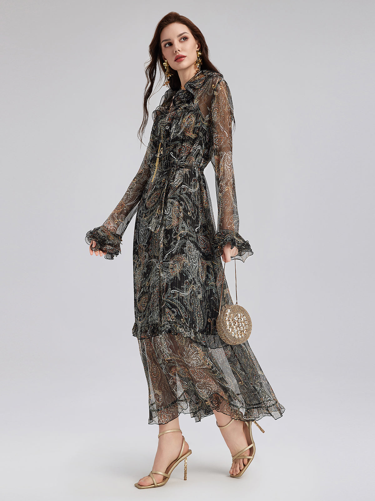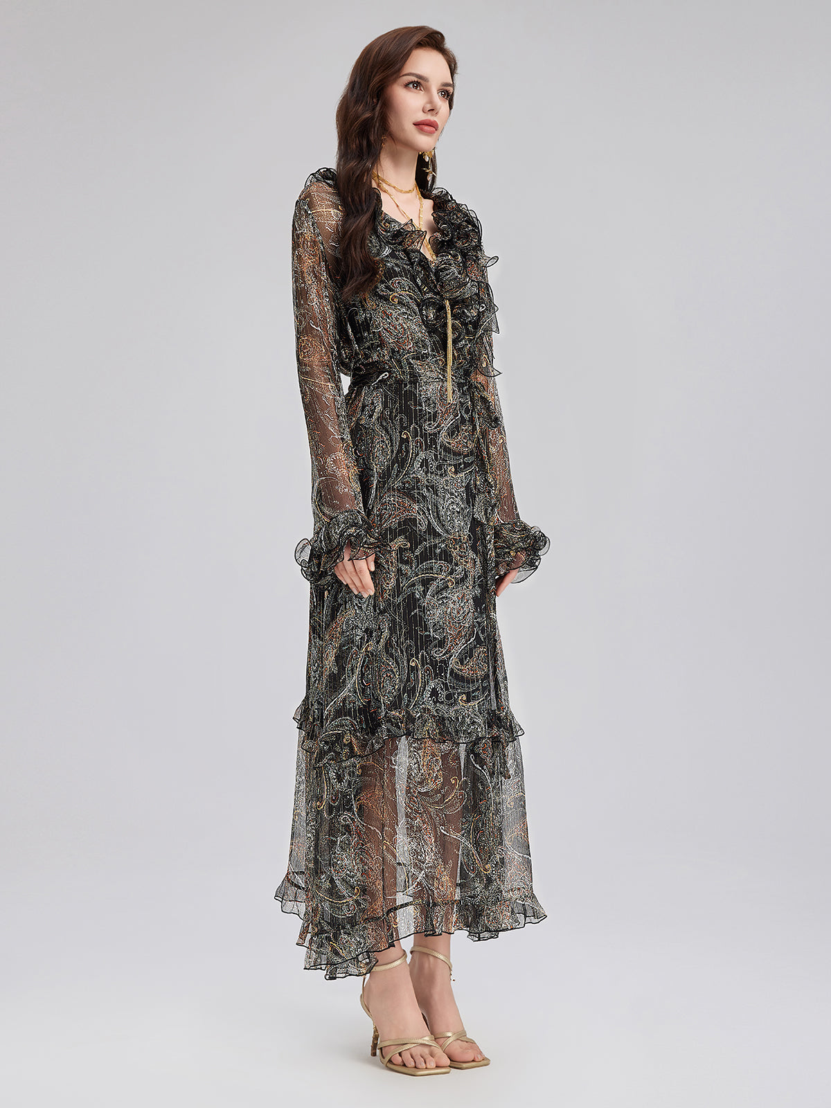 Premium mulberry silk offers a soft feel, natural sheen, and elegant drape. Loose A-line fit suits all body types. V-neckline flatters the face and neck. Ruffled collar and sleeves add airy charm, with hand-rolled floral ruffles for refined detail. (Includes stretchy knit slip and matching fabric belt.)