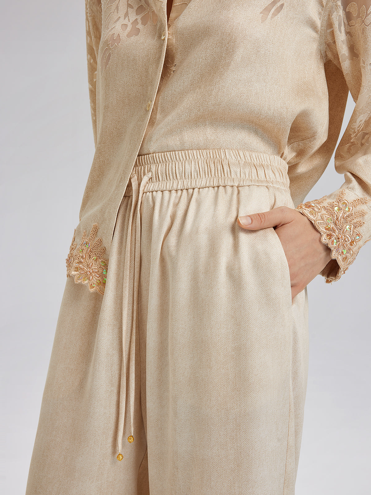 Crafted from a rayon blend with a unique burnout finish and one-of-a-kind gradients. The vintage denim-like texture adds structure and shape. High-waisted, loose wide legs elongate the silhouette. An elastic waistband with adjustable tie offers a customizable, stylish fit.