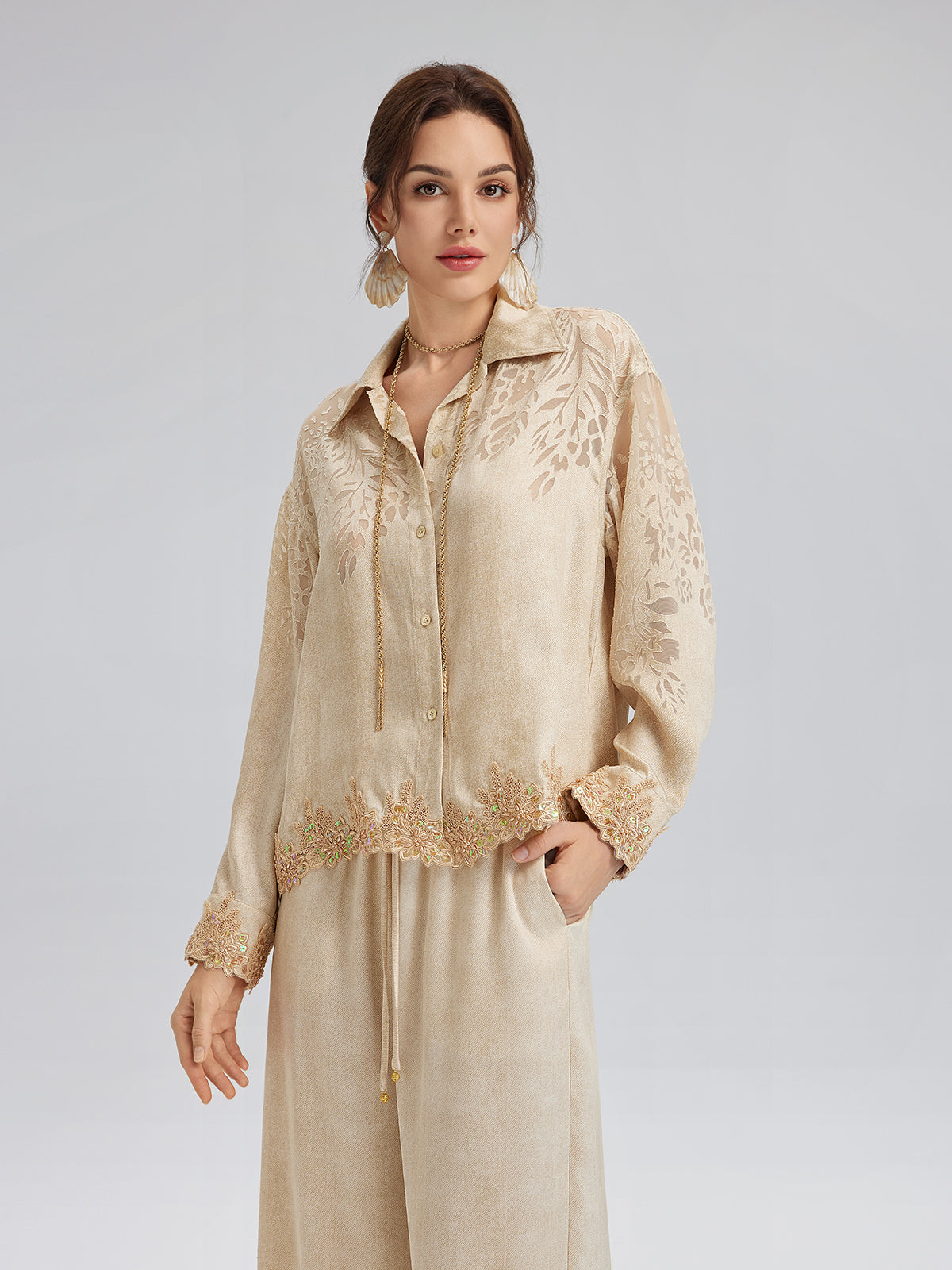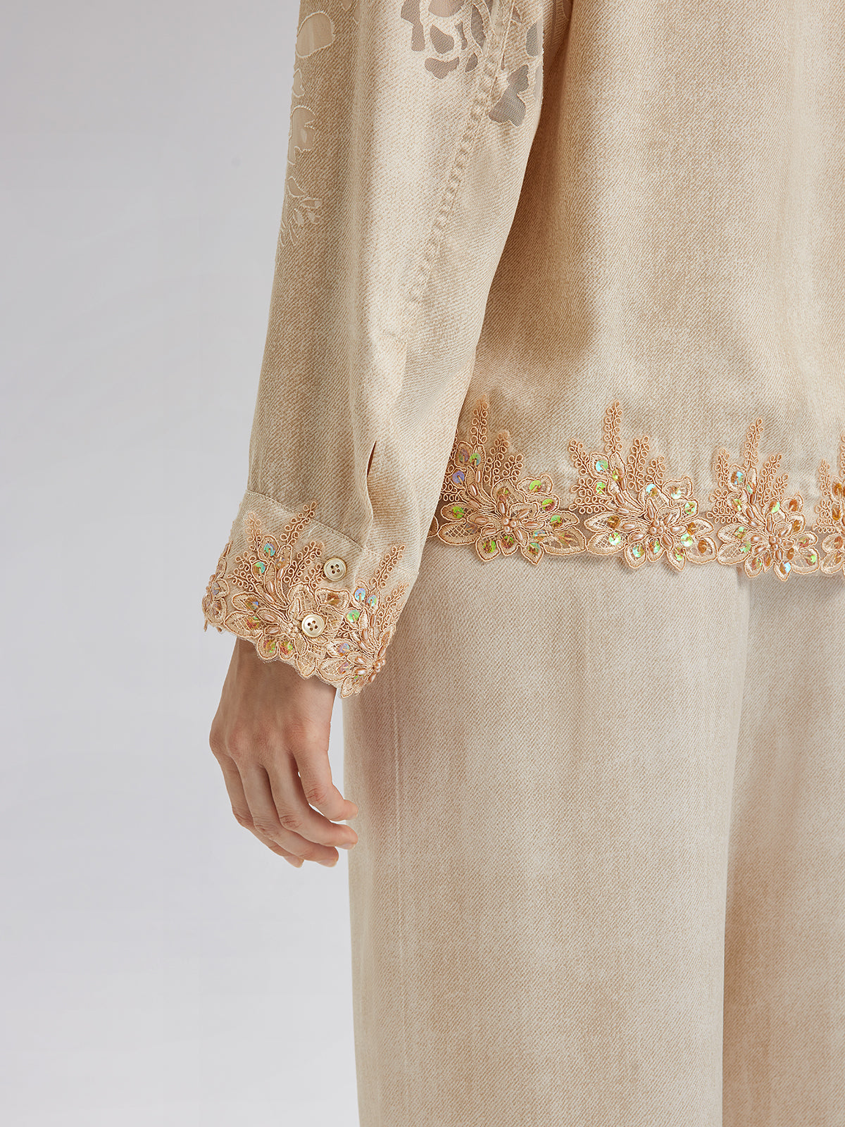 Made from a premium rayon blend with a unique burn-out finish that creates a one-of-a-kind gradient. The fabric mimics washed denim for a structured, vintage look. Hand-sewn beaded lace at the hem adds romance, with each bead secured by artisans for lasting durability. Loose fit ensures comfort and ease of movement.
