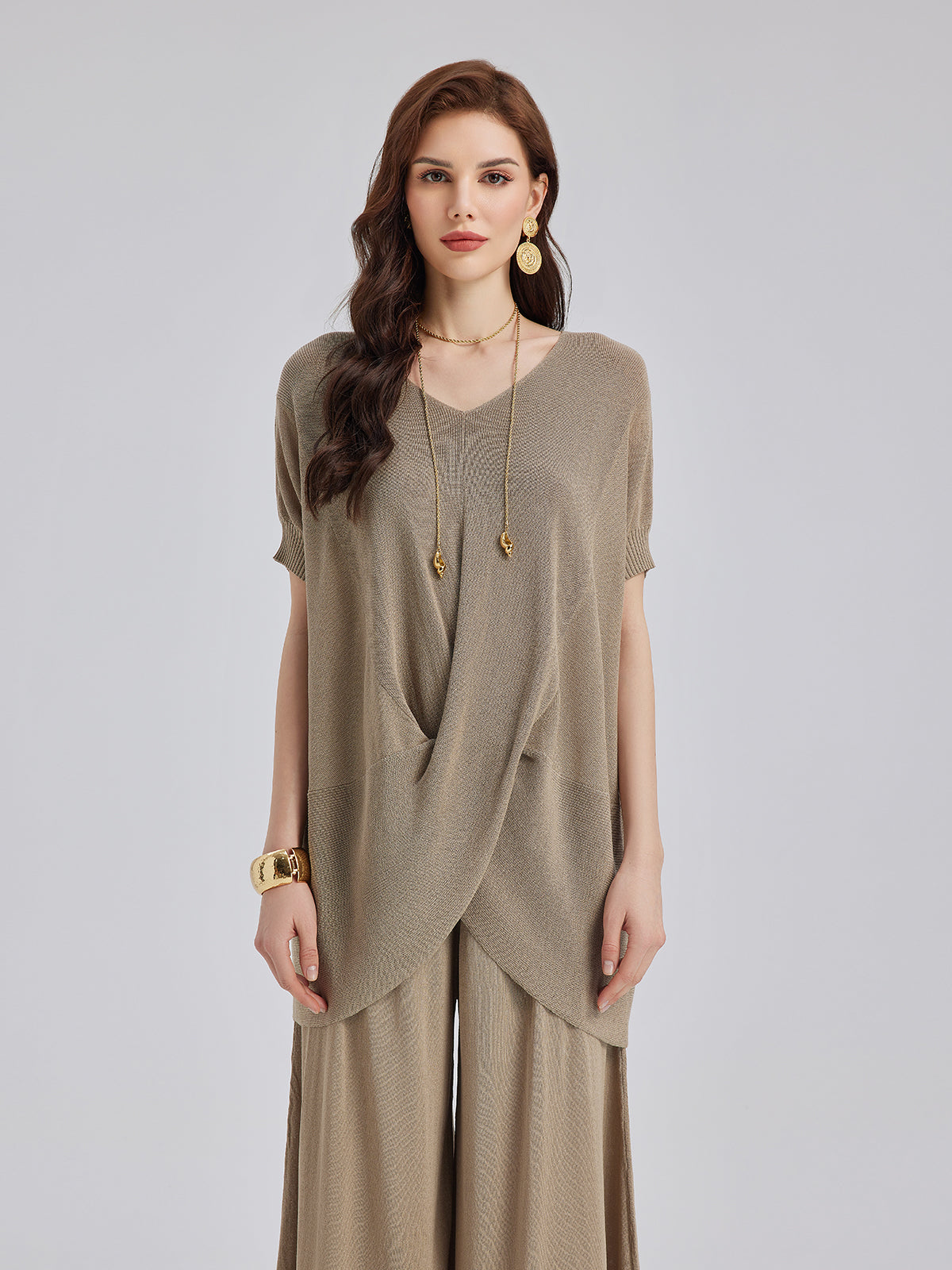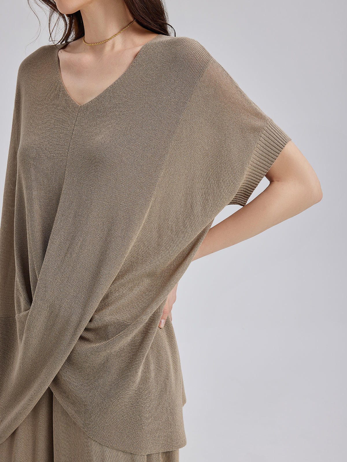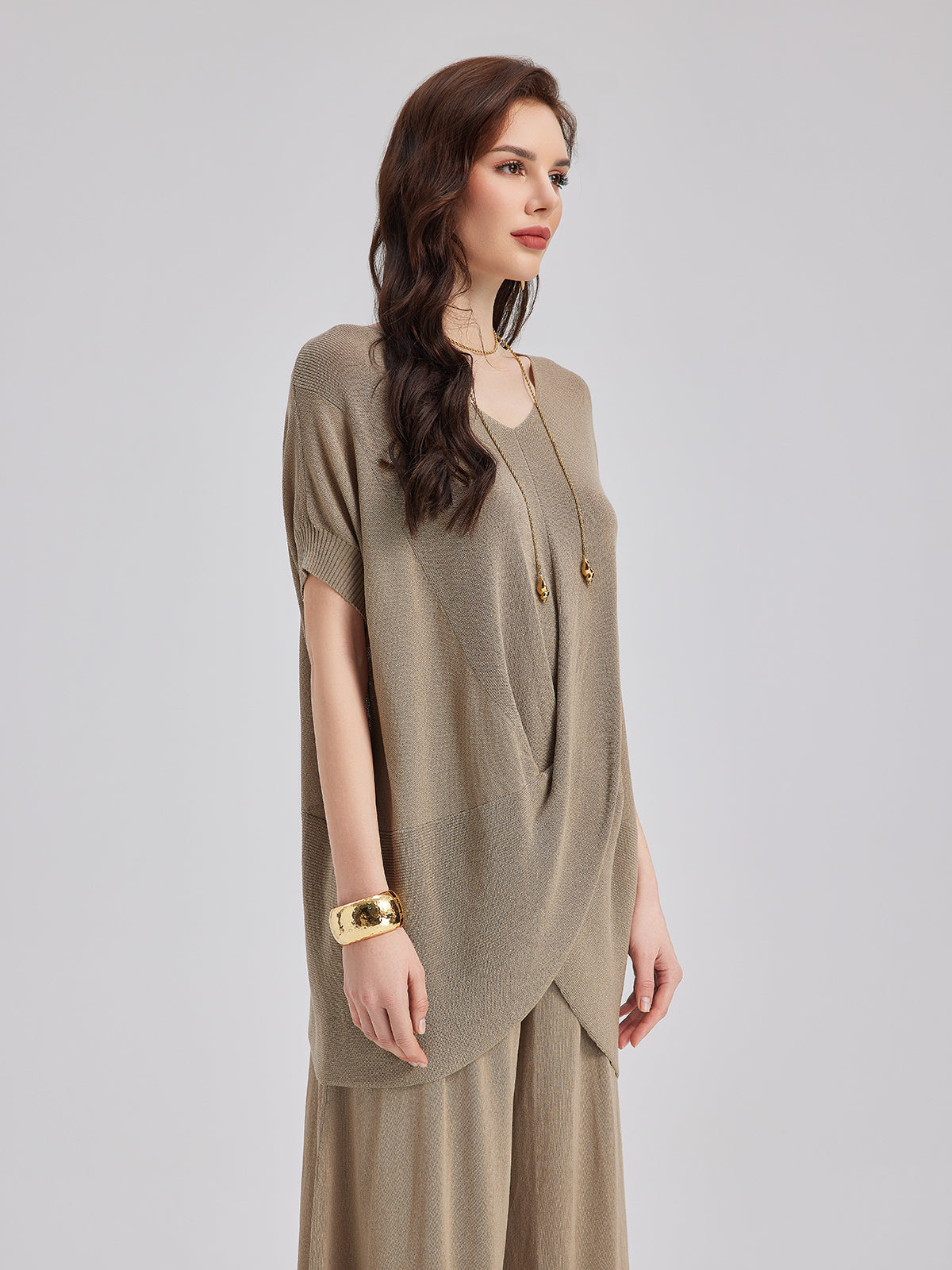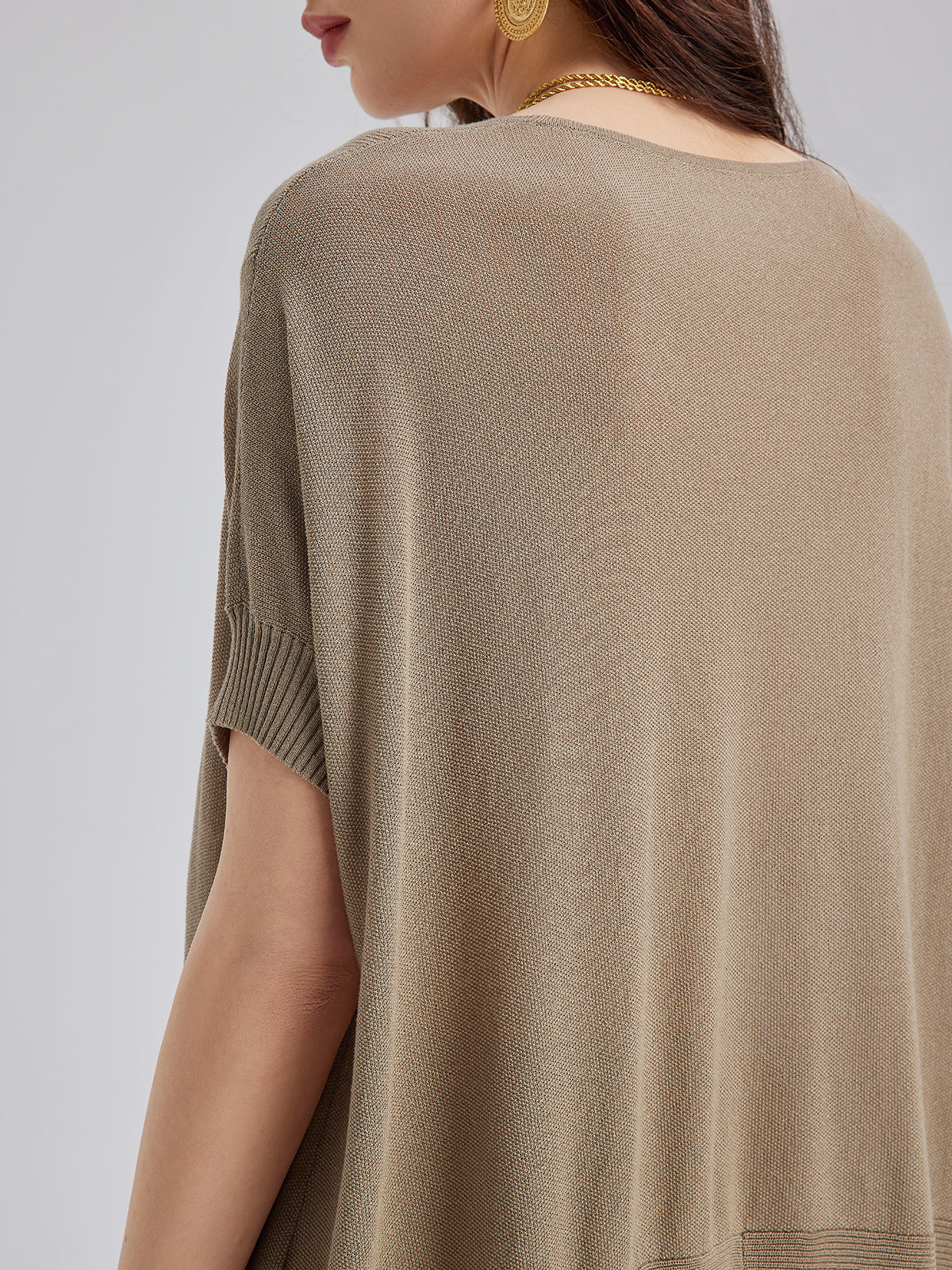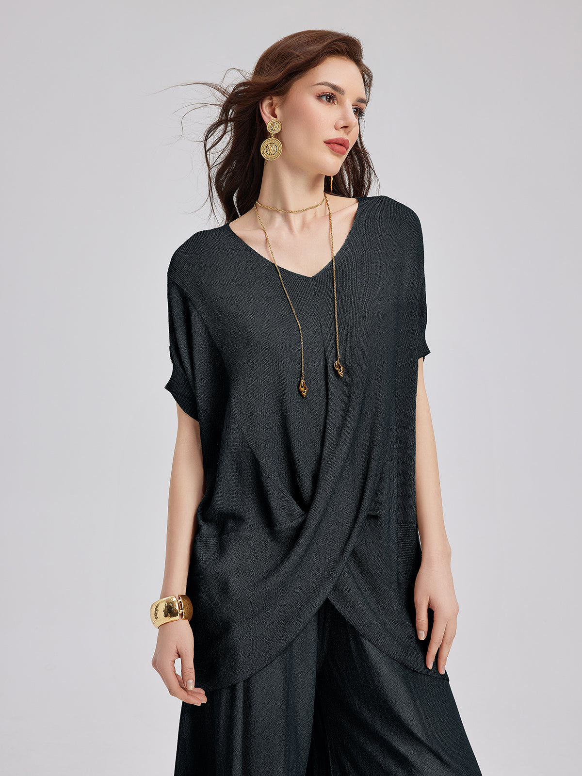 Relaxed fit with high body compatibility. Soft, draping fabric offers comfort and lightness. Asymmetrical French-style cross hem elongates the body. Batwing sleeves suit all body types.