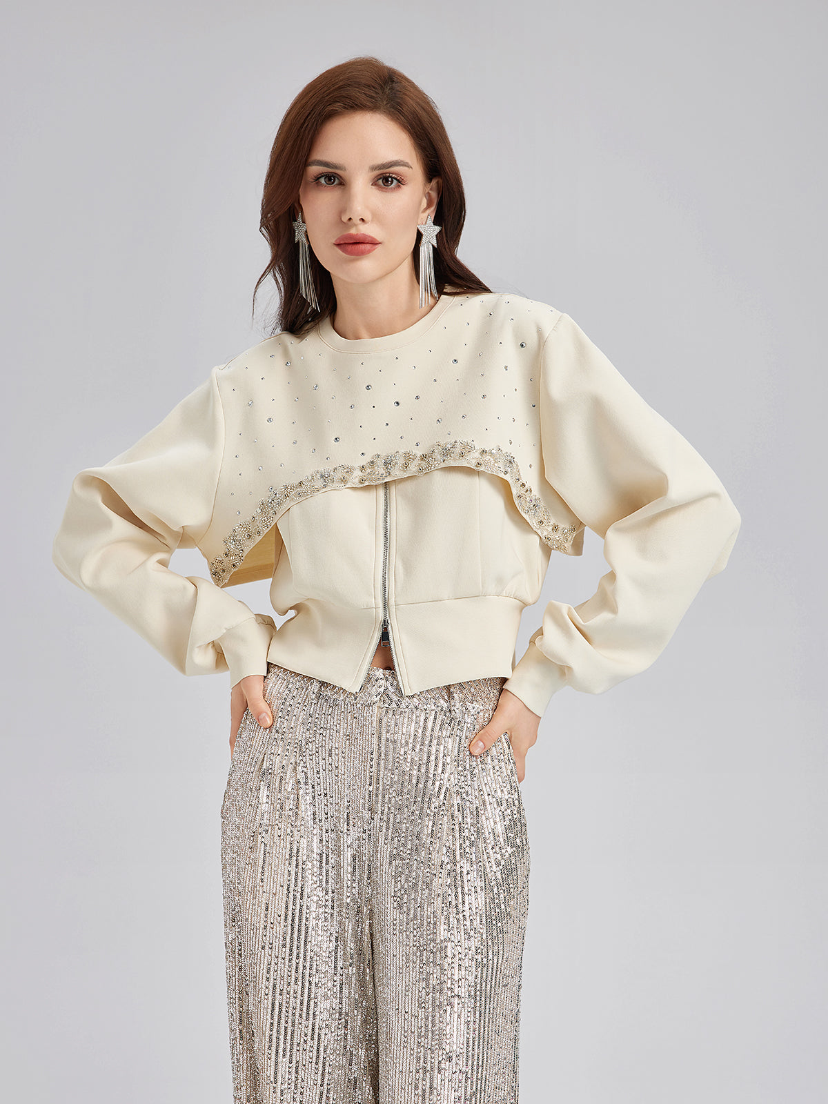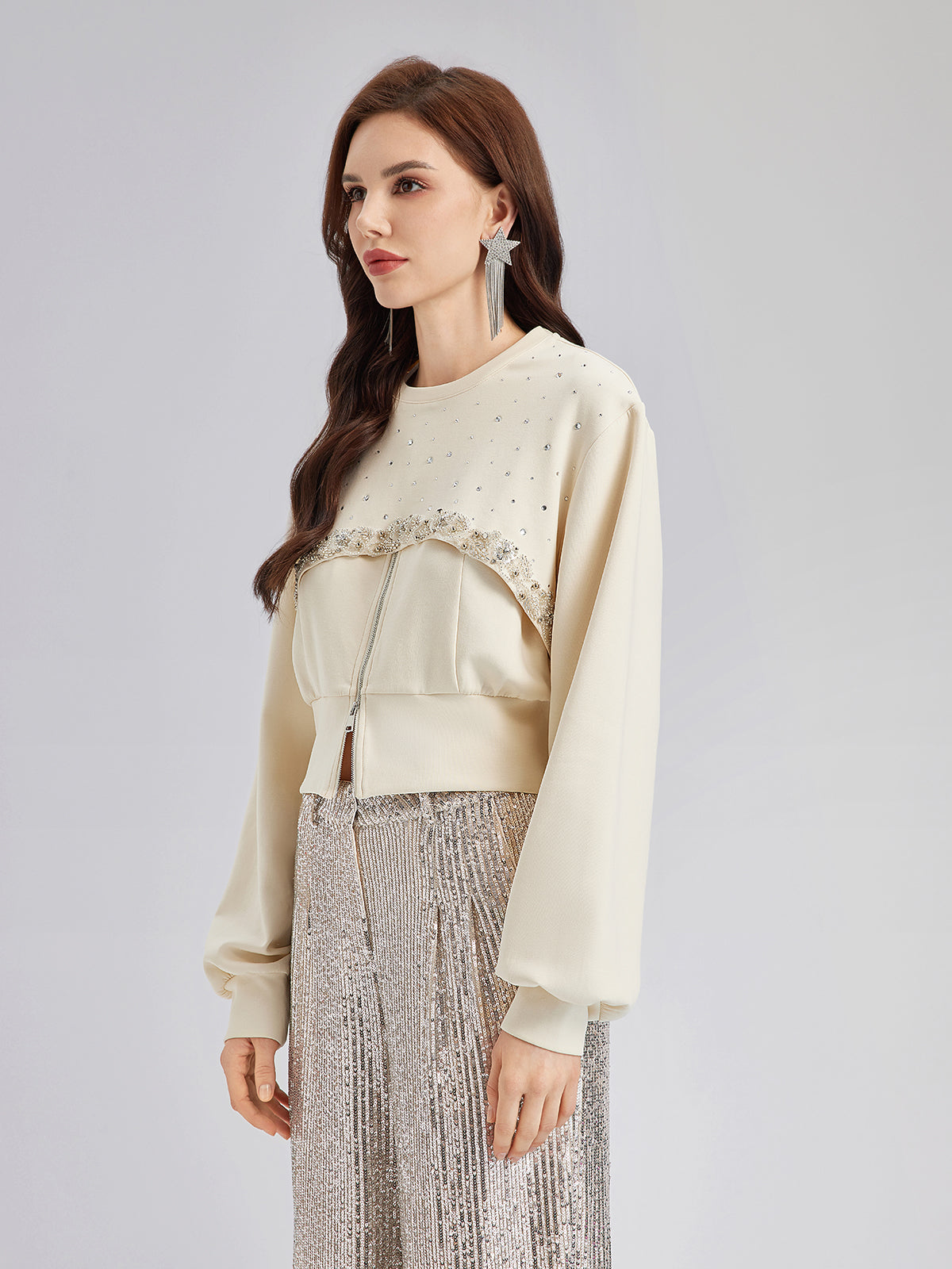 Diamond-Embellished Zipper Vest & Non-hooded Set