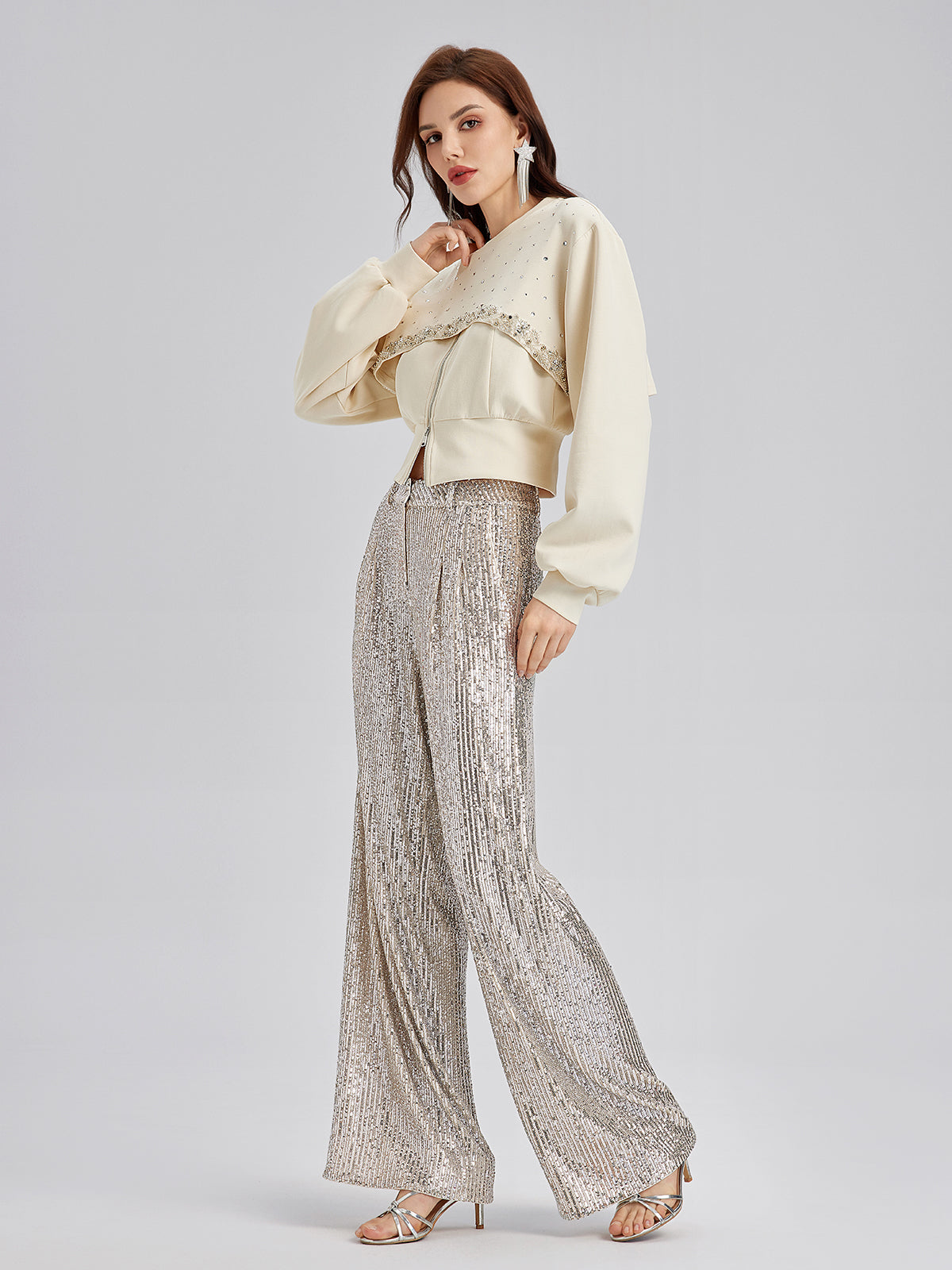 Crafted from high-quality fabric, offering a soft, comfortable feel. Diamond embellishments add shine and gorgeous. The two-piece design offers versatility, while the cropped style creates a flattering, high-waisted effect.