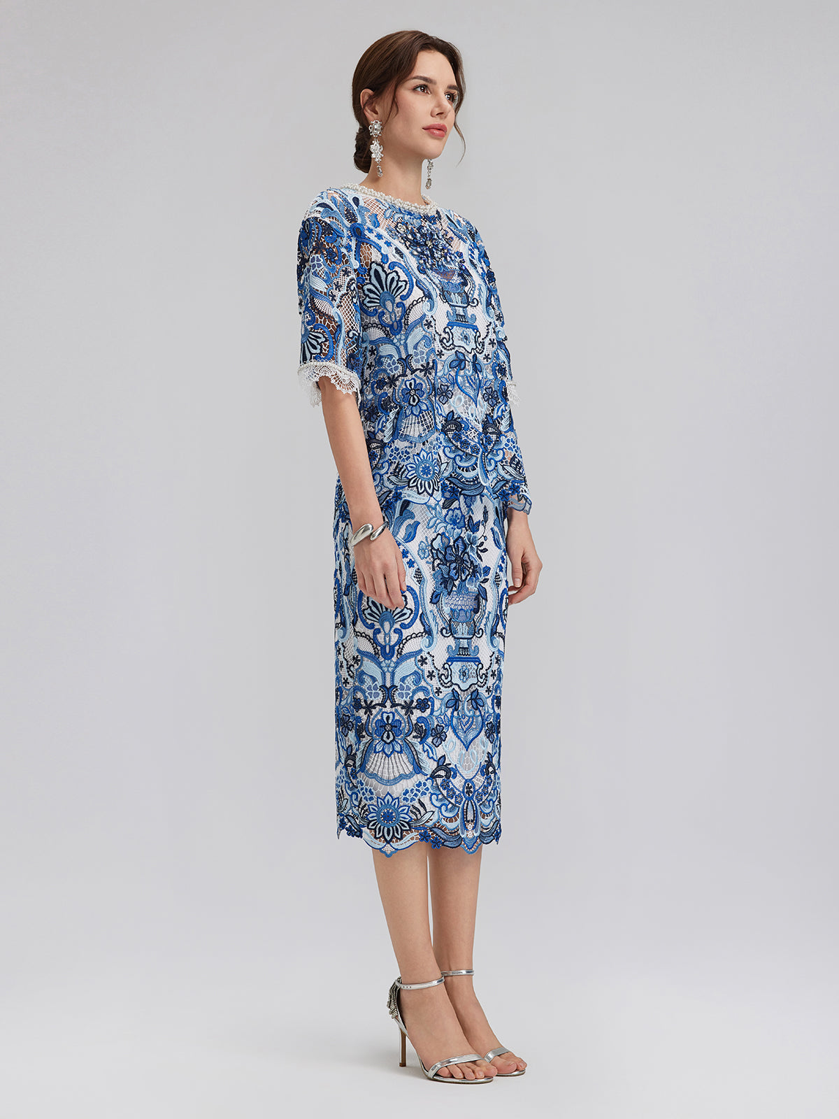 Crafted from imported guipure lace, this pullover offers a soft, non-irritating feel with sculptural texture and vivid detail. Floral trim buttons add a delicate touch, while hand-applied crystals at the chest elevate it with refined sparkle. Comes with a camisole for comfortable coverage.