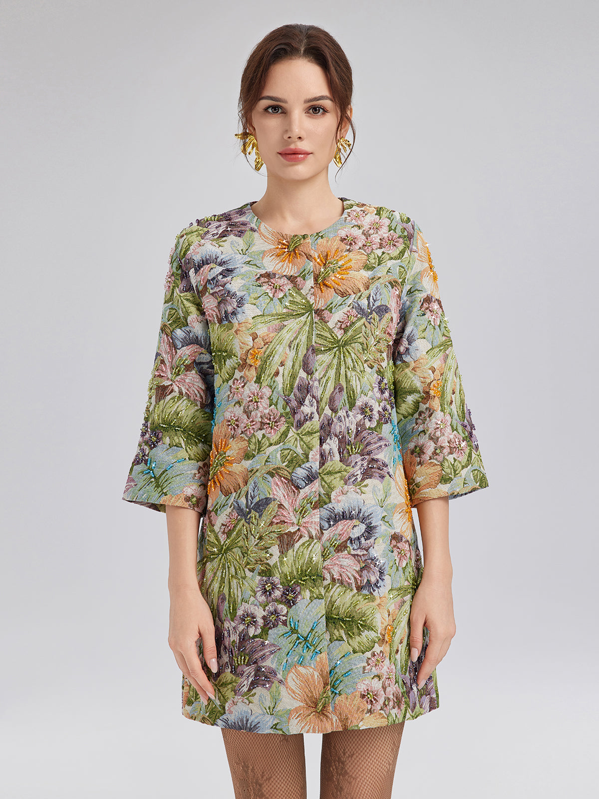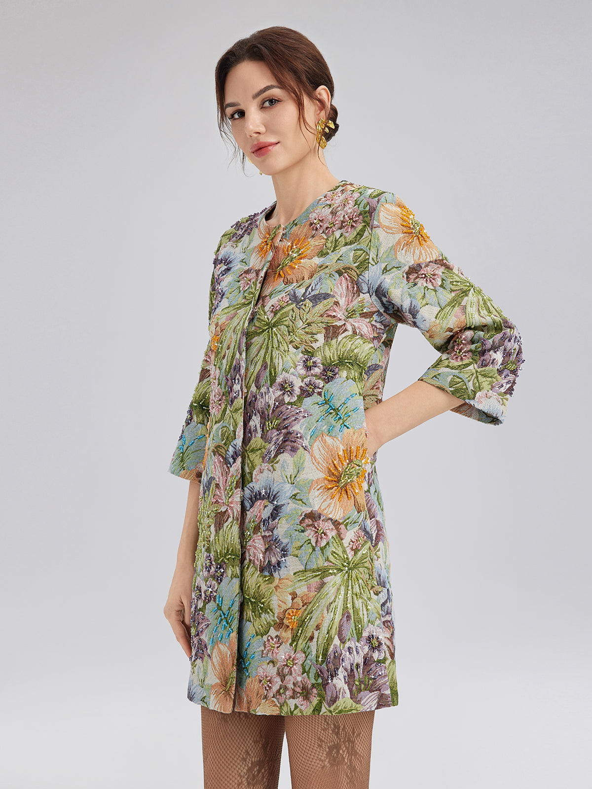 A timeless H-line jacket crafted from lustrous jacquard with raised floral motifs. Each piece is meticulously hand-beaded by artisans for hours, blending texture and brilliance for an elegant, sculptural finish that epitomizes refined craftsmanship.