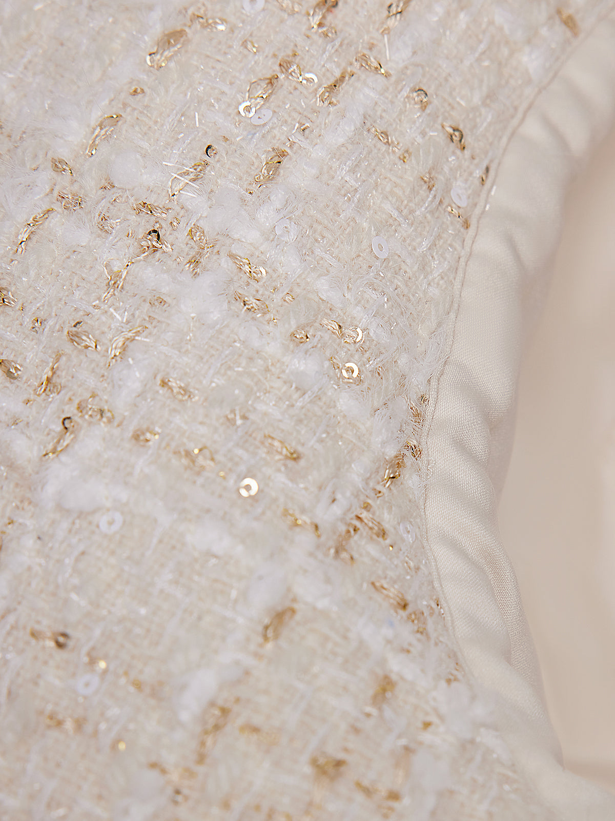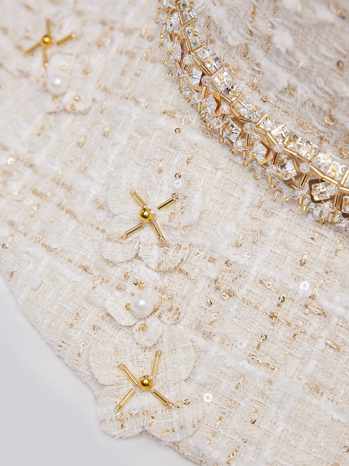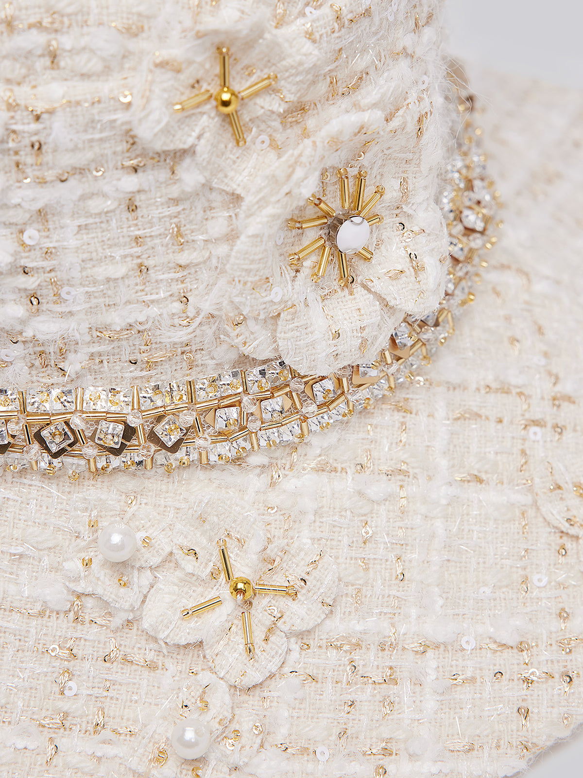 Beige tweed fabric interweaves fine yarns into a delicate check texture. Hand-beaded florals sit in layered clusters, blending seamlessly into the fabric. A round crown and short brim refine the silhouette, with a bead chain encircling the hat for a touch of opulence.