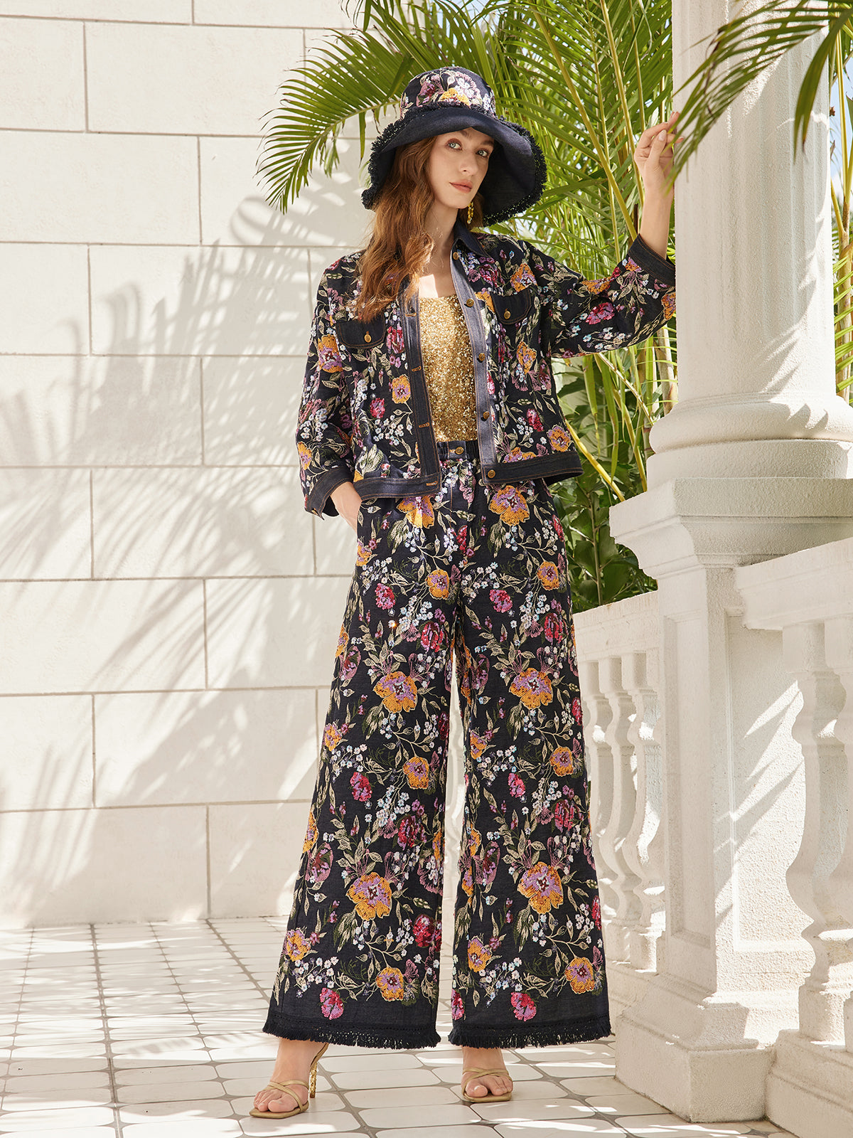 Hand-Beaded Floral Denim Raw-Edge Hat