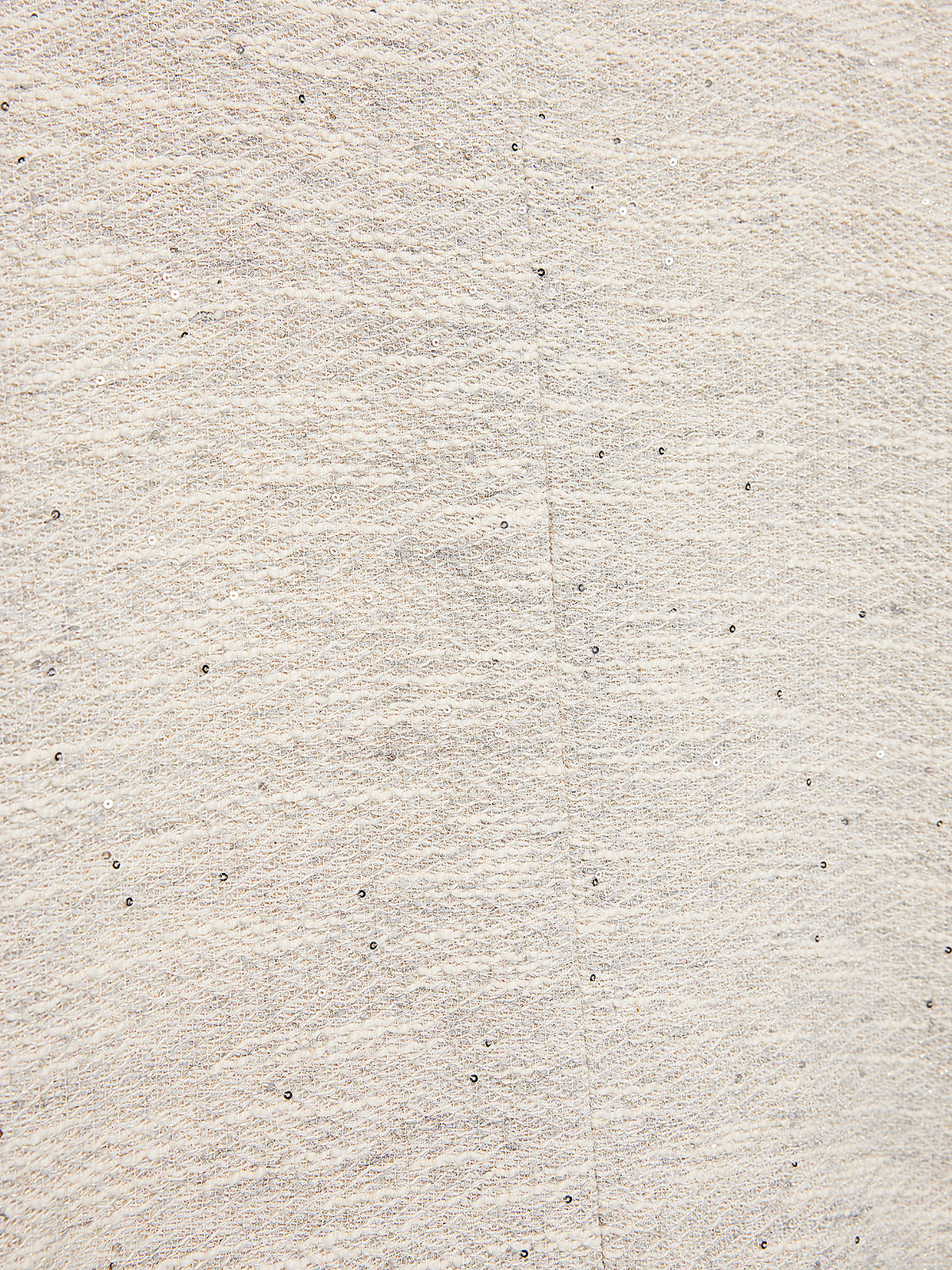 This jacket features a textured fabric lightly woven with subtle sequins for a refined shimmer. Hand-sewn pearls densely arranged along the collar and scattered diamond accents create a sense of opulent craftsmanship. The relaxed silhouette combines ease with elegance, while pearl-trimmed edges echo the collection’s signature detail.