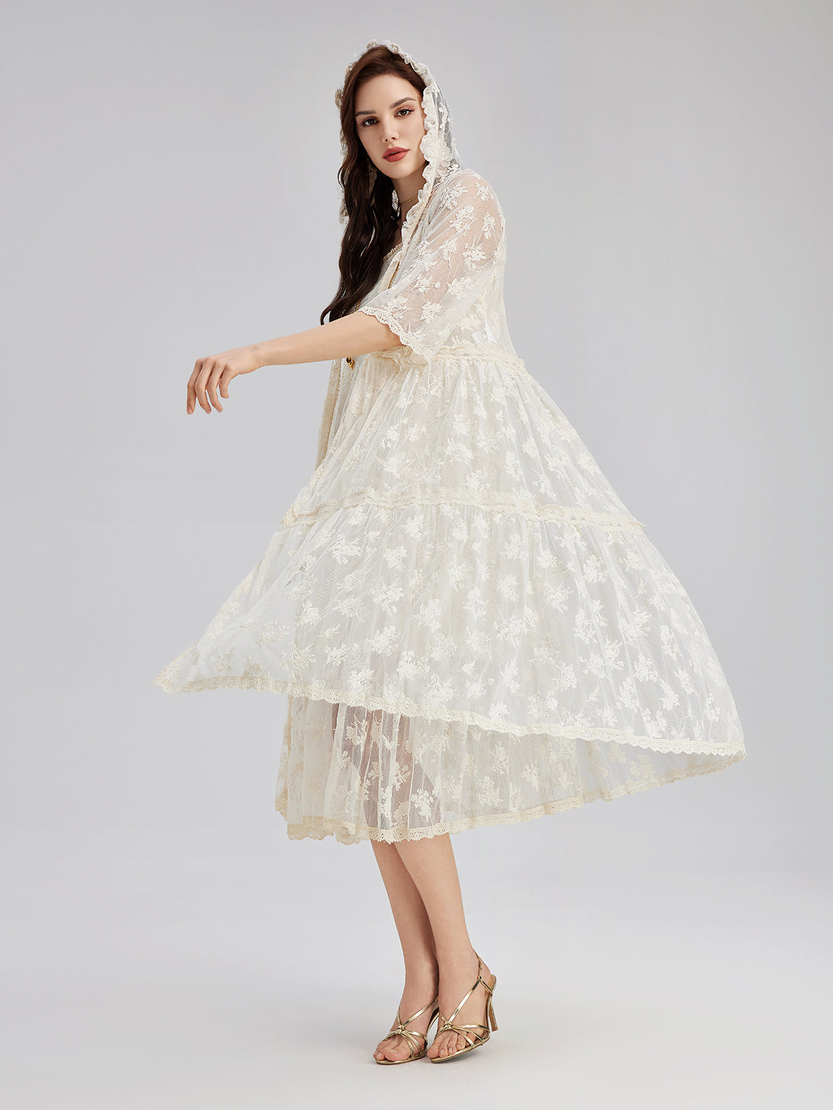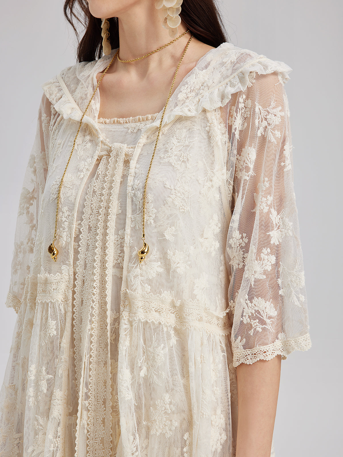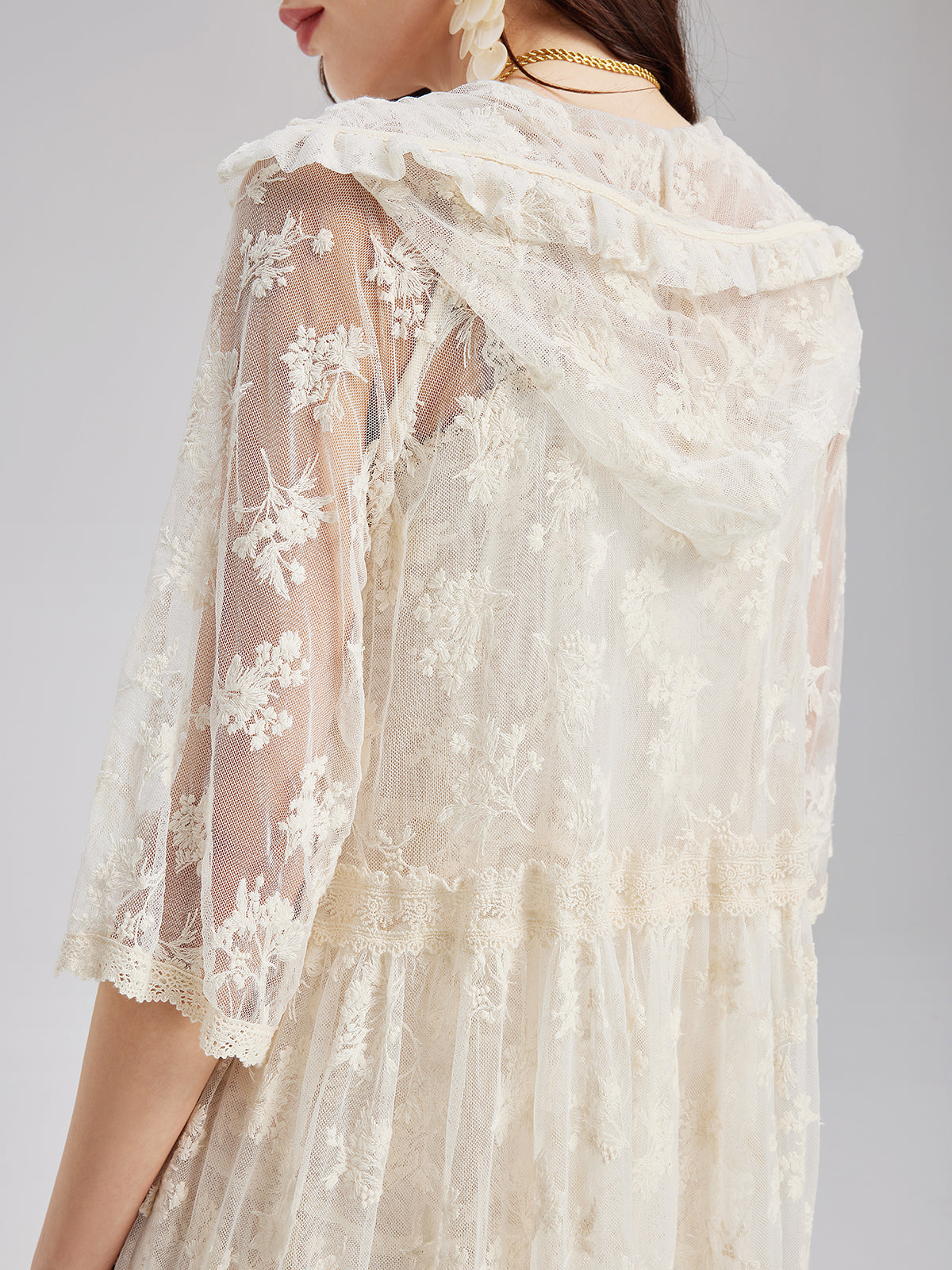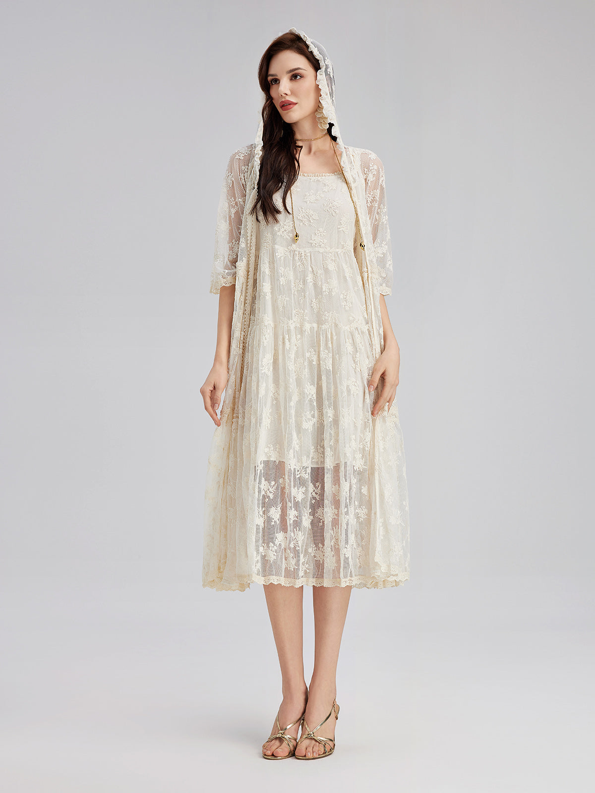 This elegant set includes a delicate lace slip dress and a matching hooded lace cape. Made from cotton with intricate embroidery and enhances feminine features. The light color scheme gives a fresh, coral feel, perfect for both at home and outings.