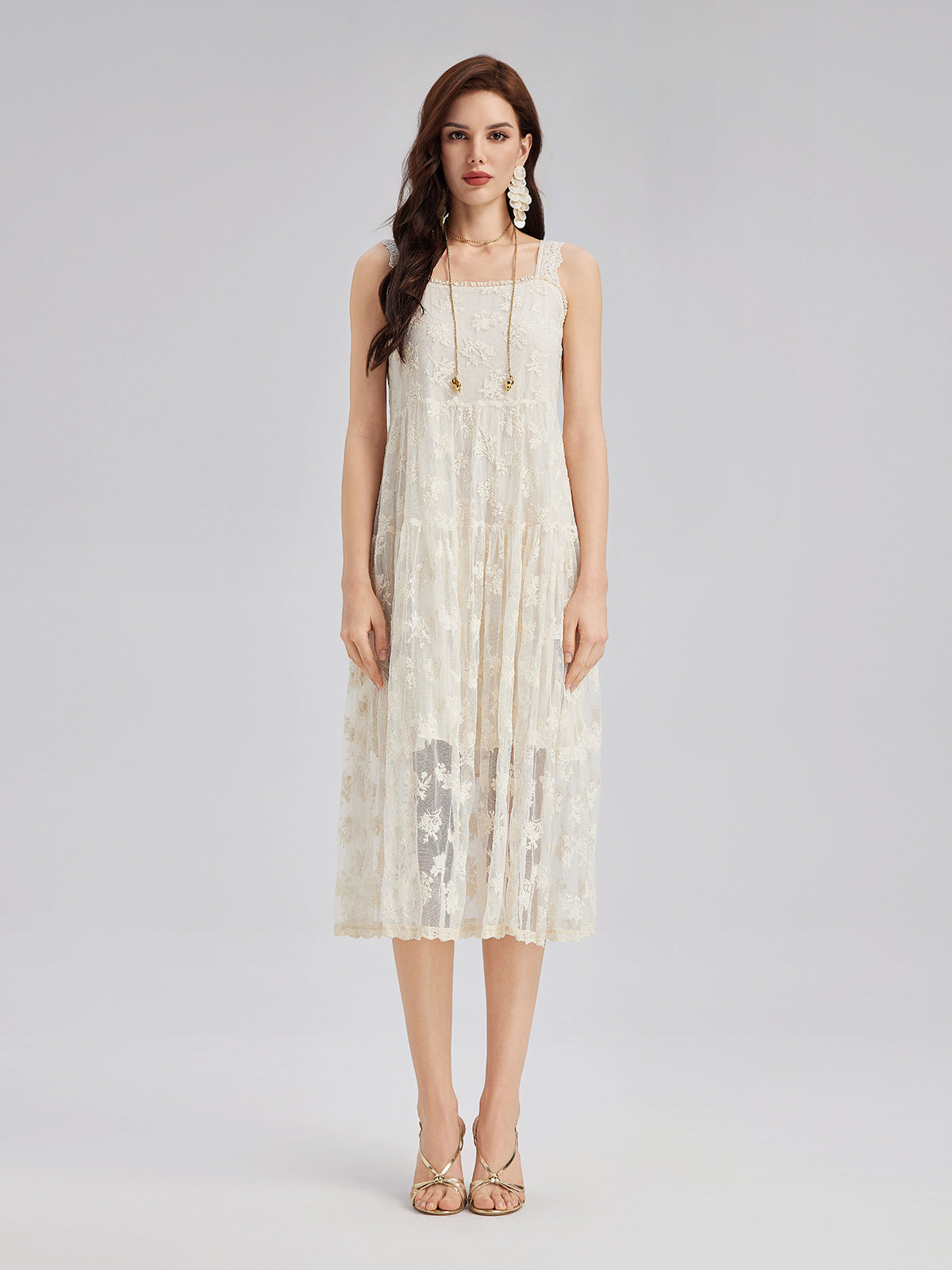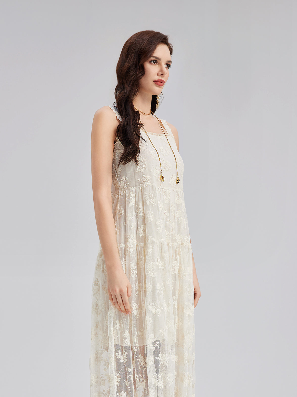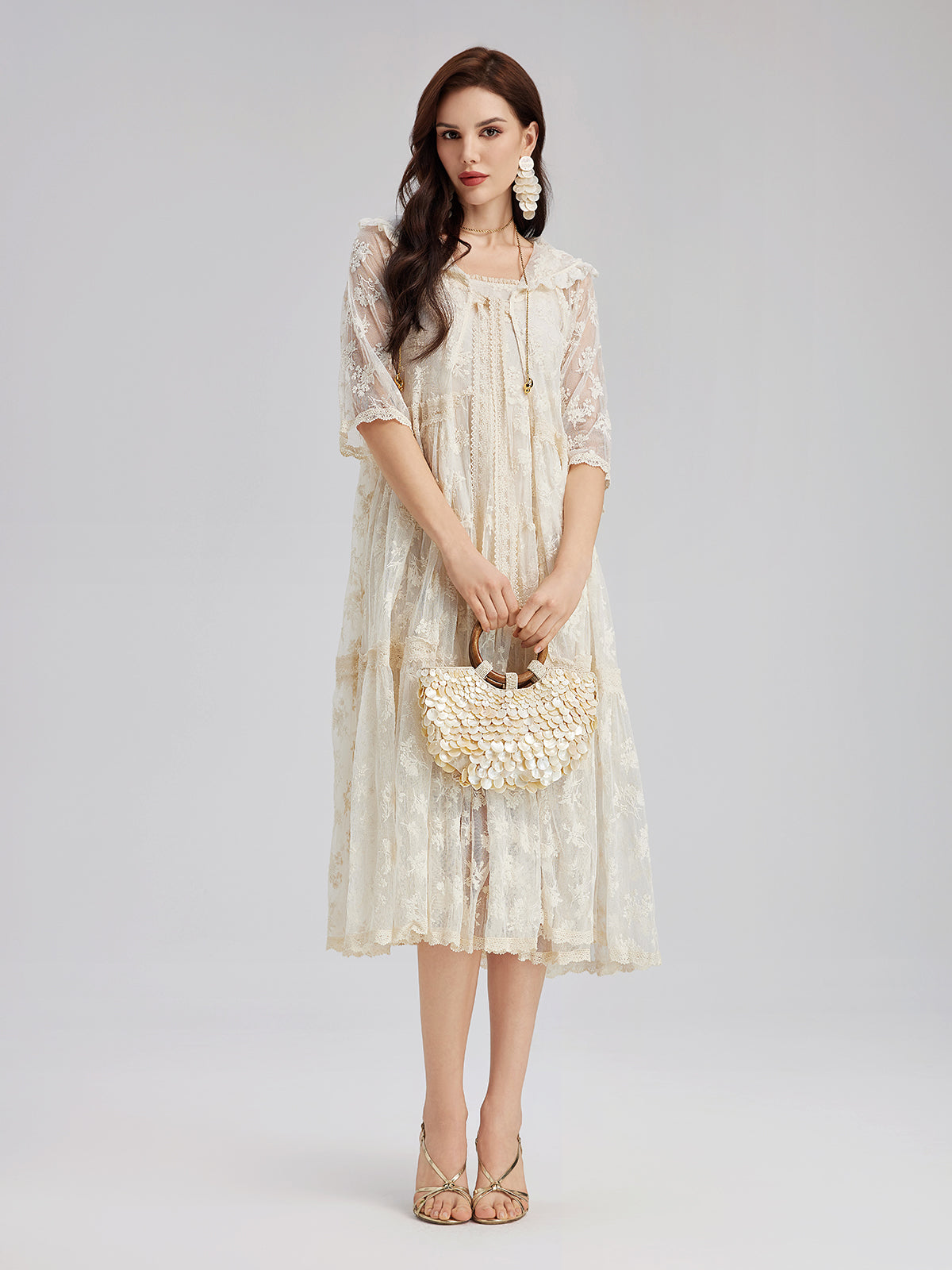 This elegant set includes a delicate lace slip dress and a matching hooded lace cape. Made from cotton with intricate embroidery and enhances feminine features. The light color scheme gives a fresh, coral feel, perfect for both at home and outings.