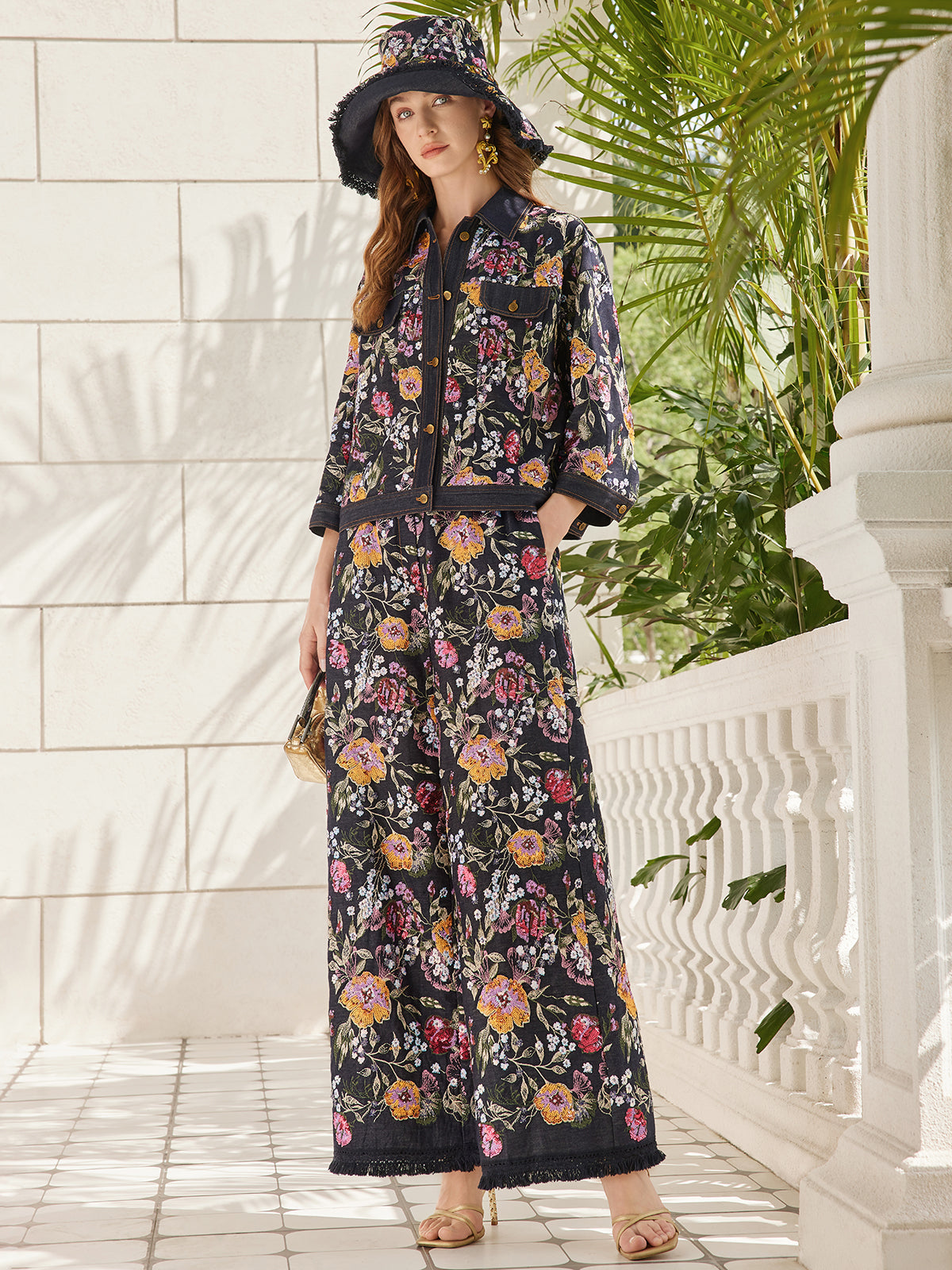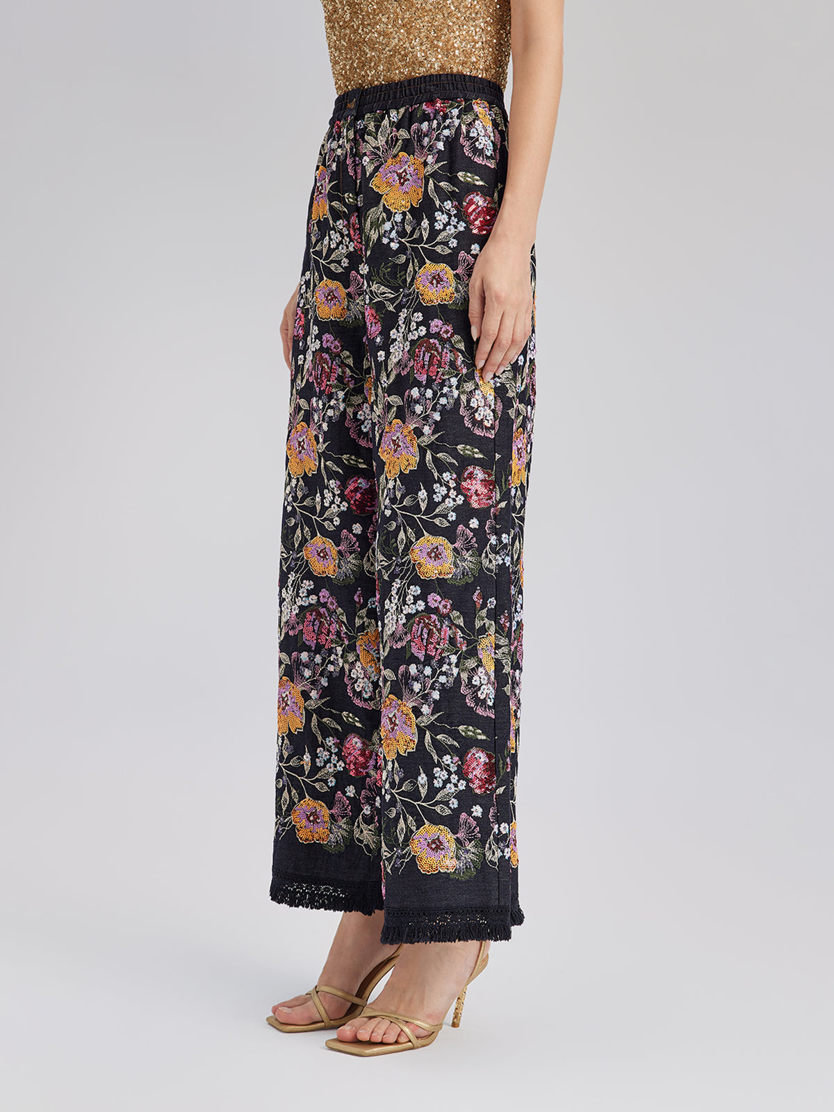 Denim overlays are enriched with embroidered florals in bright threads and dense sequins, bold and opulent. The straight-leg silhouette is clean and versatile, balancing wearability with flair. Raw fringes and tassels at the edges add a carefree touch, echoing the collection’s elegance.