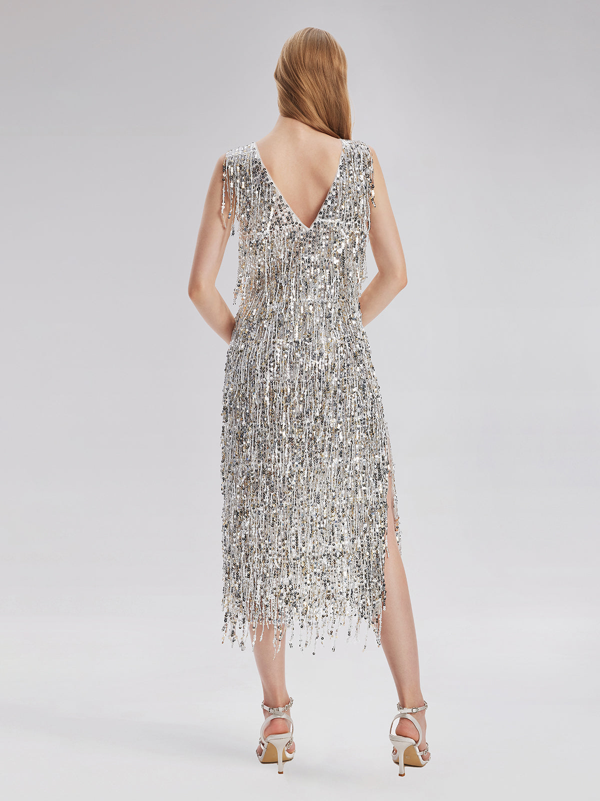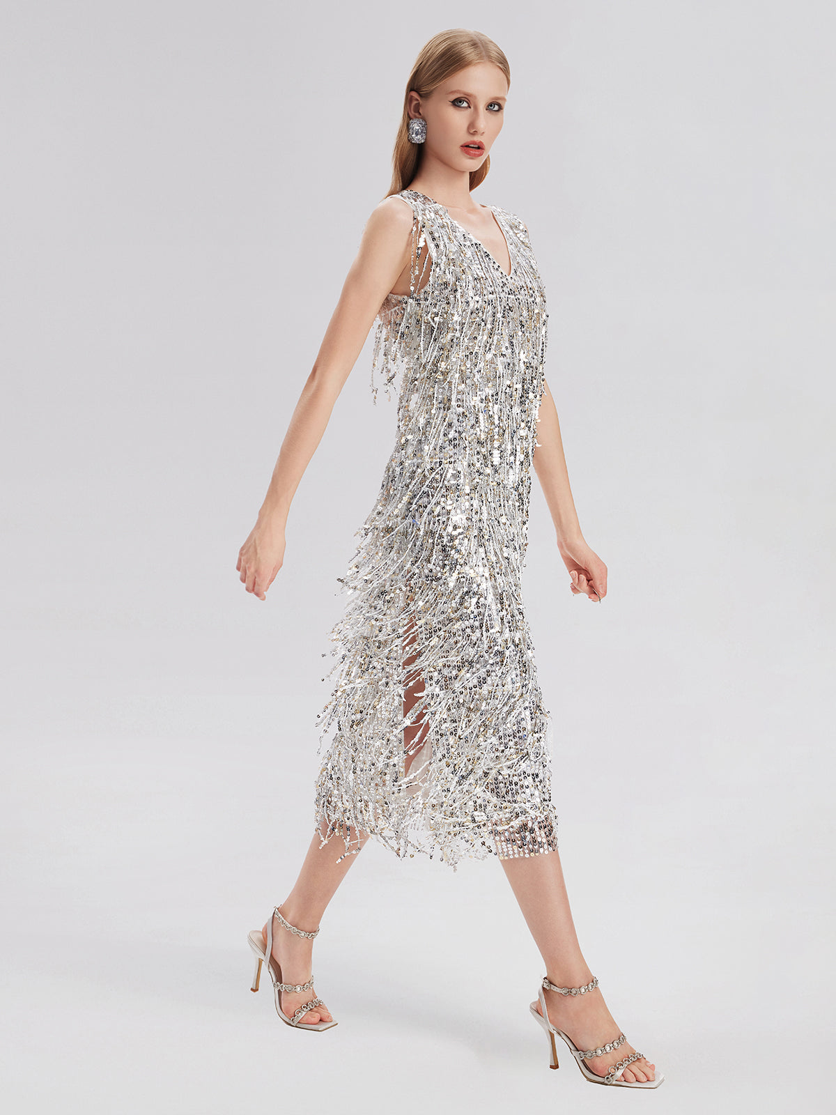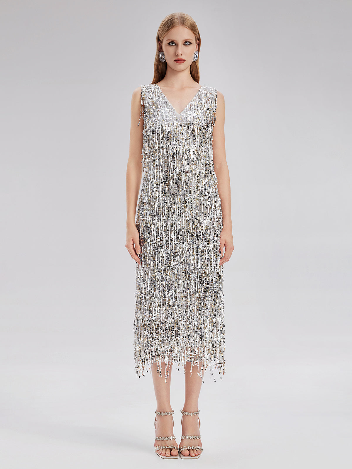 This dress is adorned with luxurious sequin embellishments that cover the entire garment, radiating brilliance and exuding grandeur. The tassel details add dynamic beauty and elegance. The deep V-neck design highlights the neckline and elongates the upper body. The fitted cut accentuates alluring curves, making it ideal for evening events and parties.