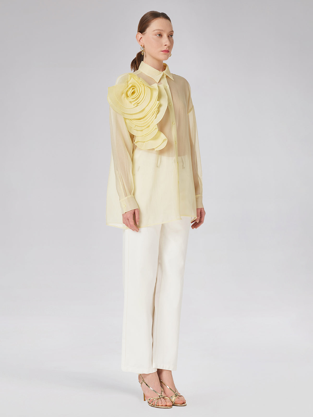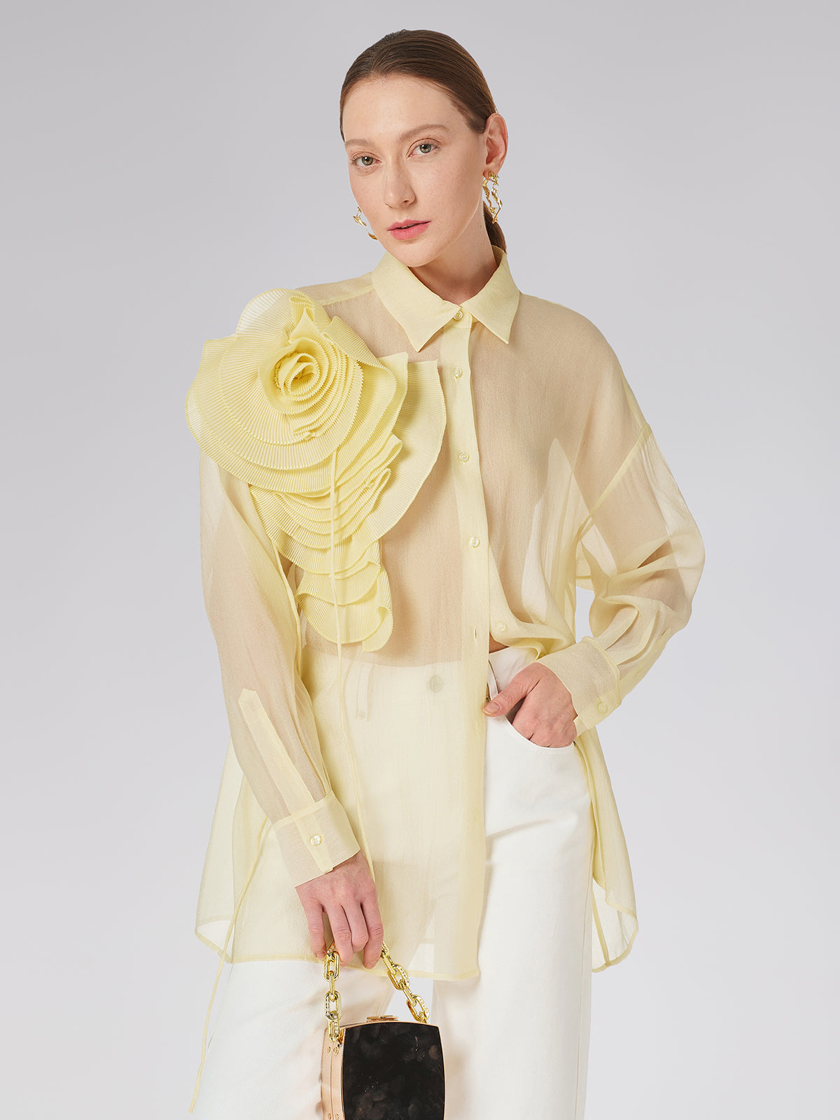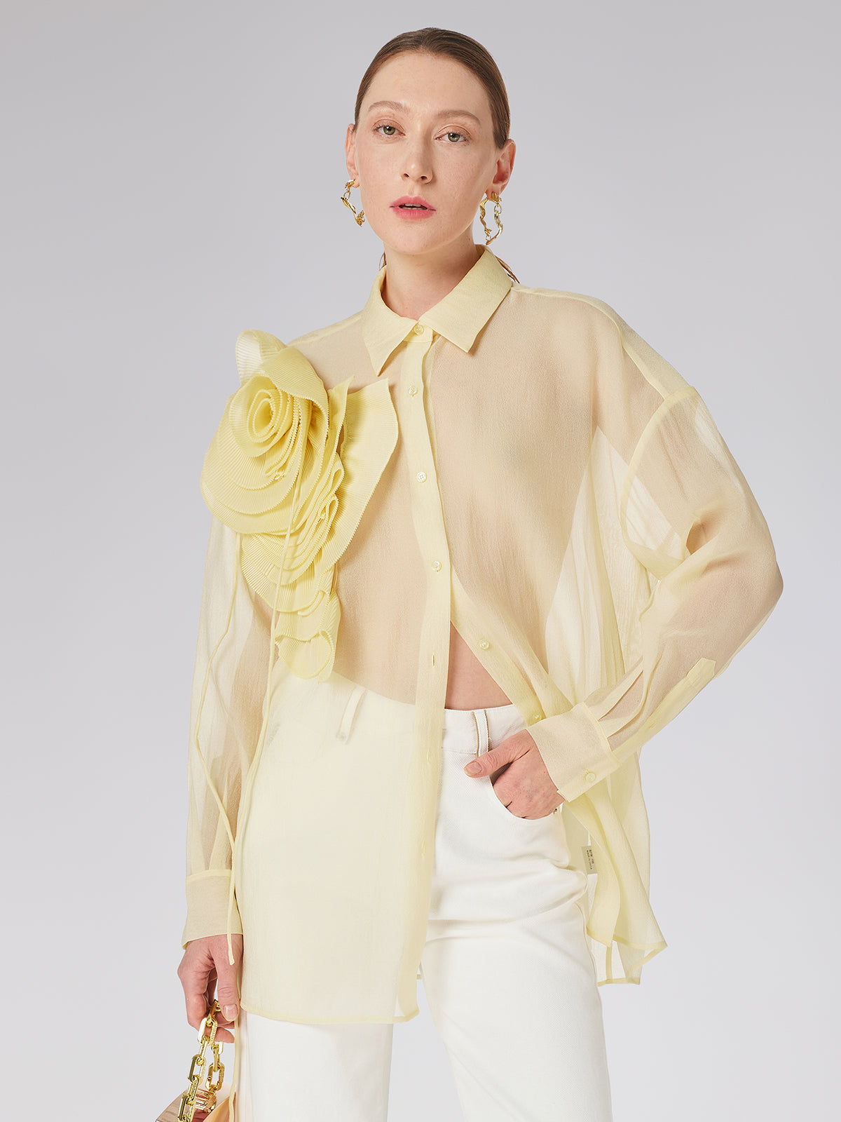 The transparent Acetate floral shirt is an exquisite and elegant fashion piece. Its lightweight, sheer Acetate fabric is adorned with three-dimensional floral patterns, creating a captivating effect. This shirt is simple yet refined, suitable for various occasions, whether it's everyday wear or special events, showcasing your elegant taste and unique charm.