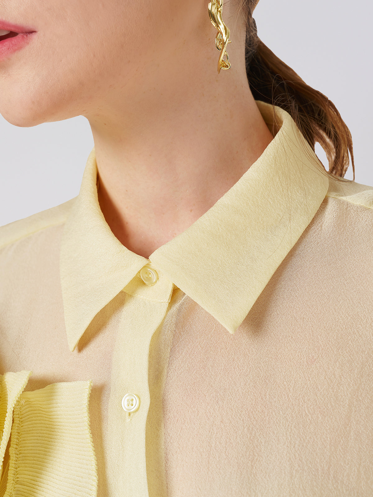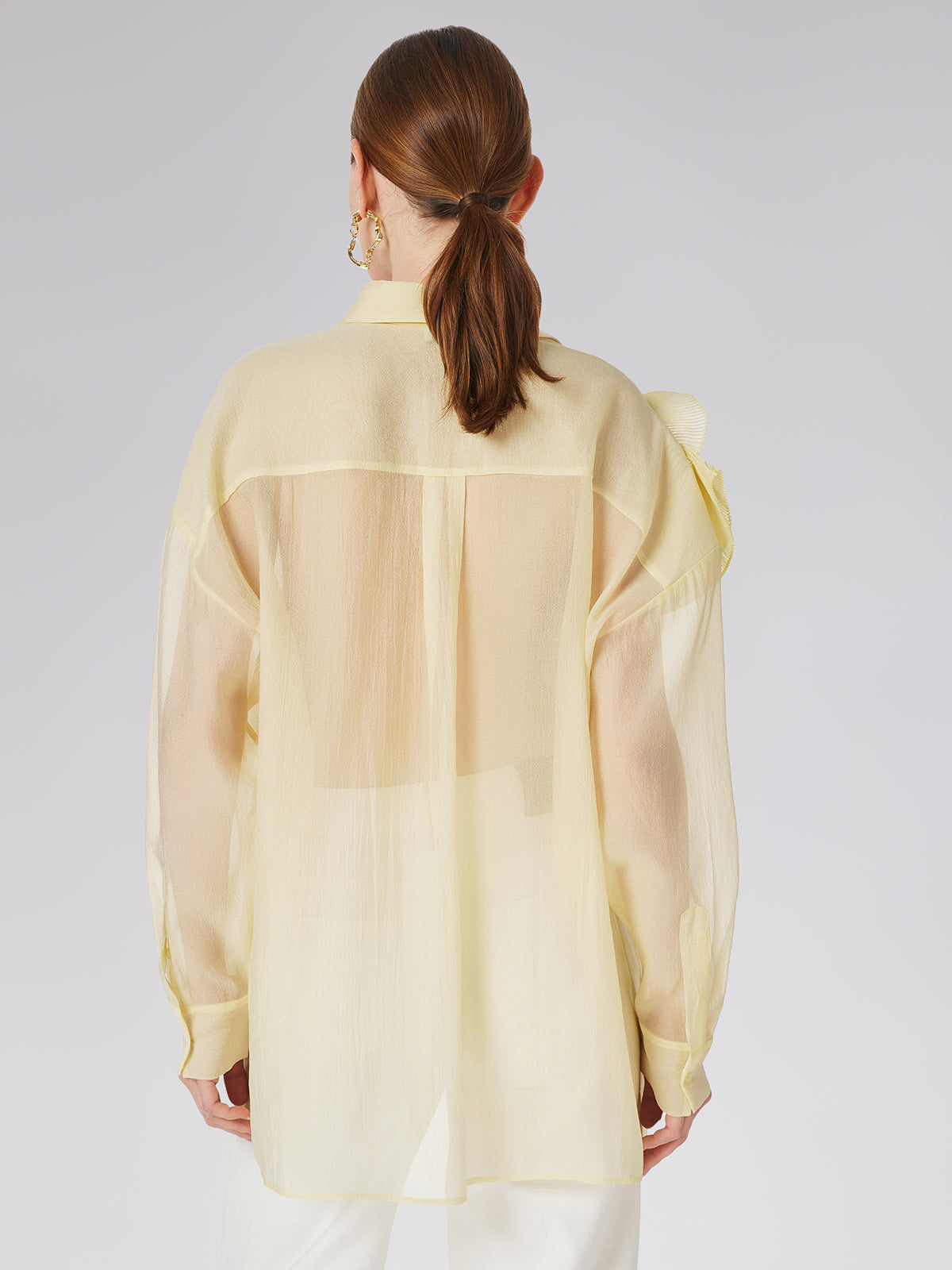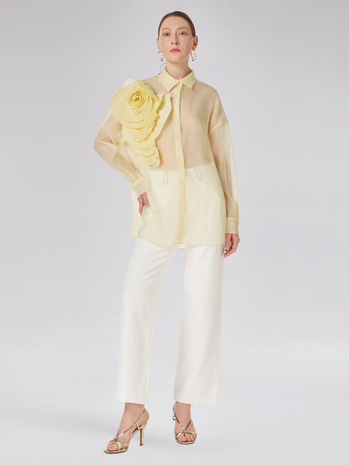 The transparent Acetate floral shirt is an exquisite and elegant fashion piece. Its lightweight, sheer Acetate fabric is adorned with three-dimensional floral patterns, creating a captivating effect. This shirt is simple yet refined, suitable for various occasions, whether it's everyday wear or special events, showcasing your elegant taste and unique charm.