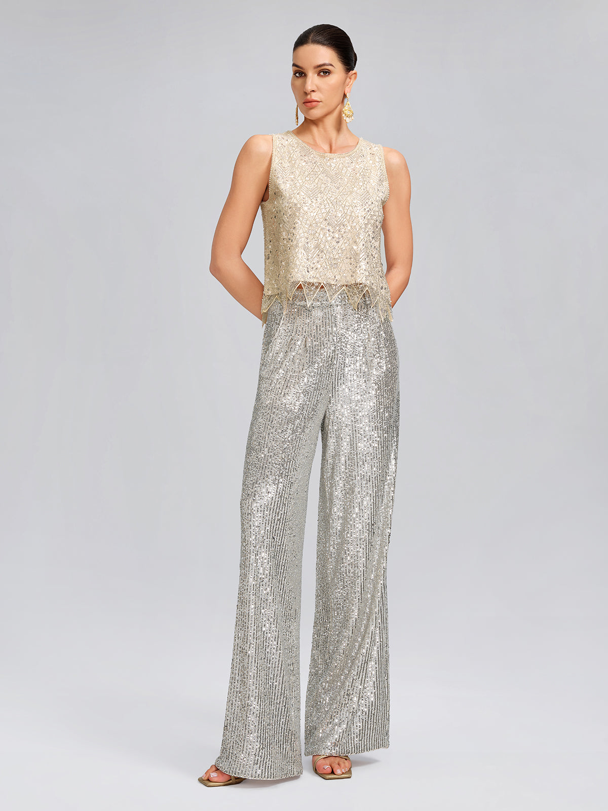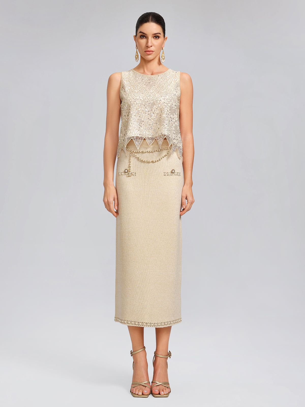 Striking triangular hem adds visual focus to a relaxed, inclusive silhouette. Hand-applied sequins and pearl beading create a luminous, elevated finish. Soft inner lining ensures comfortable wear, making it ideal for parties and refined daytime gatherings.