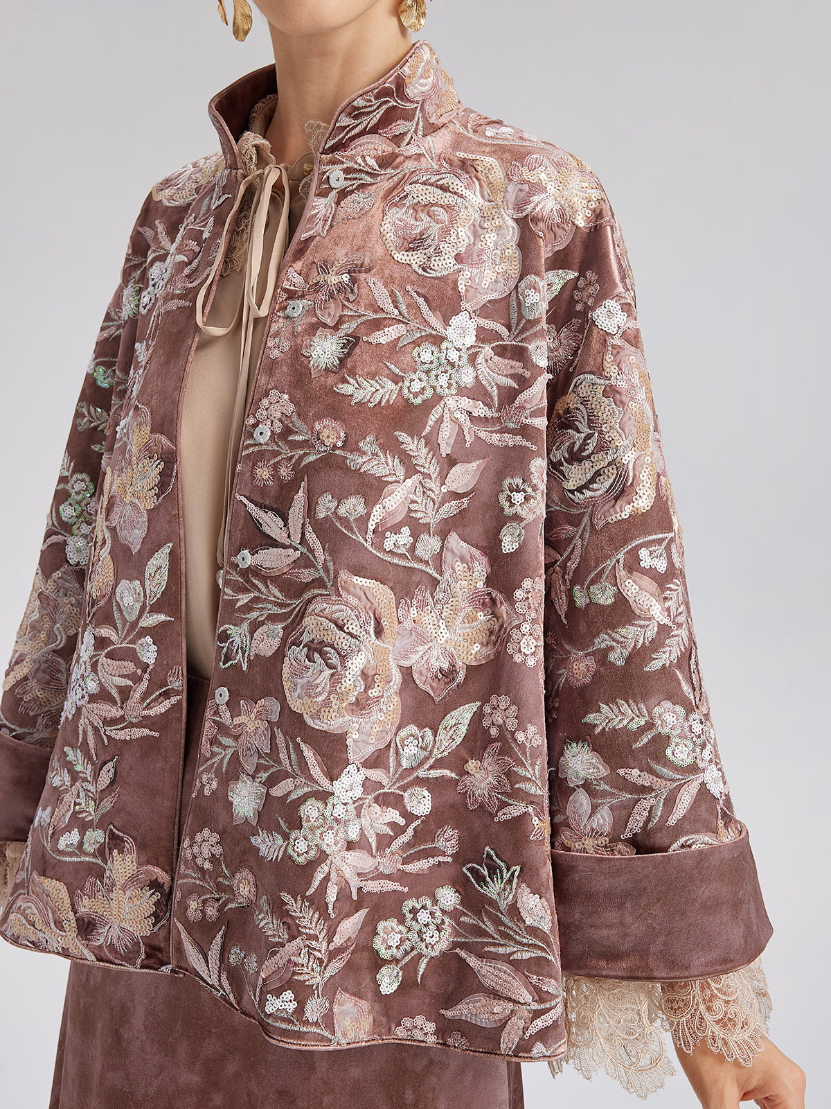 Rich brown velvet, soft and matte, exudes vintage luxury. Full-body 3D embroidery depicts roses and branching leaves, outlined in gradient threads with sequins for shimmer. Velvet’s softness contrasts with the intricate embroidery, creating "matte luxury × dynamic shine."