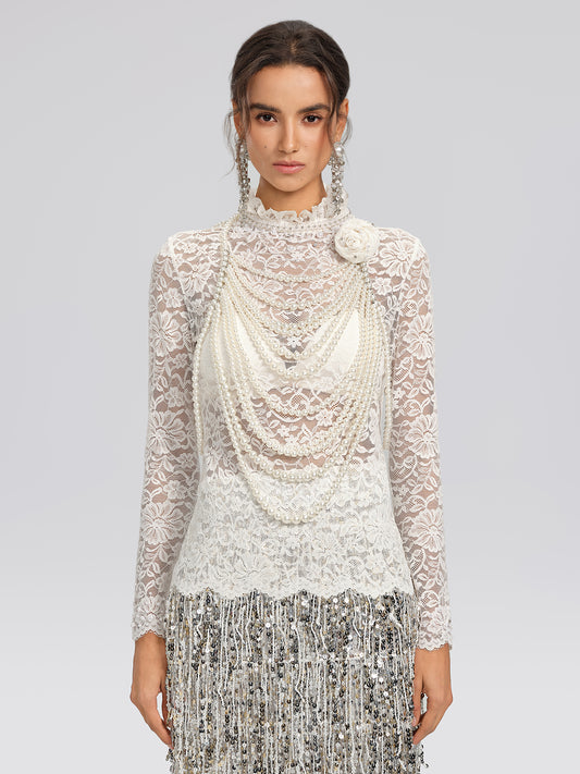 Lace Hand-Beaded Mock Neck Top (Detachable Flower Included)