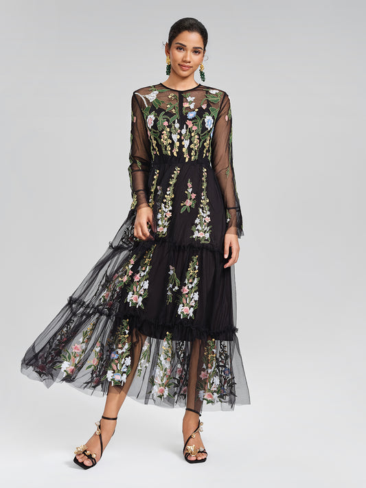 Floral Embroidered Tulle Sheer Maxi Dress