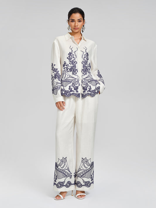 Linen Embroidered Sail Pattern Lapel Shirt