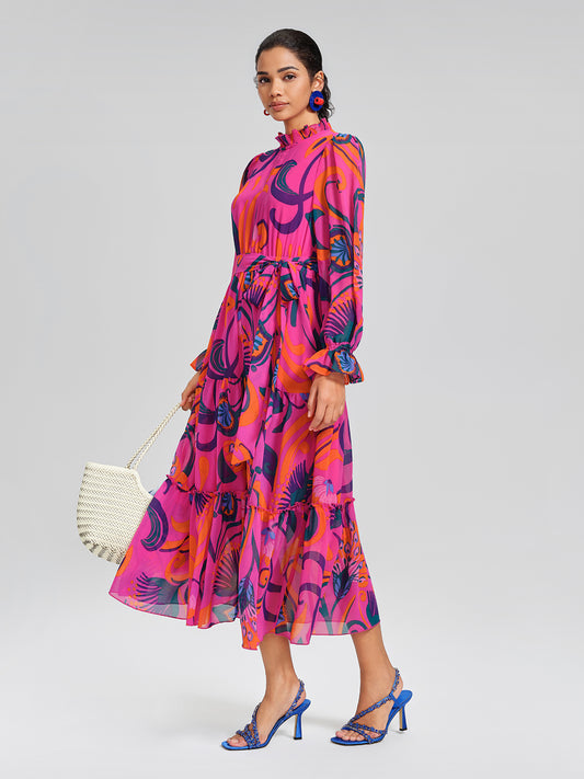 Printed Pleated Lantern Sleeve Dress