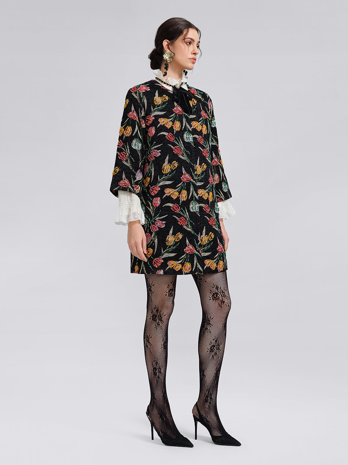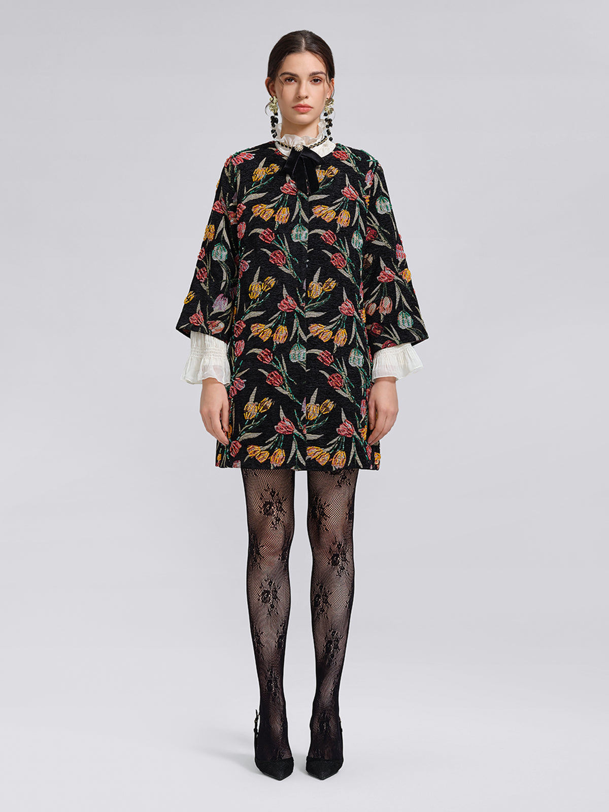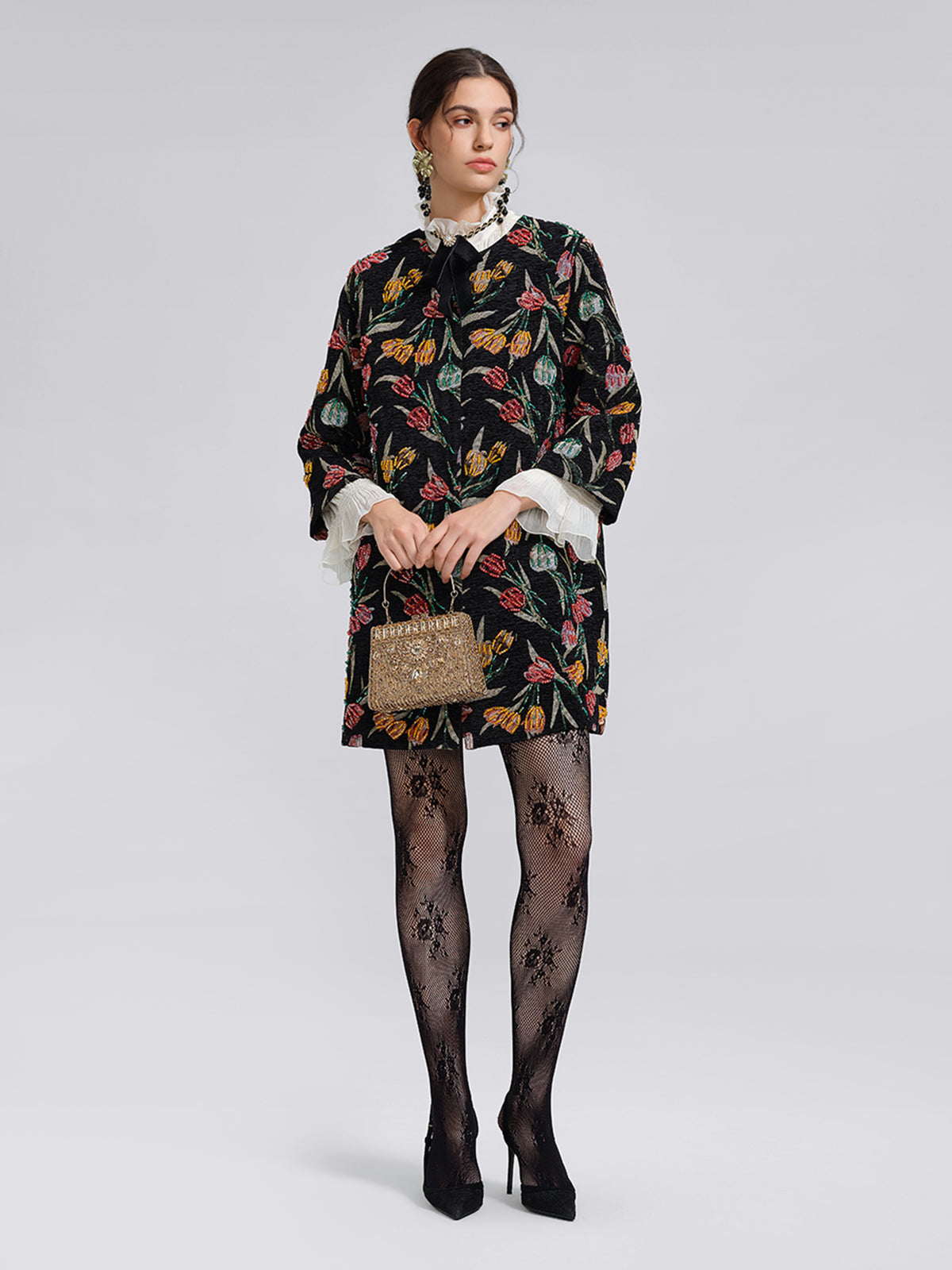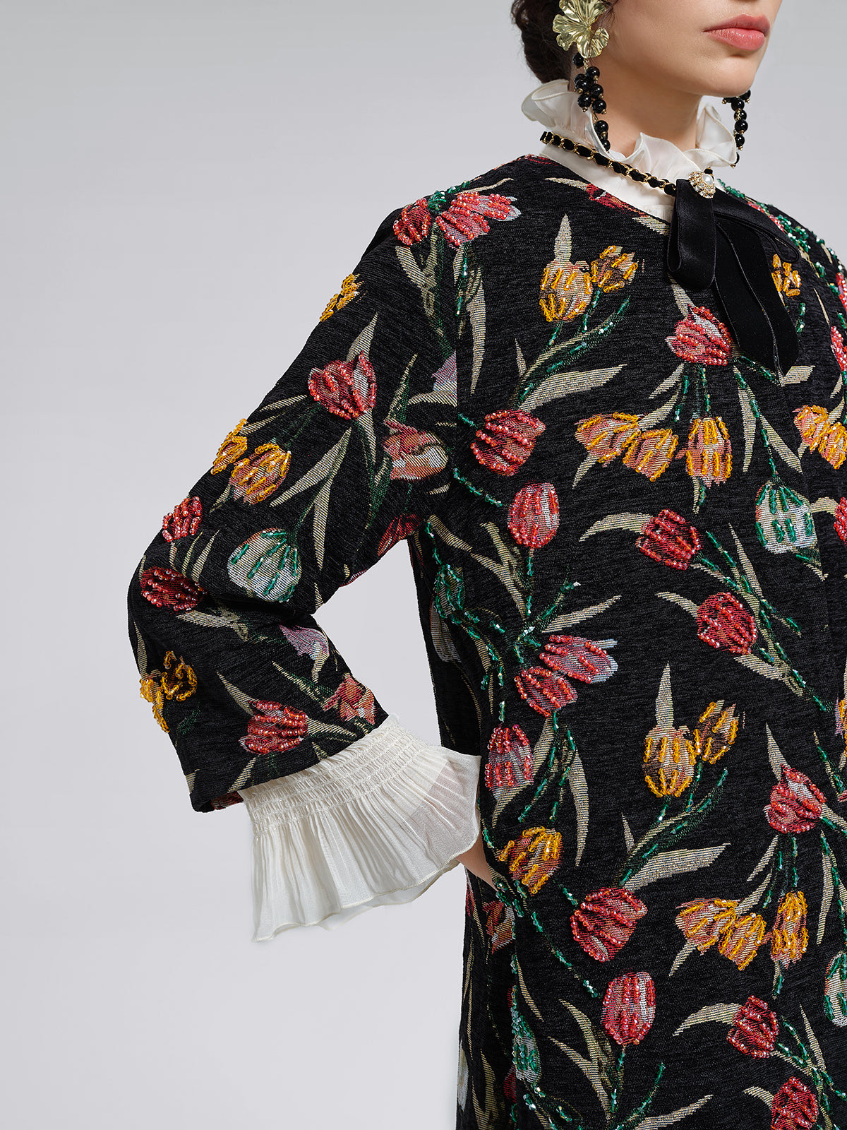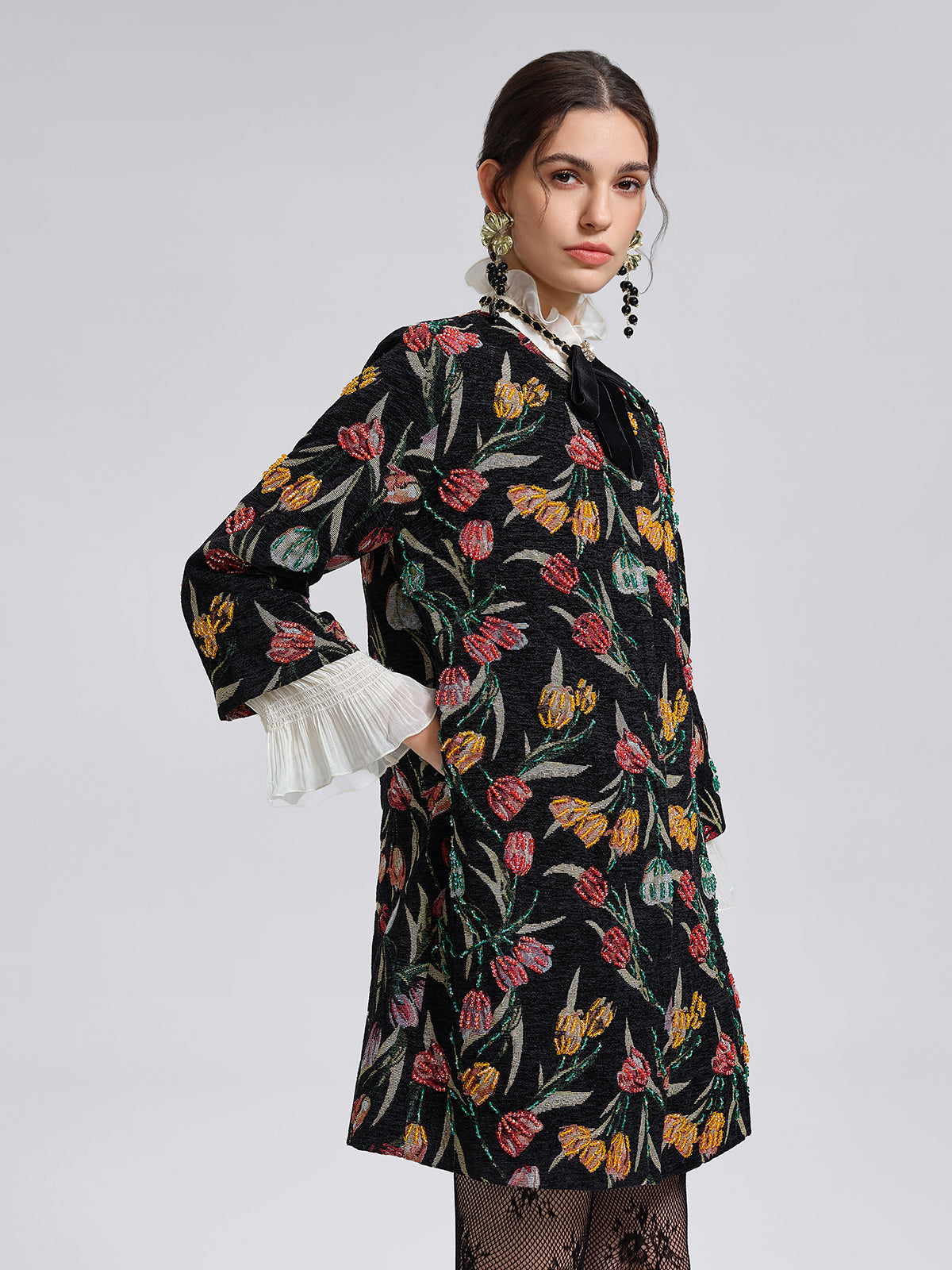 This relaxed H-line jacket is crafted from custom-colored fabric in expressive tones, enriched with fully hand-applied 3D beadwork. Every embellishment is individually stitched by skilled artisans, creating depth, texture, and a couture-level finish.