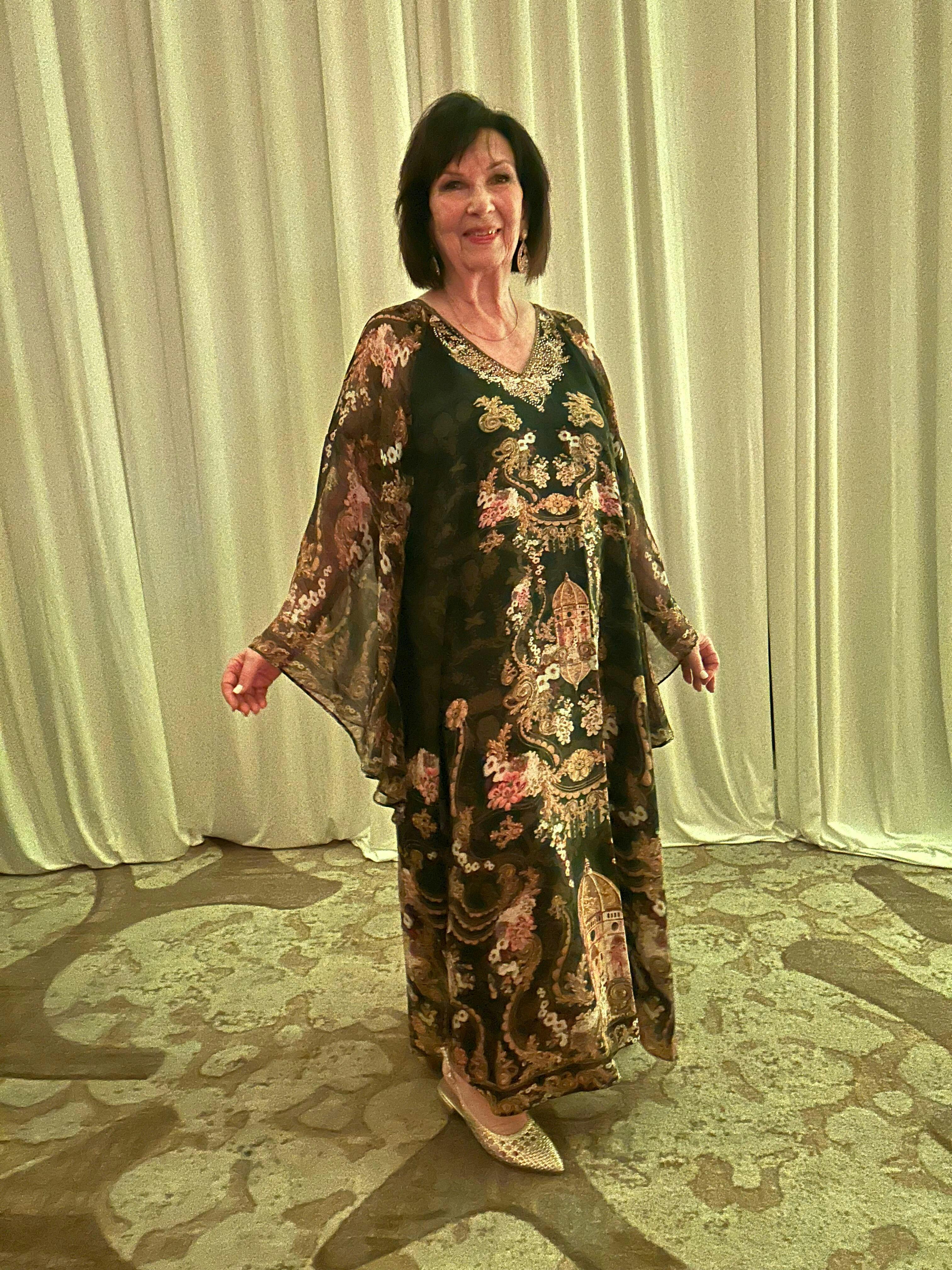 Made from high-quality Baroque-print silk, this dress is soft, breathable, and comfortable on the skin. The vivid, long-lasting print exudes luxury and elegance. The loose fit offers freedom of movement while flattering the figure, and the batwing sleeves elegantly conceal the arms.