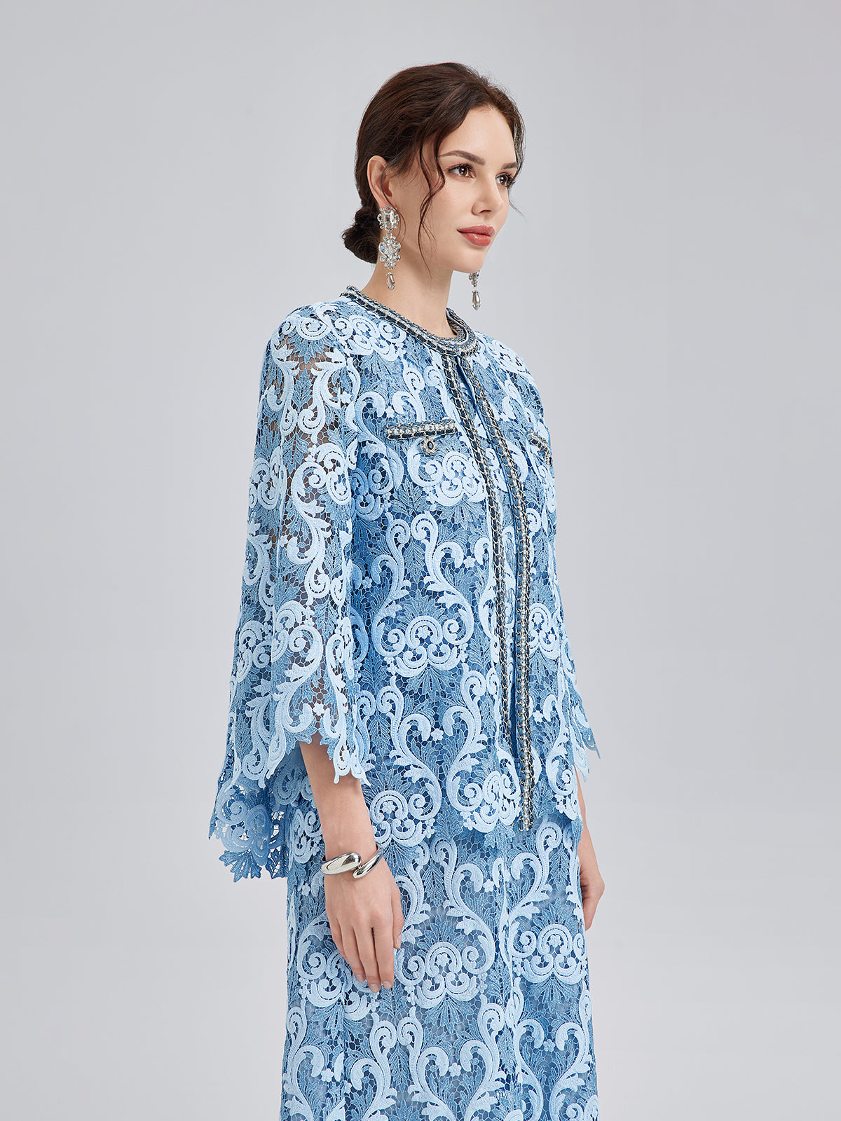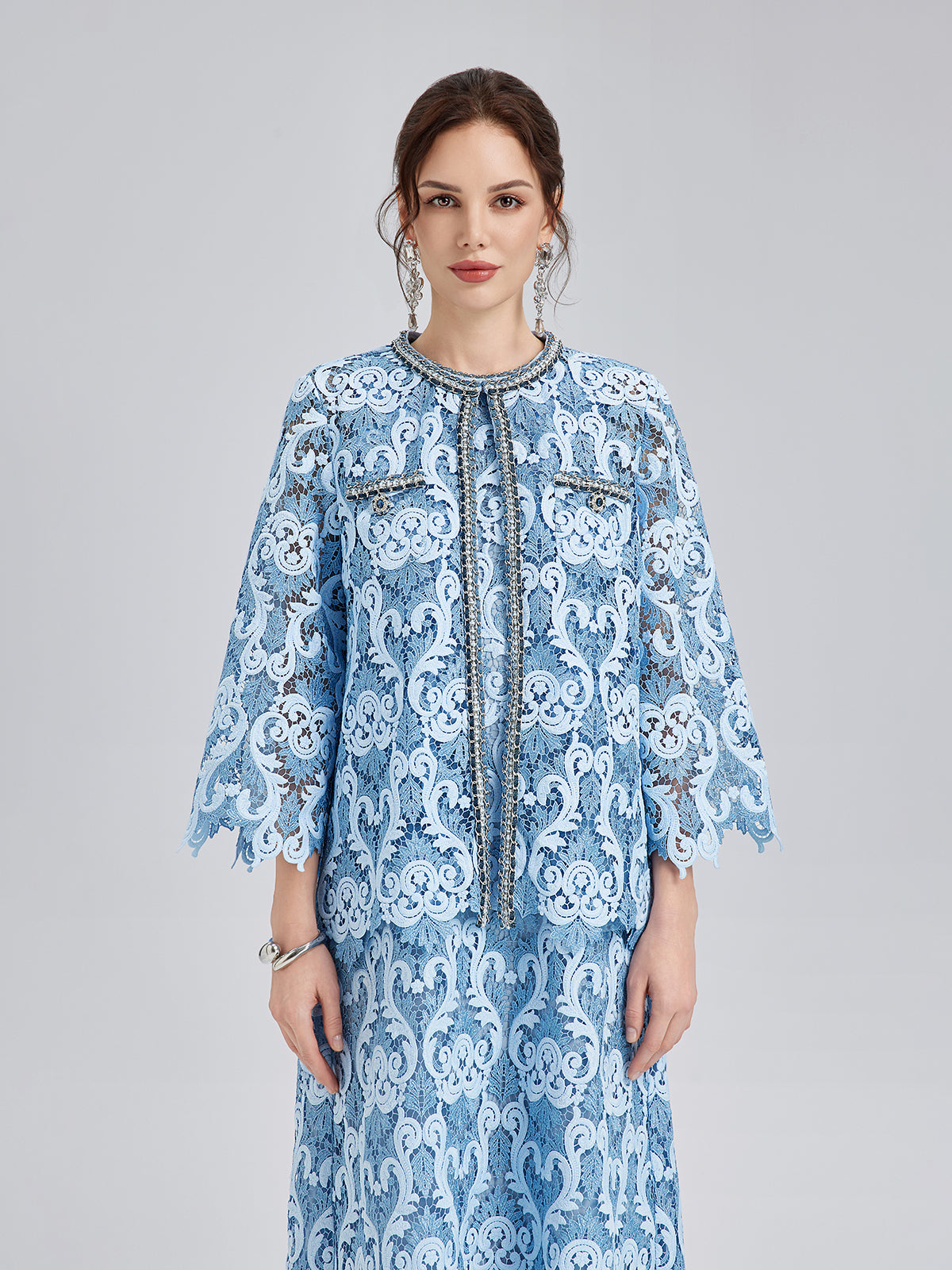 Made from high-density two-tone lace, this jacket holds a structured Baroque silhouette without collapsing. Custom shimmering trims on collar, placket, and pockets reflect light with movement. Vintage buttons are hand-sewn for durability. Relaxed fit flatters all shapes.