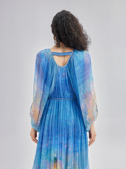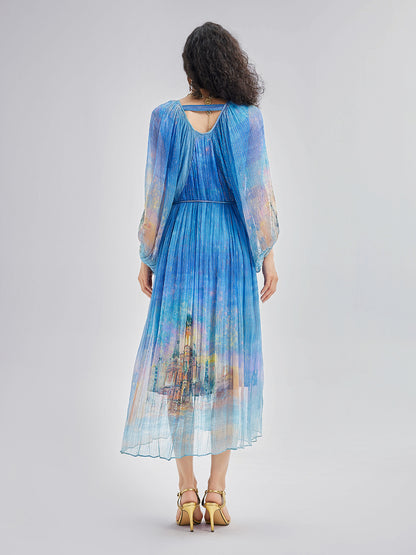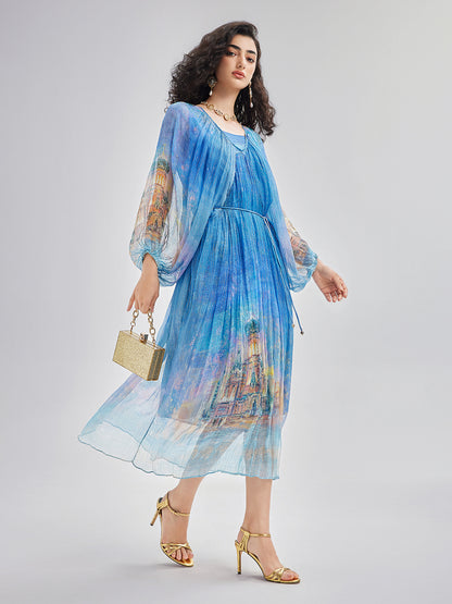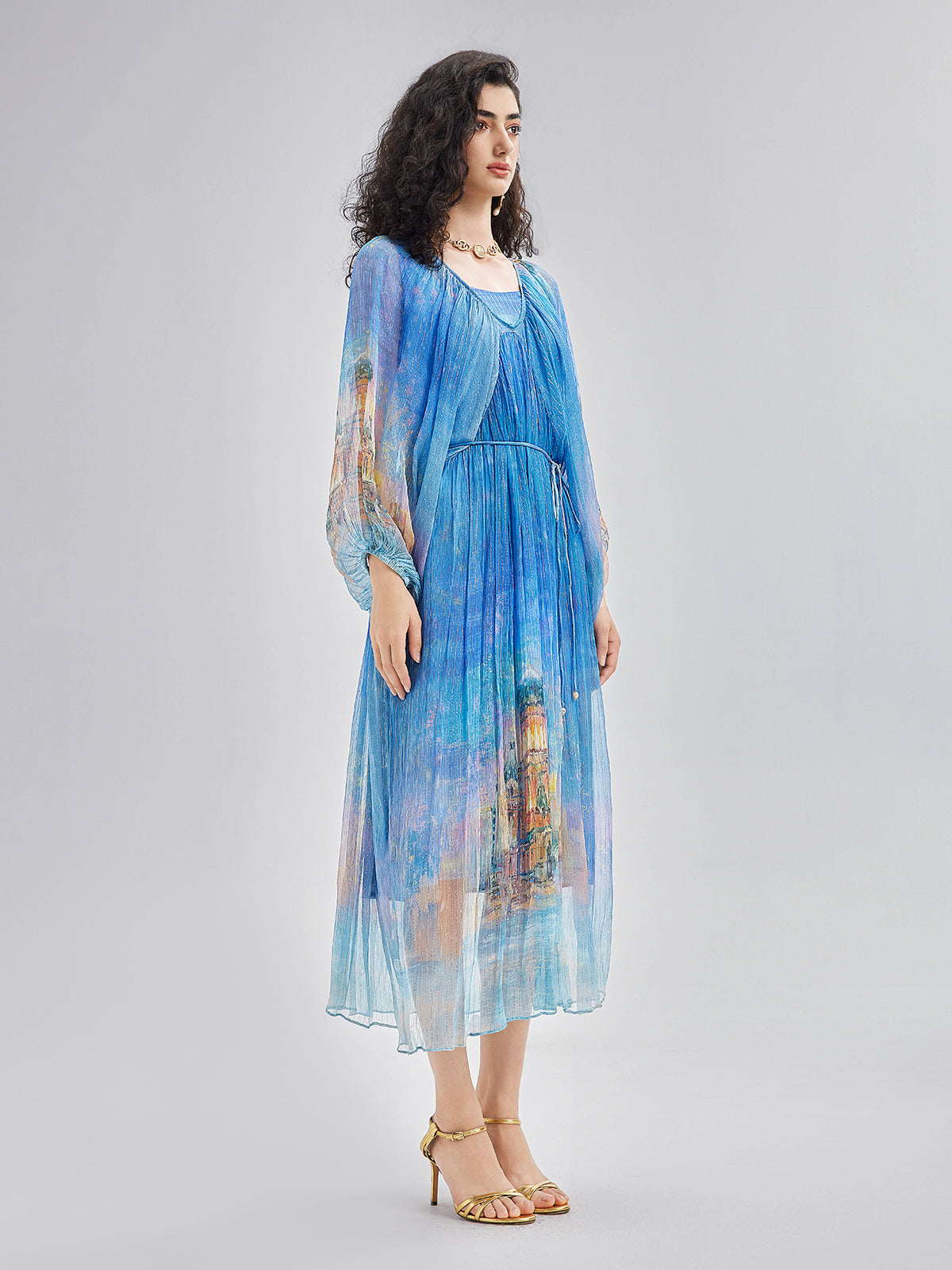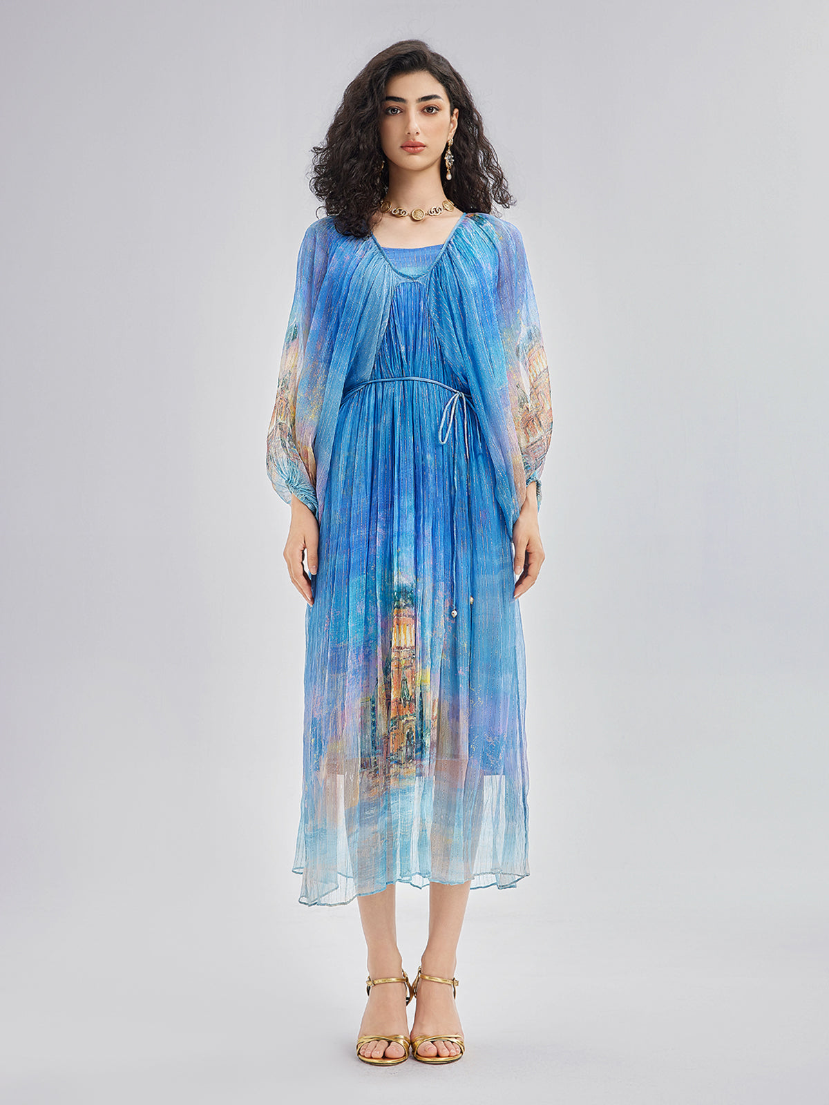 Made from high-quality double crepe silk with a lustrous, pearl-like sheen for a comfortable, skin-friendly feel. The loose fit flatters various body types. The adjustable waist tie allows for multiple styling options. The V-neckline elongates the neck, adding elegance.