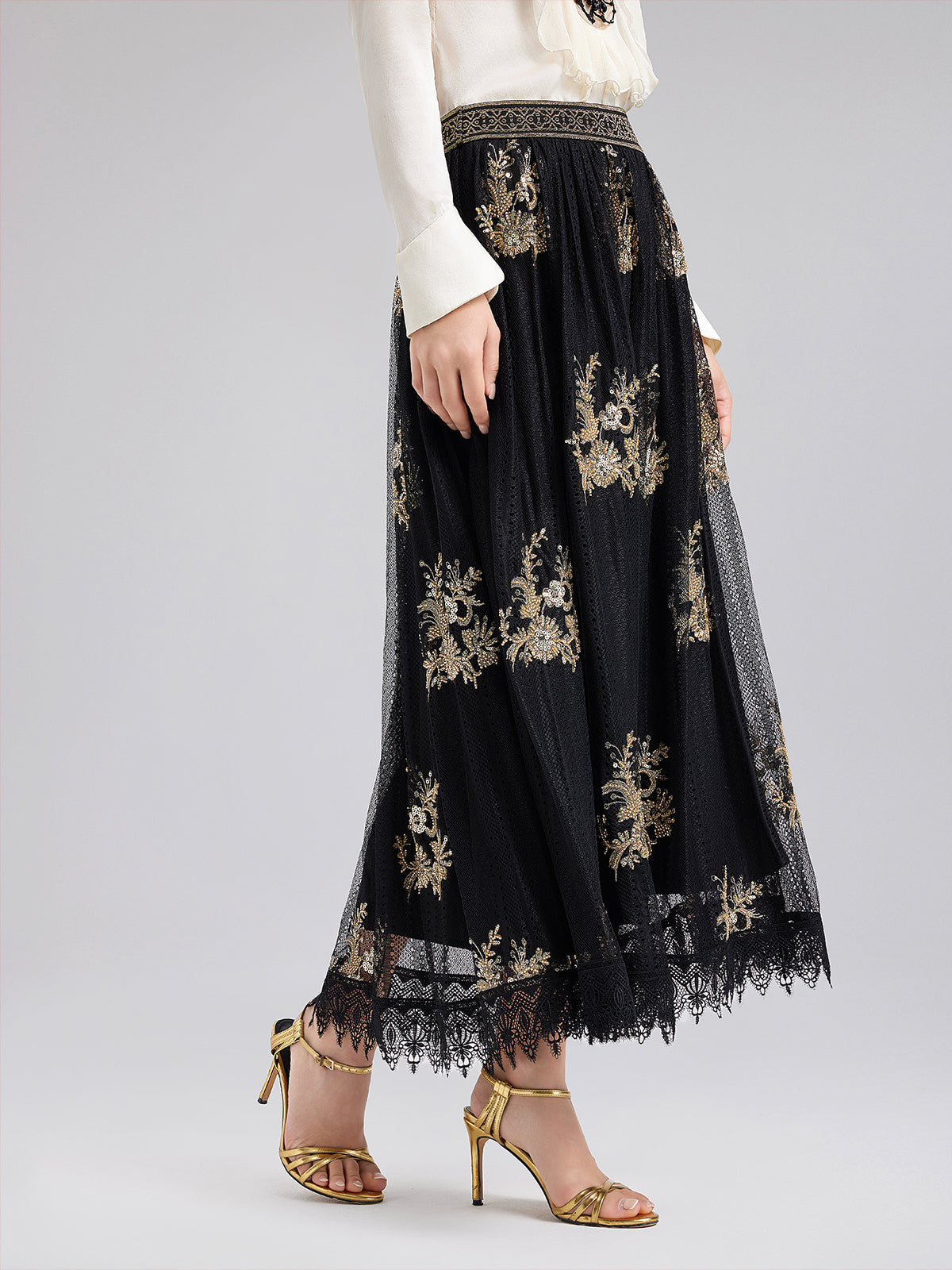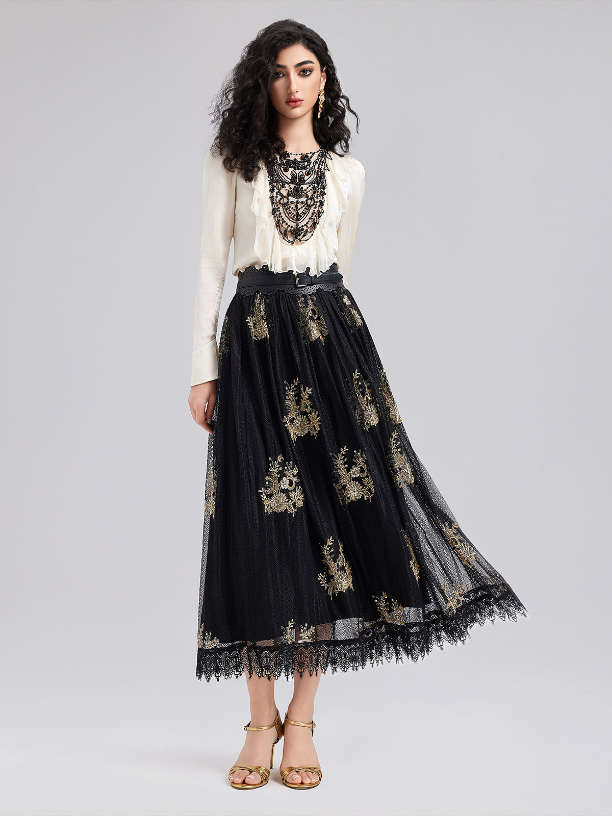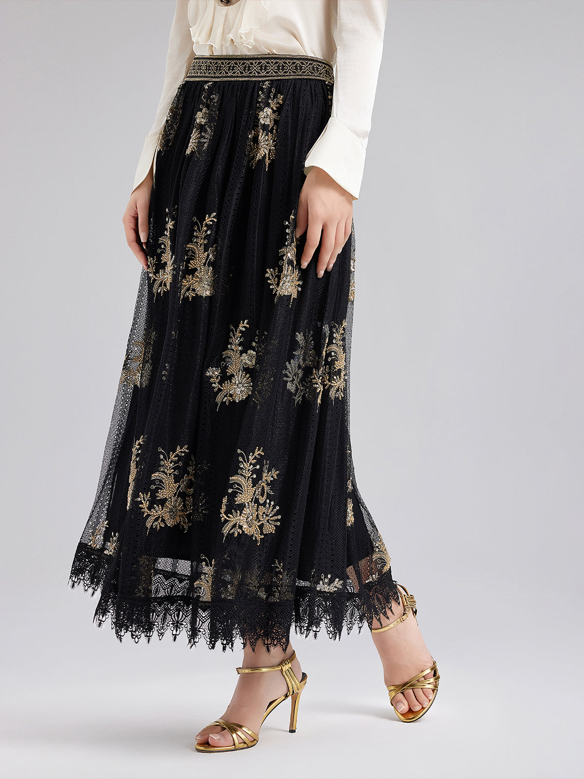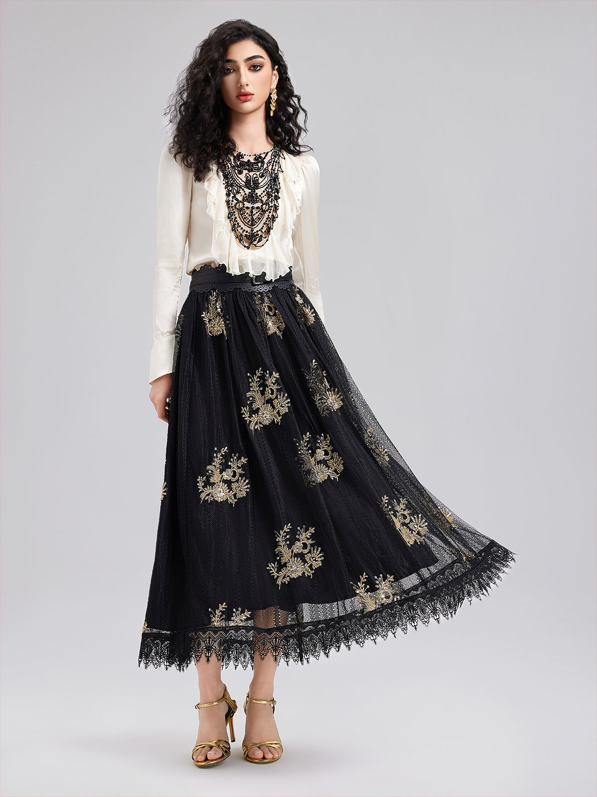 Crafted with intricate embroidery, this skirt showcases delicate, complex patterns that exude luxury and elegance. The airy mesh fabric ensures comfort and breathability, creating an enchanting, romantic look perfect for any occasion.