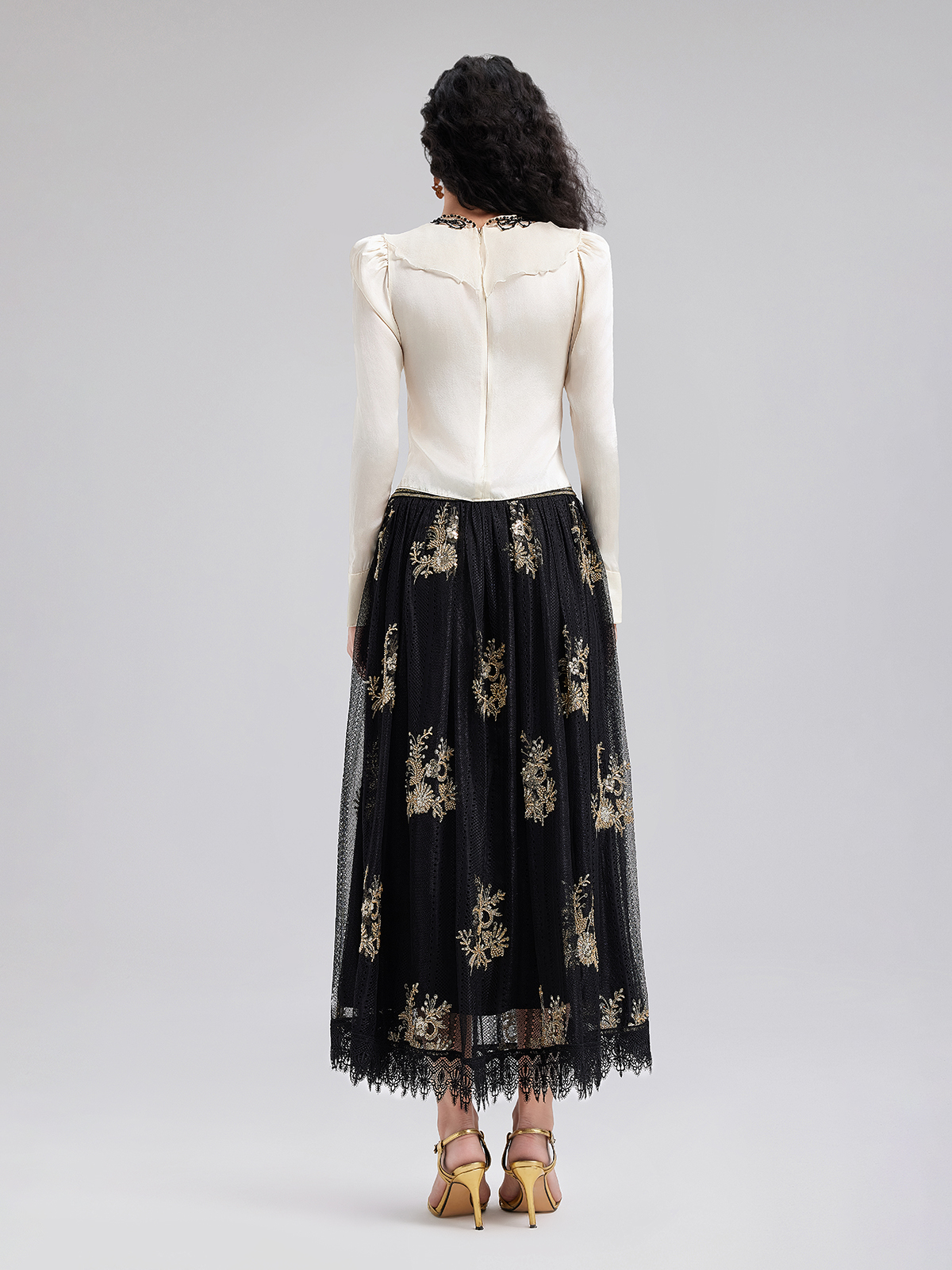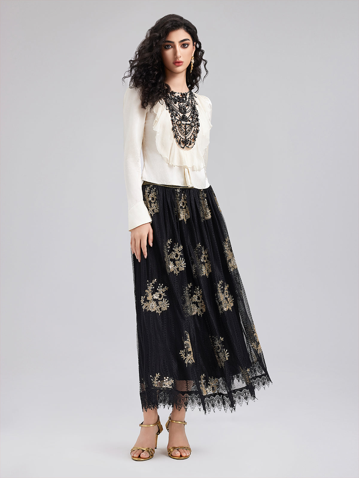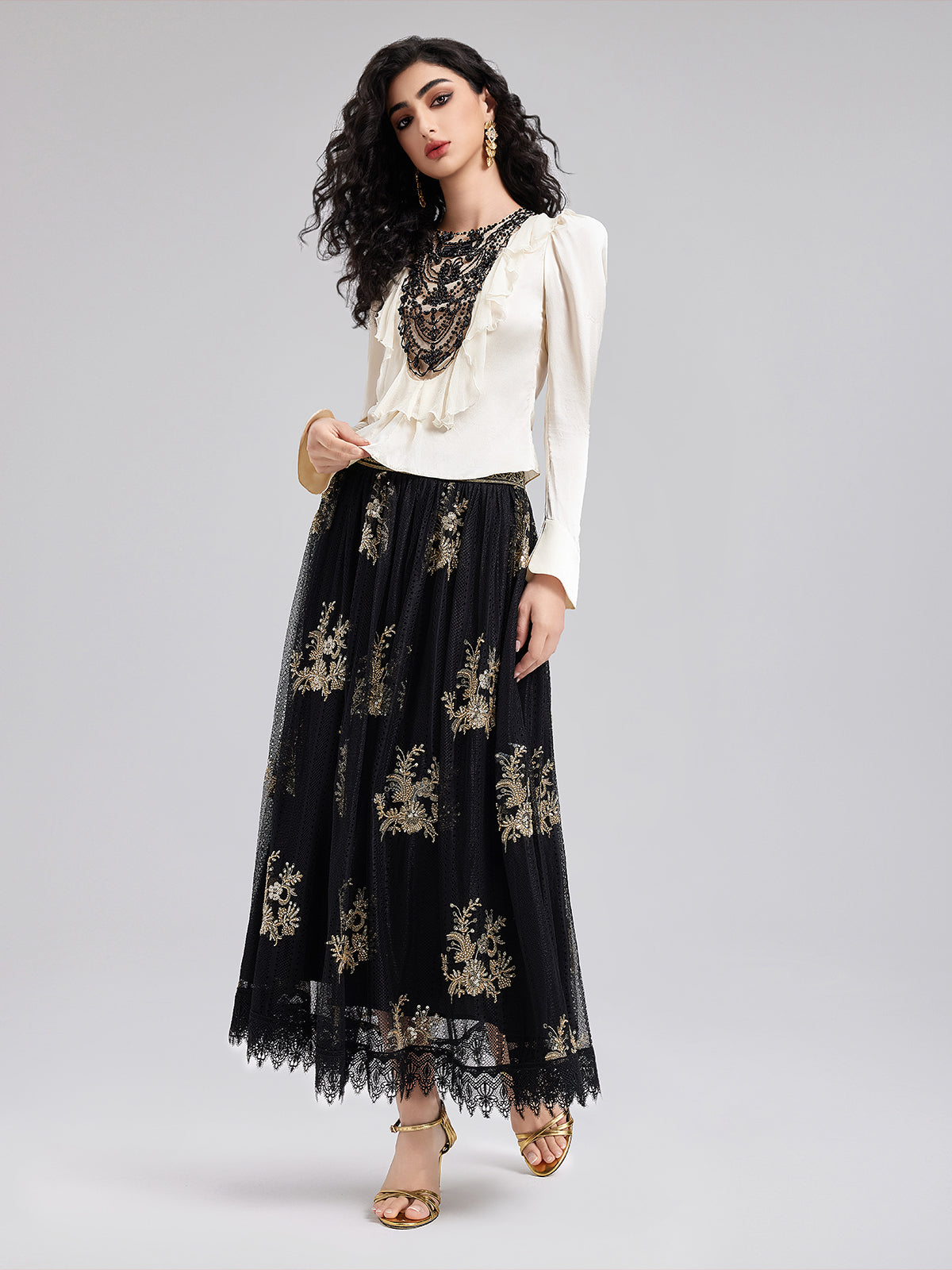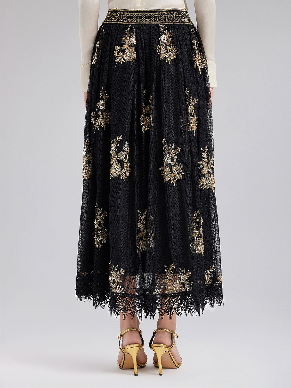 Crafted with intricate embroidery, this skirt showcases delicate, complex patterns that exude luxury and elegance. The airy mesh fabric ensures comfort and breathability, creating an enchanting, romantic look perfect for any occasion.