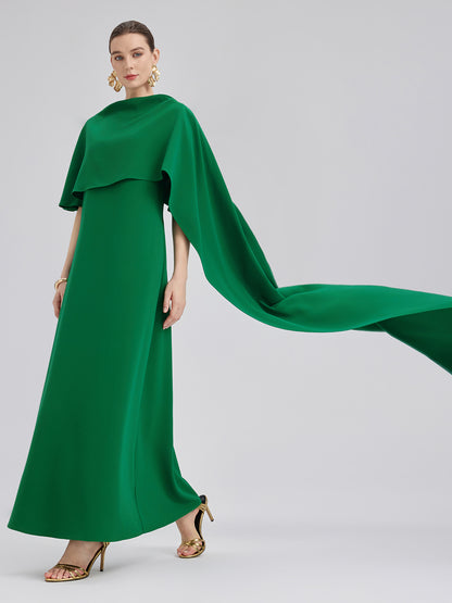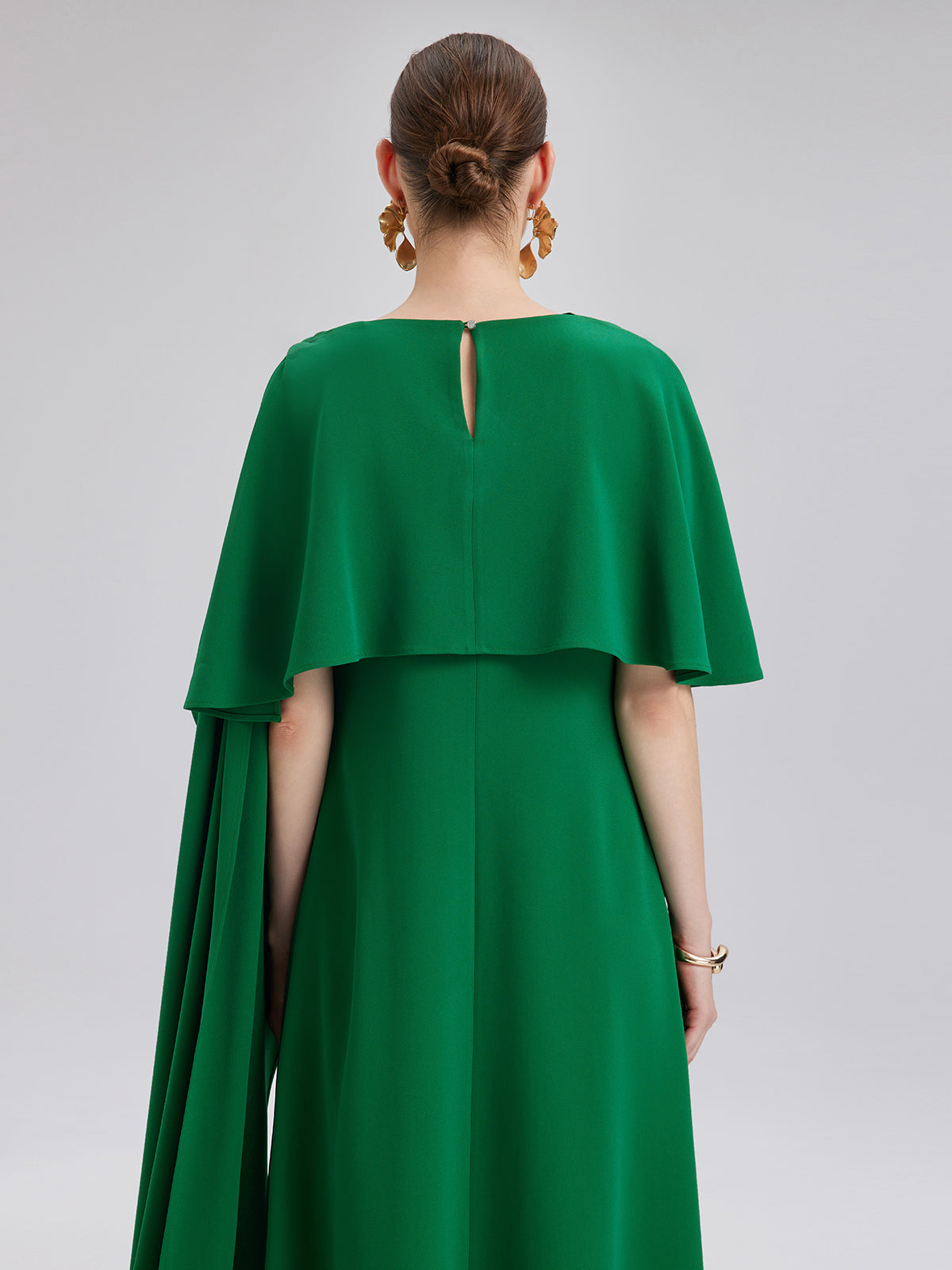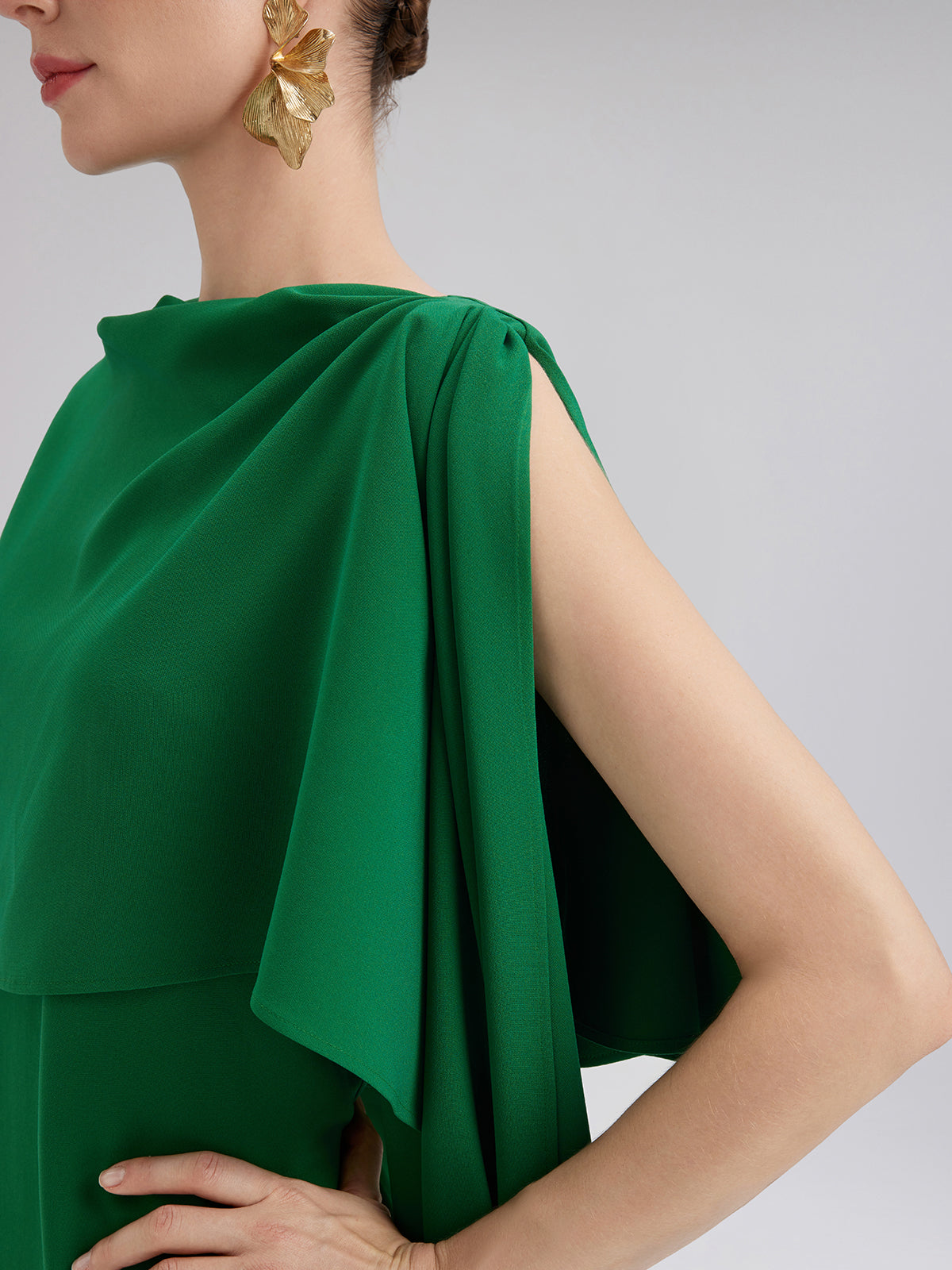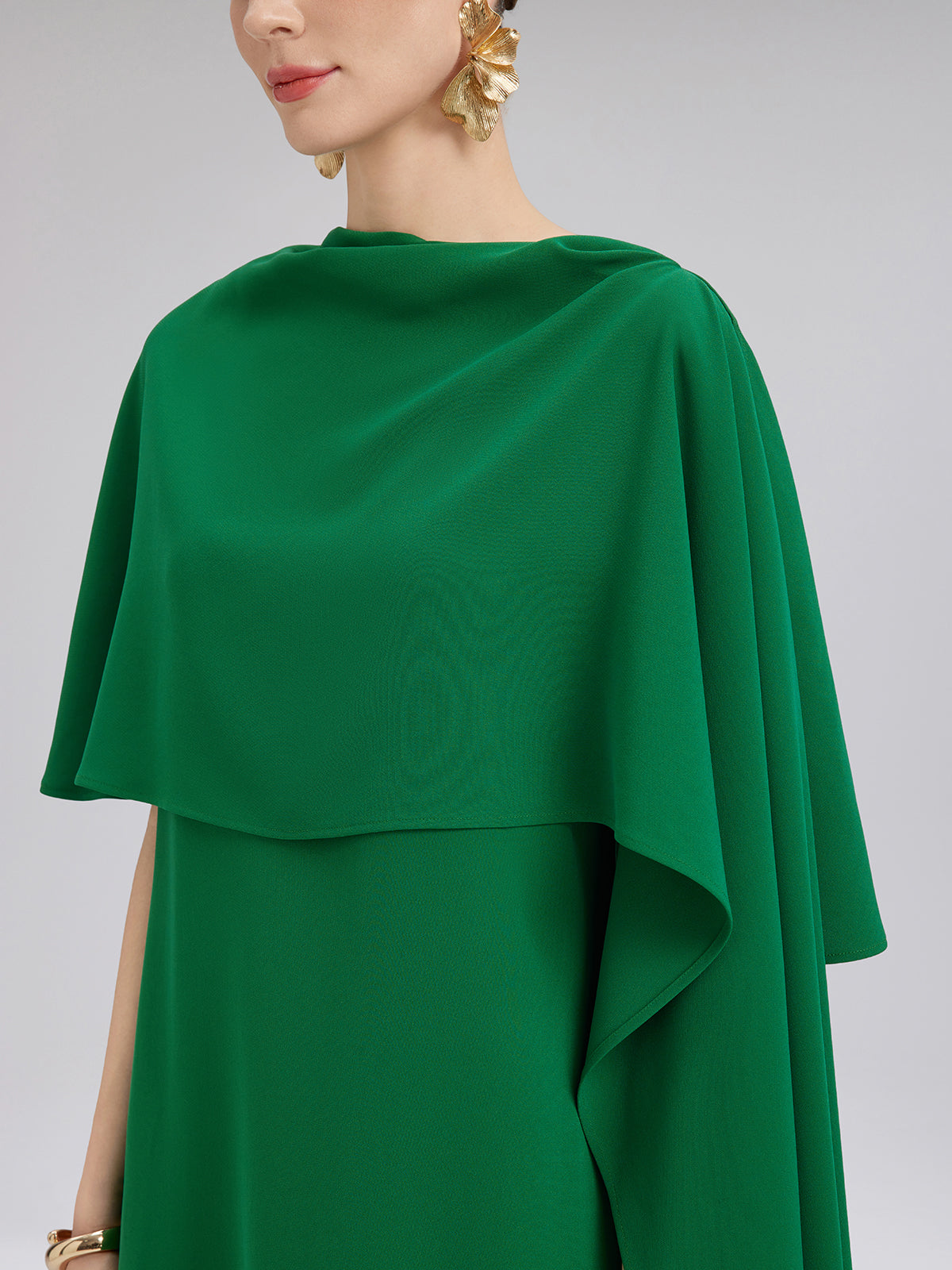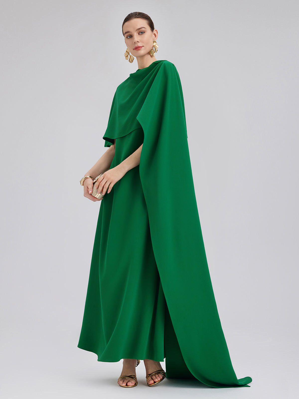 Crafted from lustrous acetate, this emerald gown features a shawl-style neckline, flowing tie detail, and a relaxed silhouette for effortless elegance. Side pockets add a subtle touch of function.