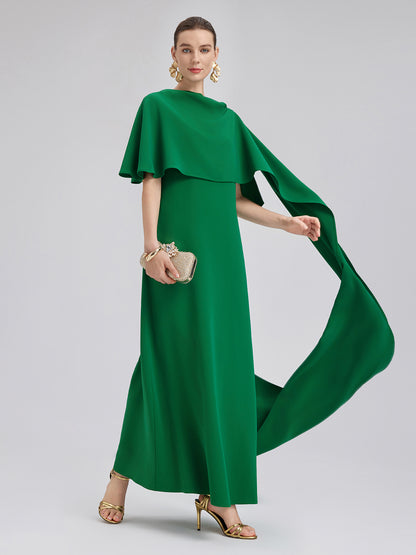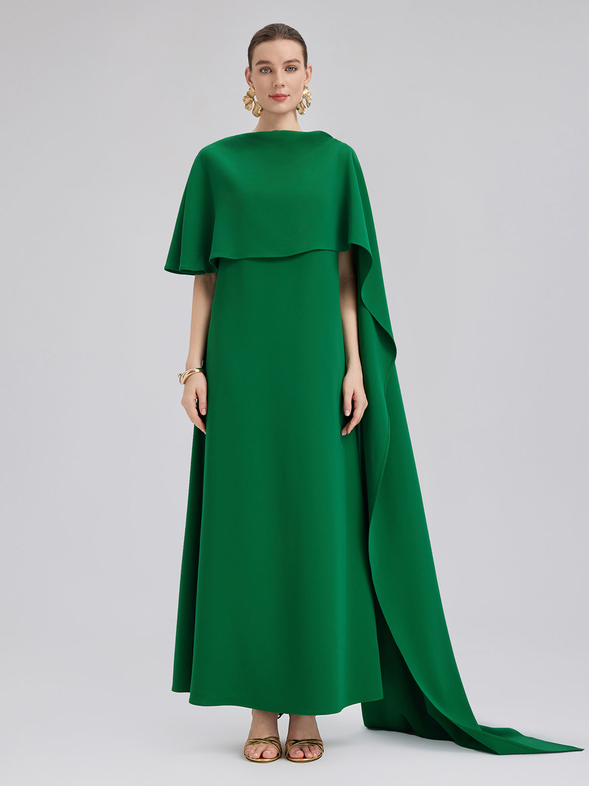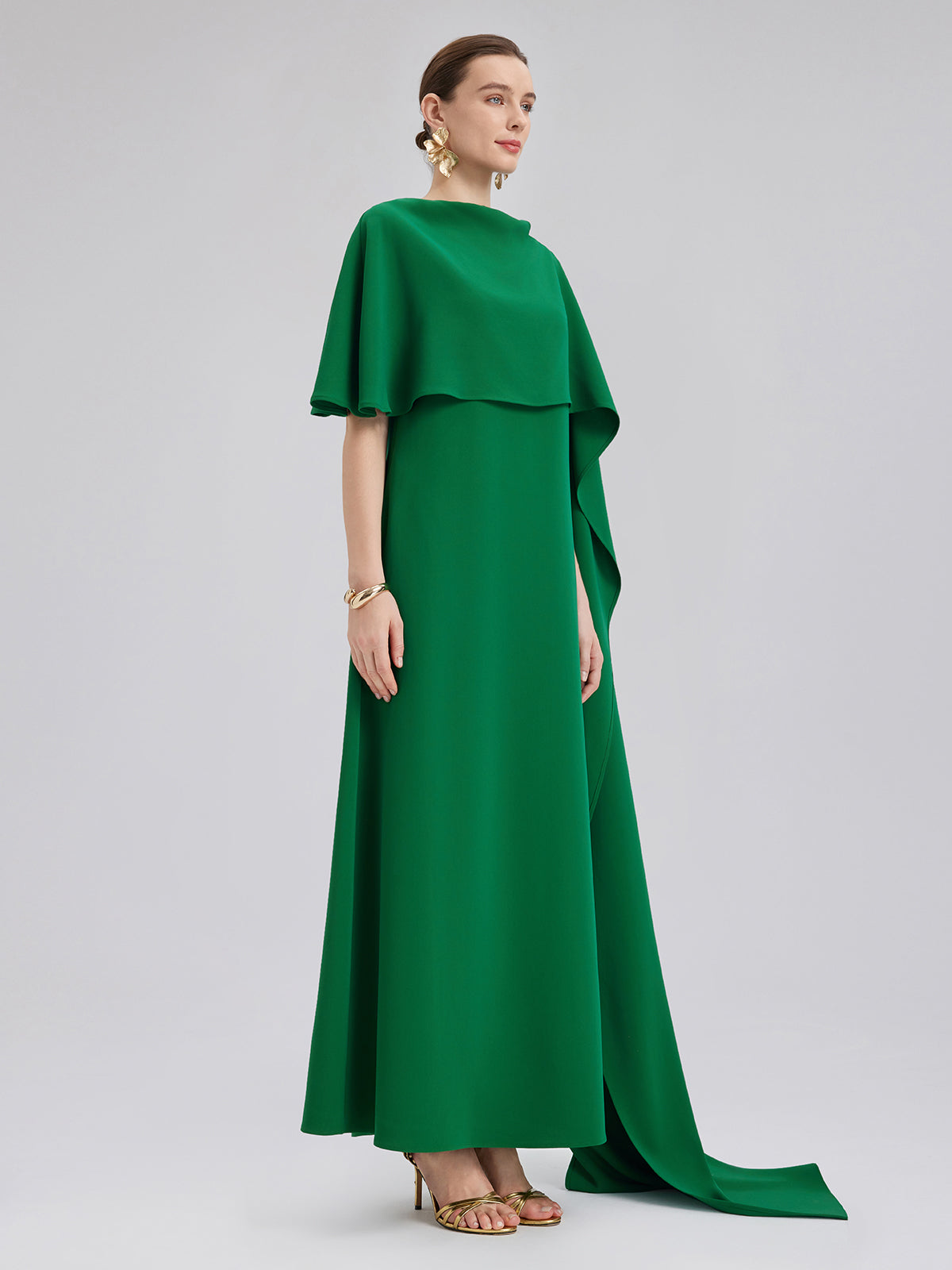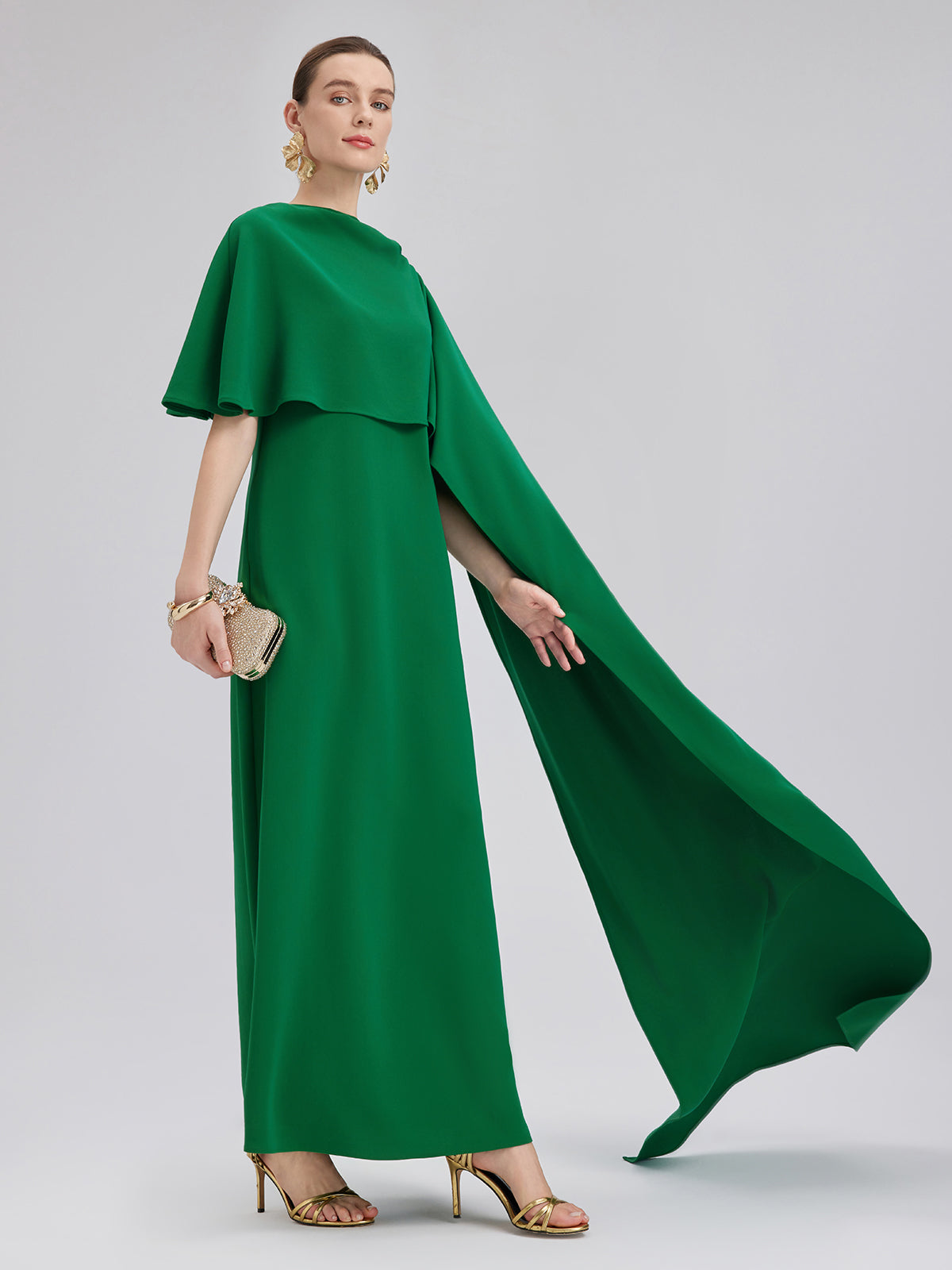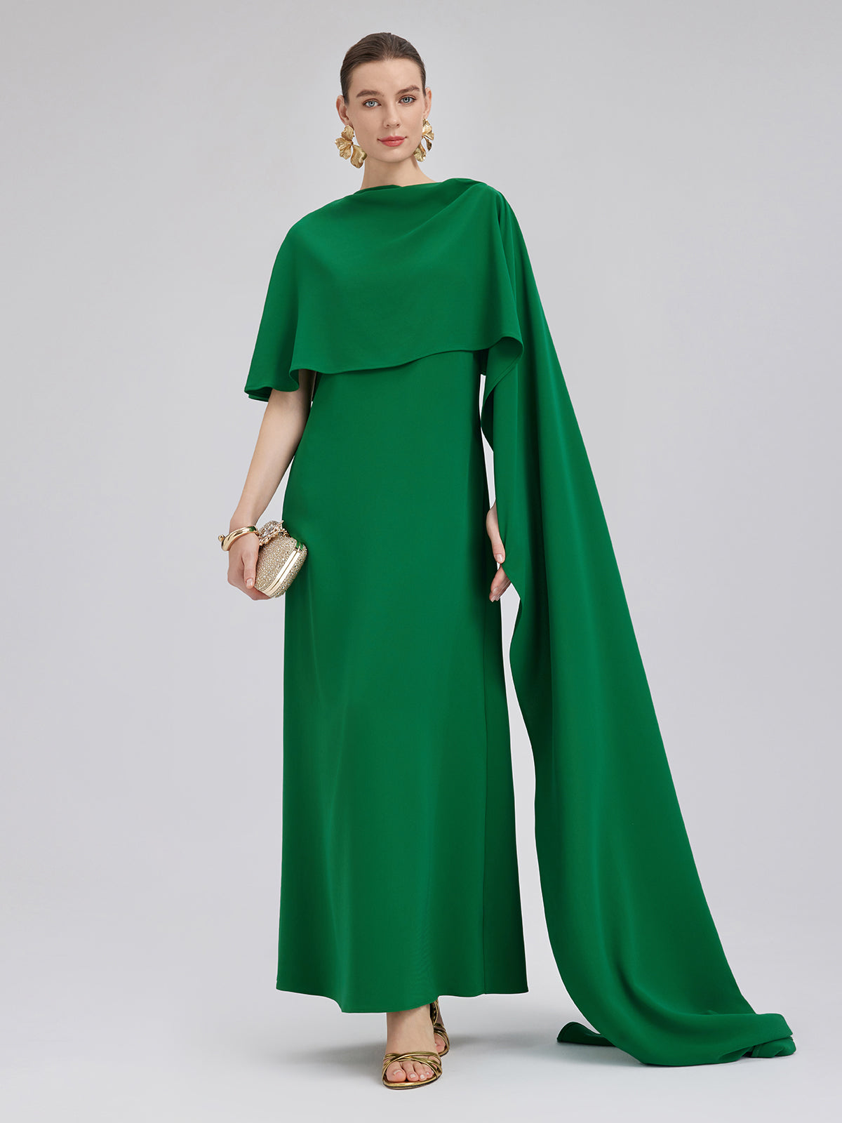 Crafted from lustrous acetate, this emerald gown features a shawl-style neckline, flowing tie detail, and a relaxed silhouette for effortless elegance. Side pockets add a subtle touch of function.