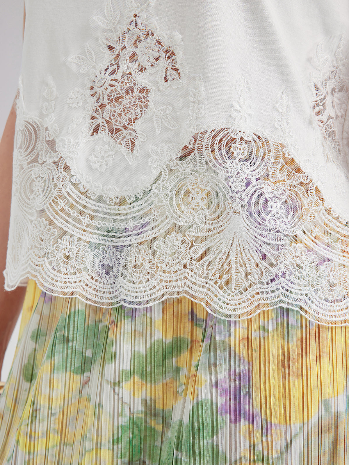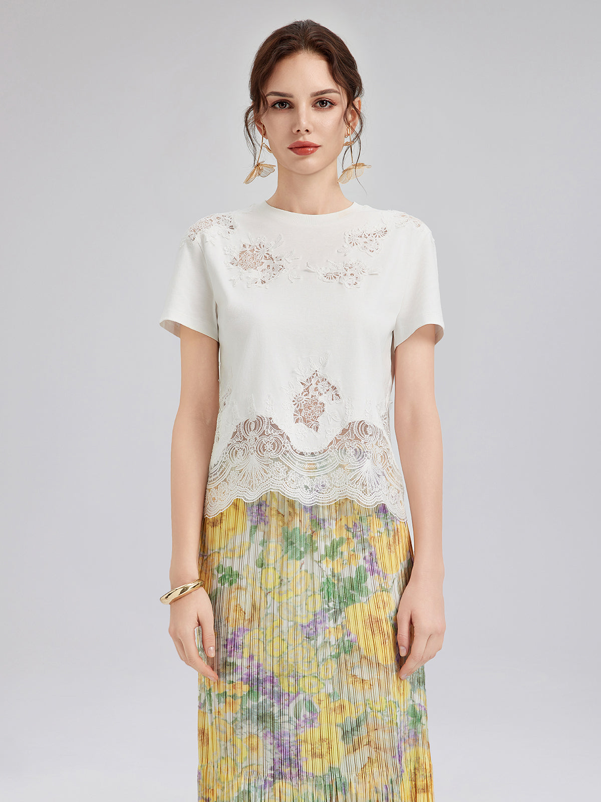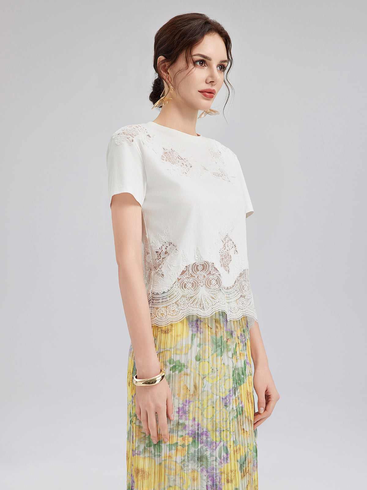 Crafted from soft, smooth 100% cotton that’s breathable, sweat-absorbent, and gentle on sensitive skin. The slight stretch and tailored fit offer comfort and shape without feeling tight. Features a gentle crew neck for a youthful touch. Delicate lace patches add romantic texture and subtle dimension.