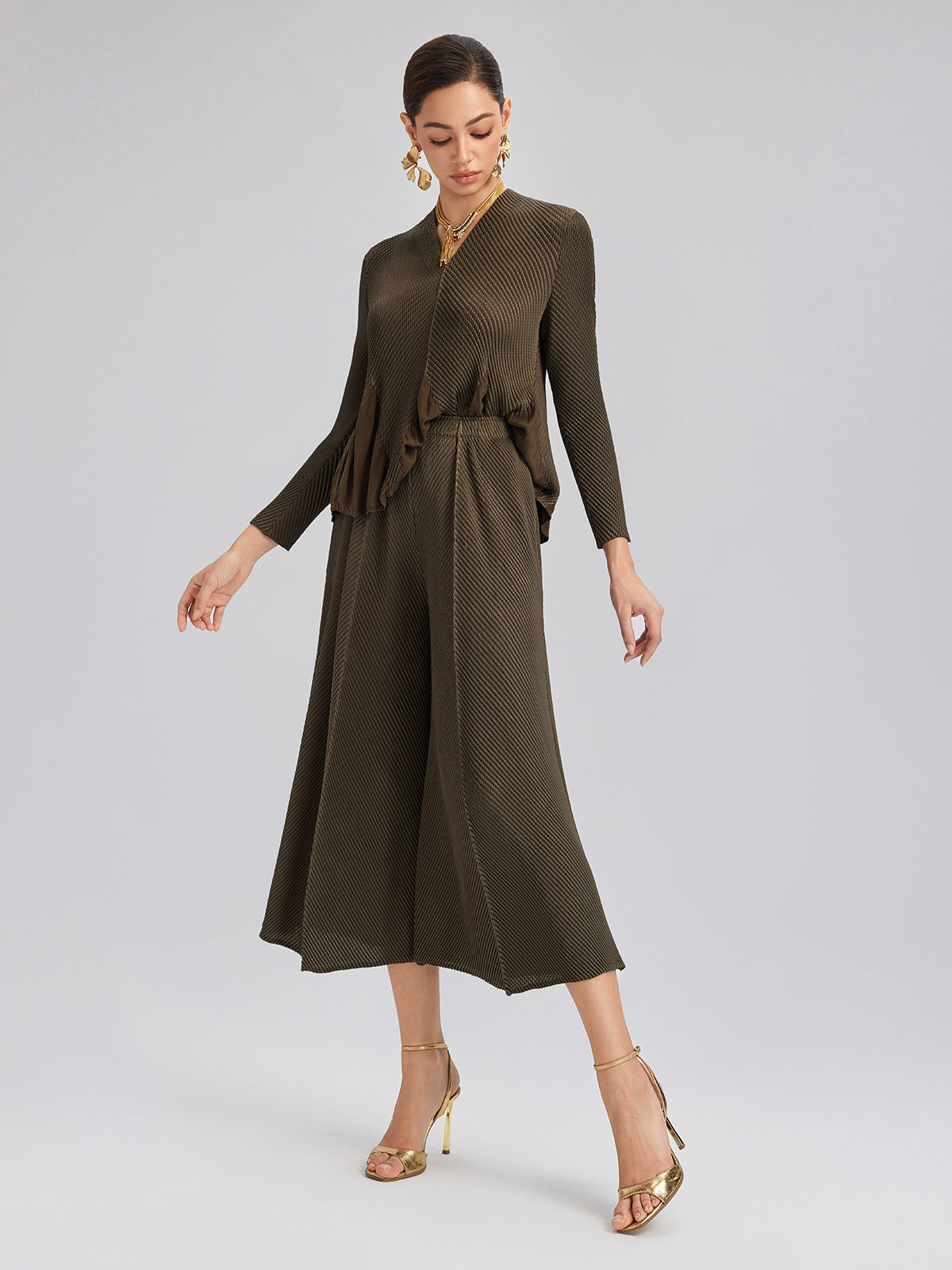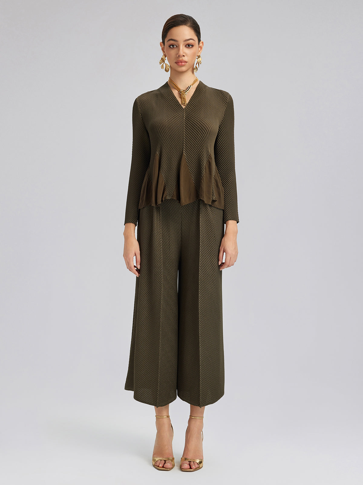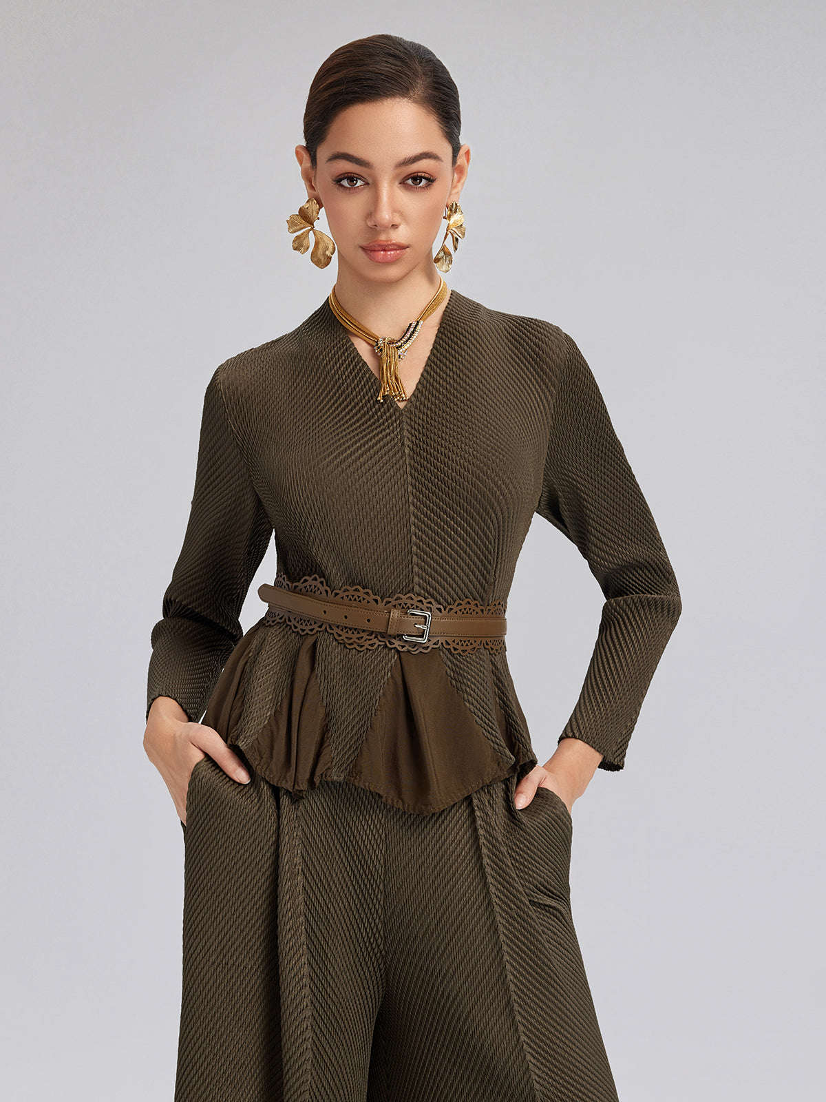 This blouse features sculpted petal-like pleats at the V-neck and cuffs, adding layered, romantic artistry. The pleated fabric, with a structured, rhythmic texture, creates a tactile, visually elevated finish. Its relaxed long sleeves drape effortlessly, concealing the arms while conveying a casual, sophisticated charm. The included belt is only for styling.