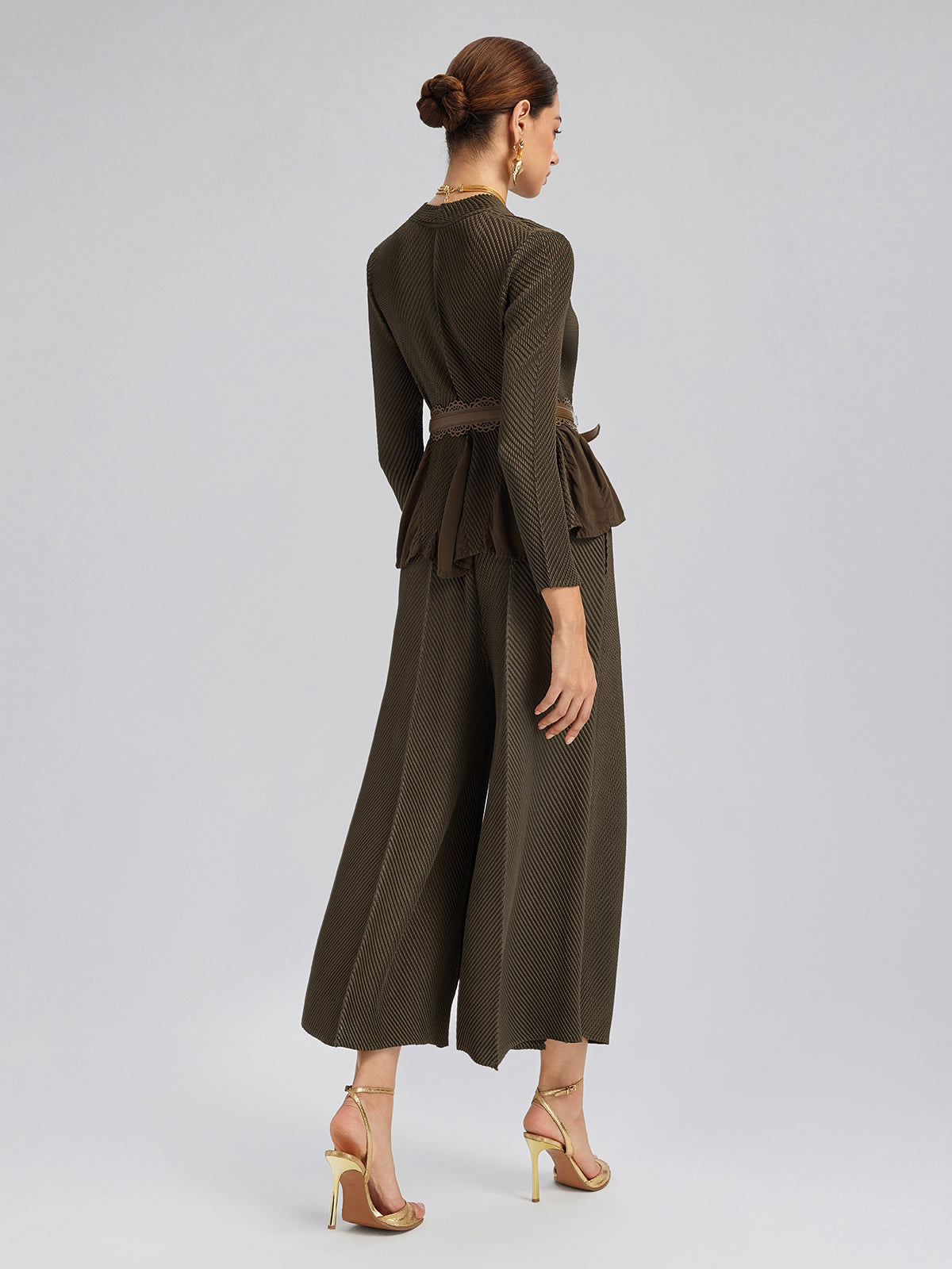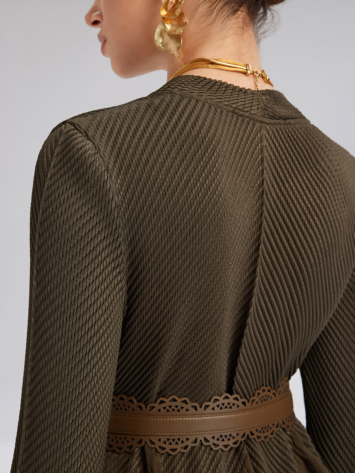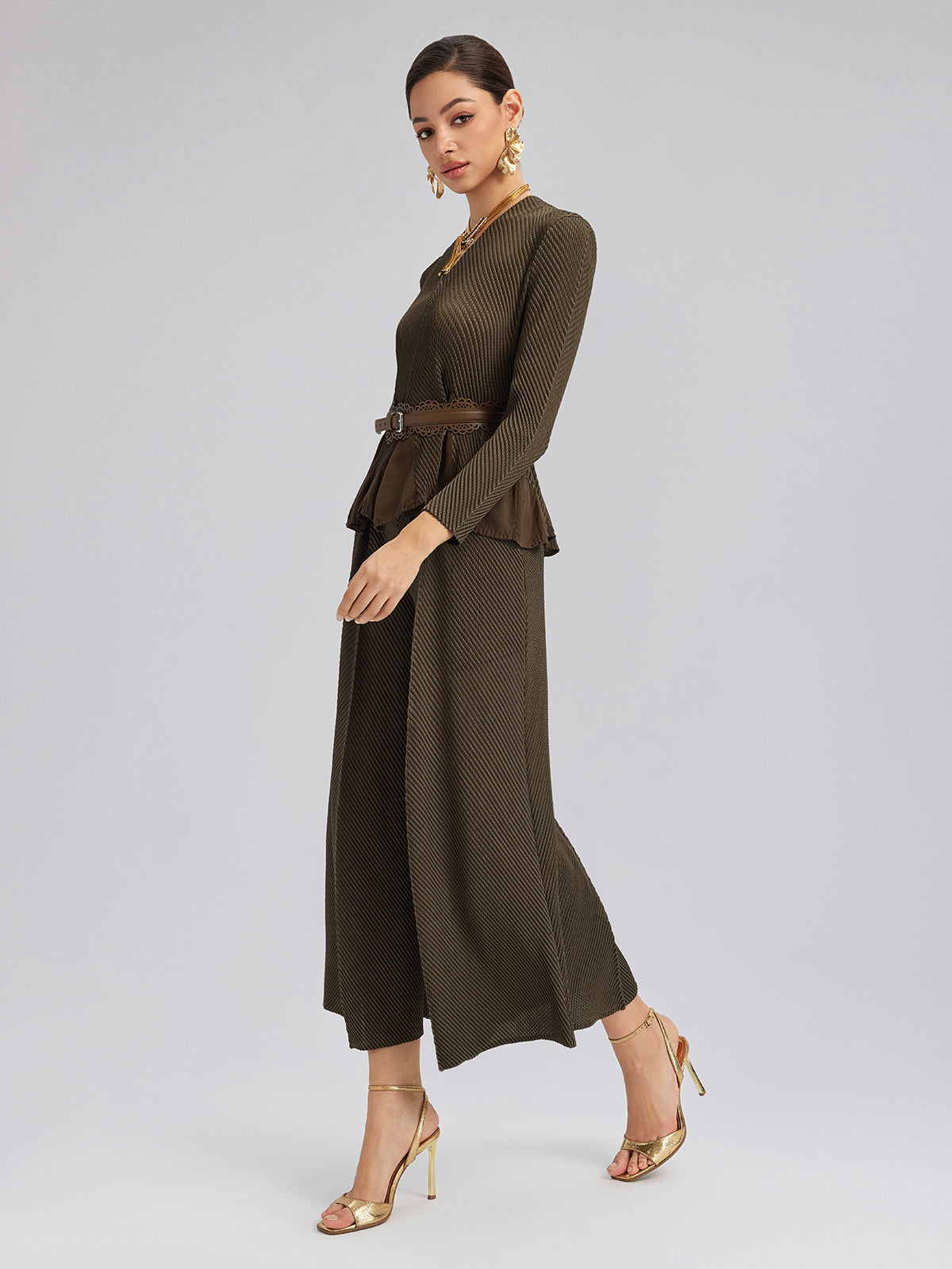 This blouse features sculpted petal-like pleats at the V-neck and cuffs, adding layered, romantic artistry. The pleated fabric, with a structured, rhythmic texture, creates a tactile, visually elevated finish. Its relaxed long sleeves drape effortlessly, concealing the arms while conveying a casual, sophisticated charm. The included belt is only for styling.