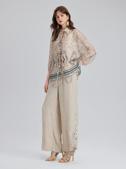 Made from premium French ramie fabric, these pants are lightweight, breathable, and perfect for summer. The delicate lace and crochet flower details add elegance, while the relaxed straight-leg cut offers both comfort and a flattering silhouette. A braided belt completes the look, adding a touch of bohemian charm.