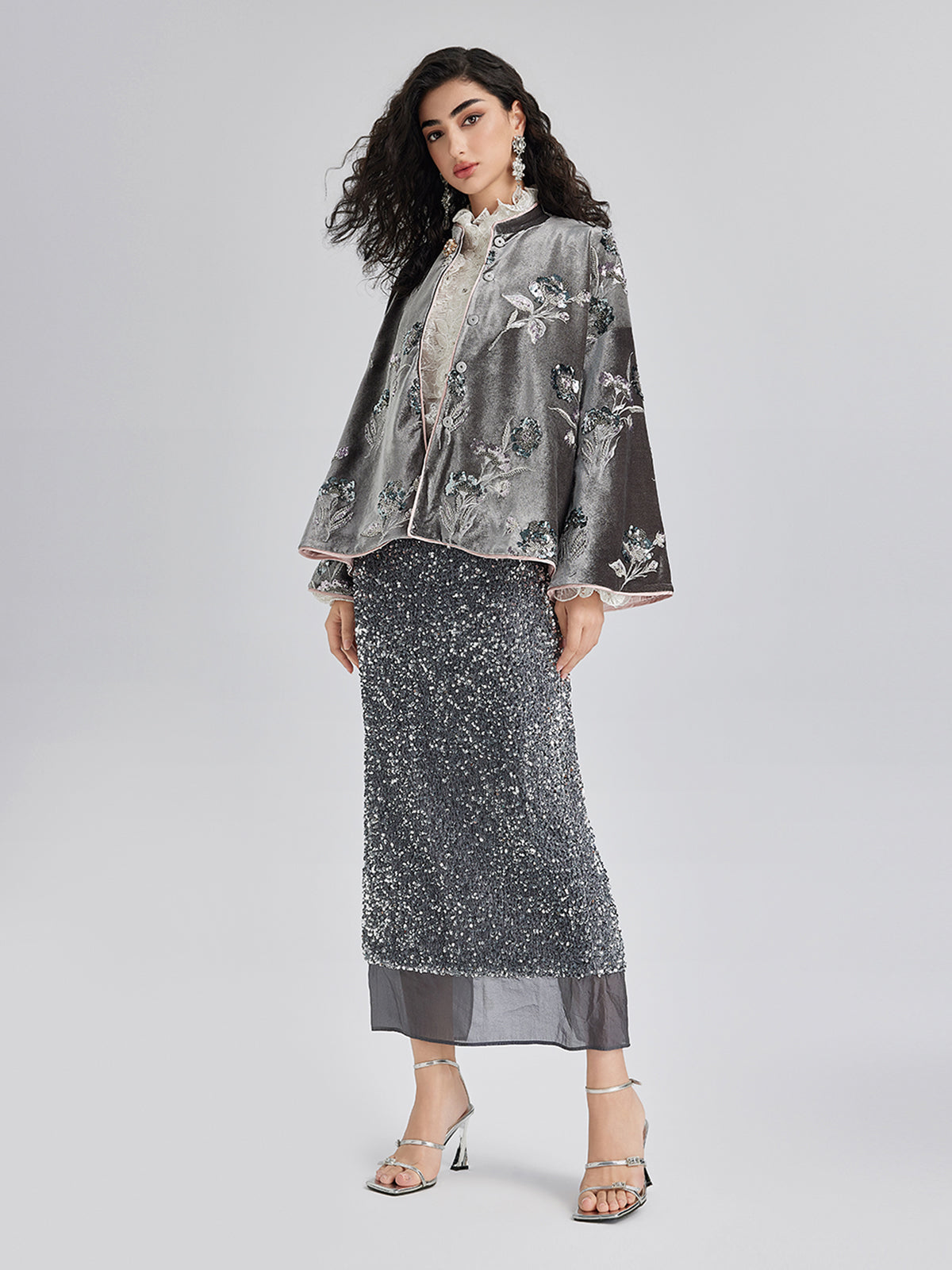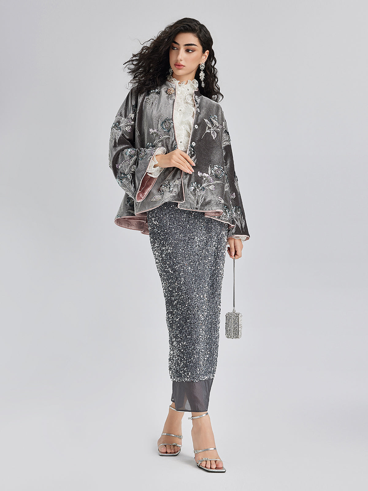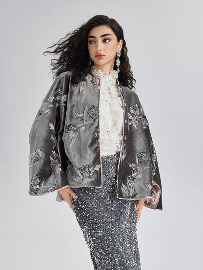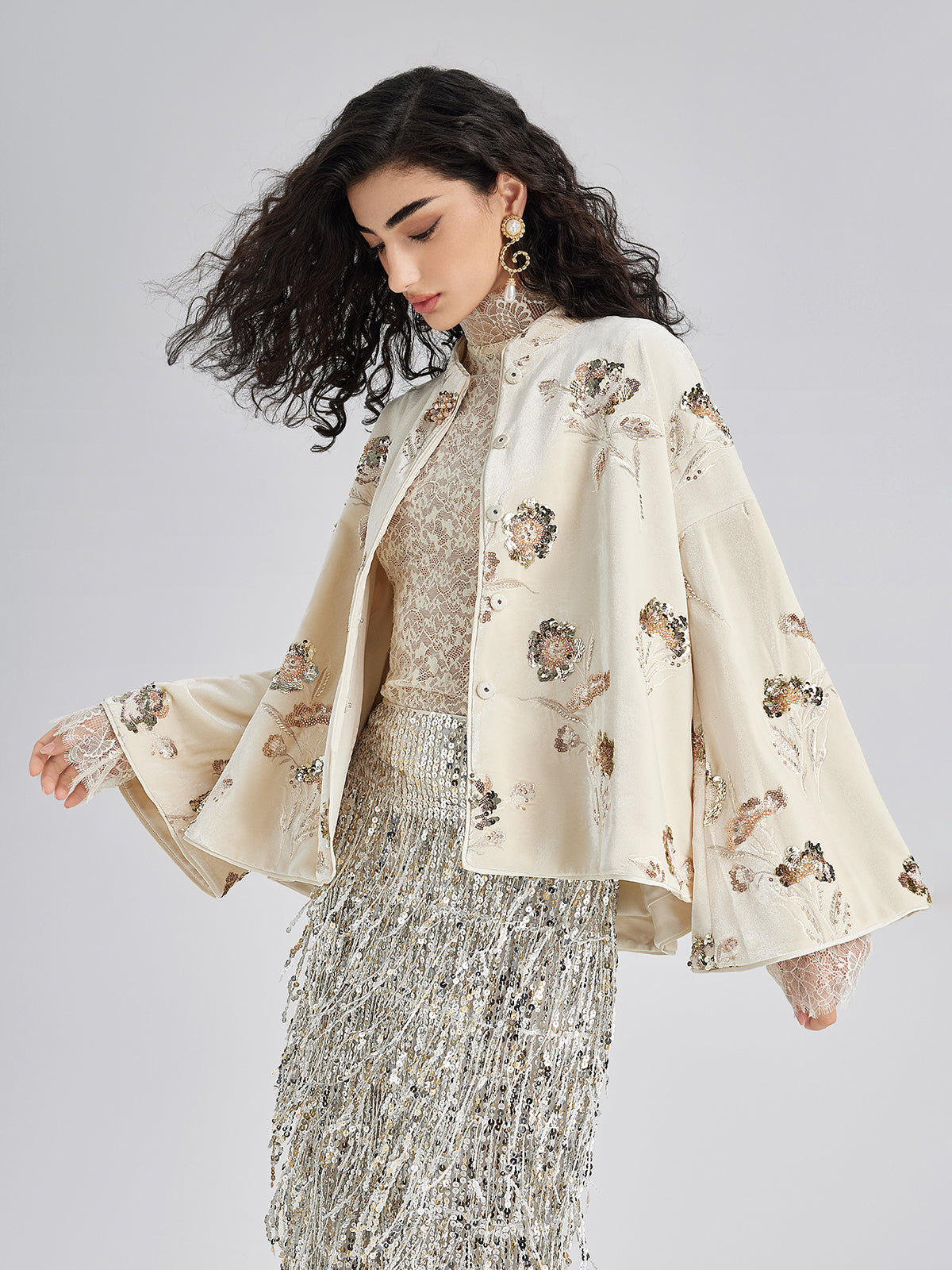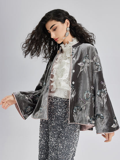Crafted from luxurious velvet, this coat combines a soft touch with an elegant sheen. Featuring hand-beaded floral embroidery, it exudes sophisticated charm. The soft hue and retro mandarin collar add refined grace, while the flared sleeves and loose silhouette offer a modern, elegant fit for various occasions.