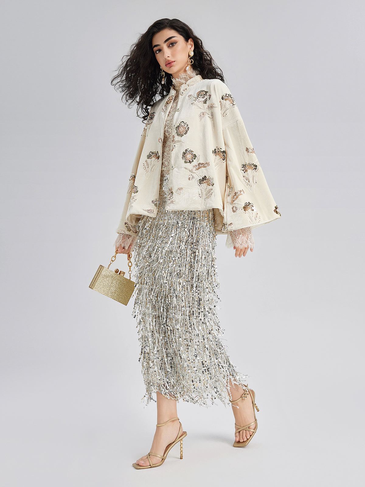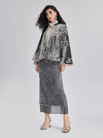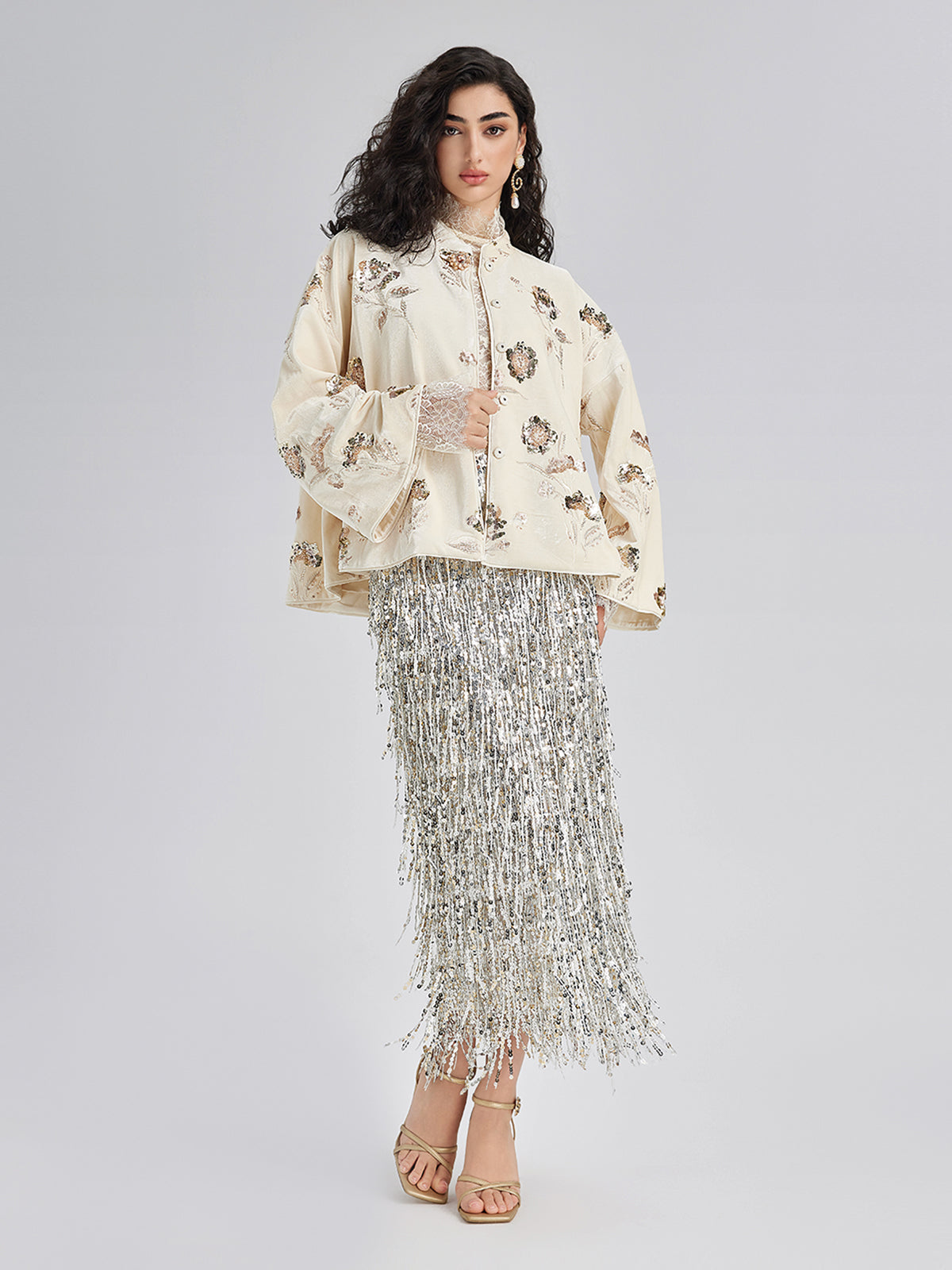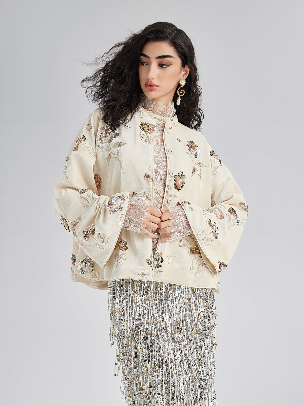 Crafted from luxurious velvet, this coat combines a soft touch with an elegant sheen. Featuring hand-beaded floral embroidery, it exudes sophisticated charm. The soft hue and retro mandarin collar add refined grace, while the flared sleeves and loose silhouette offer a modern, elegant fit for various occasions.