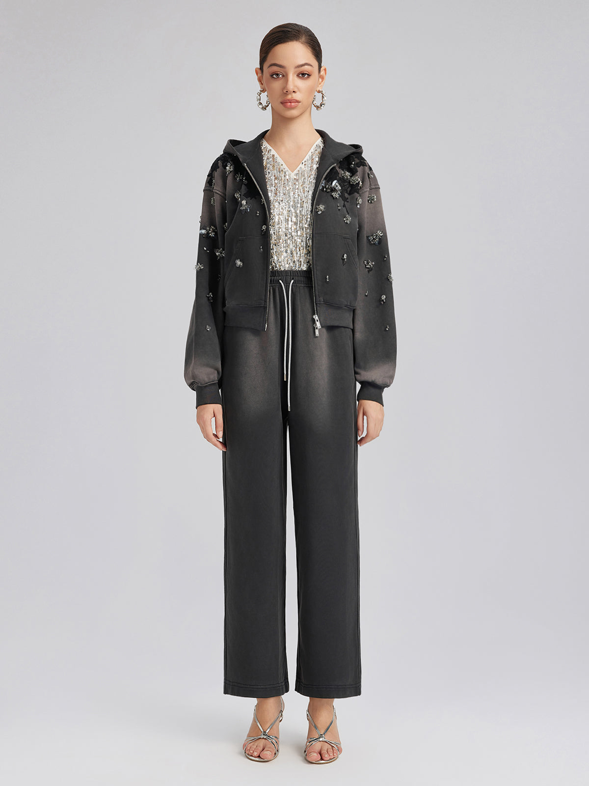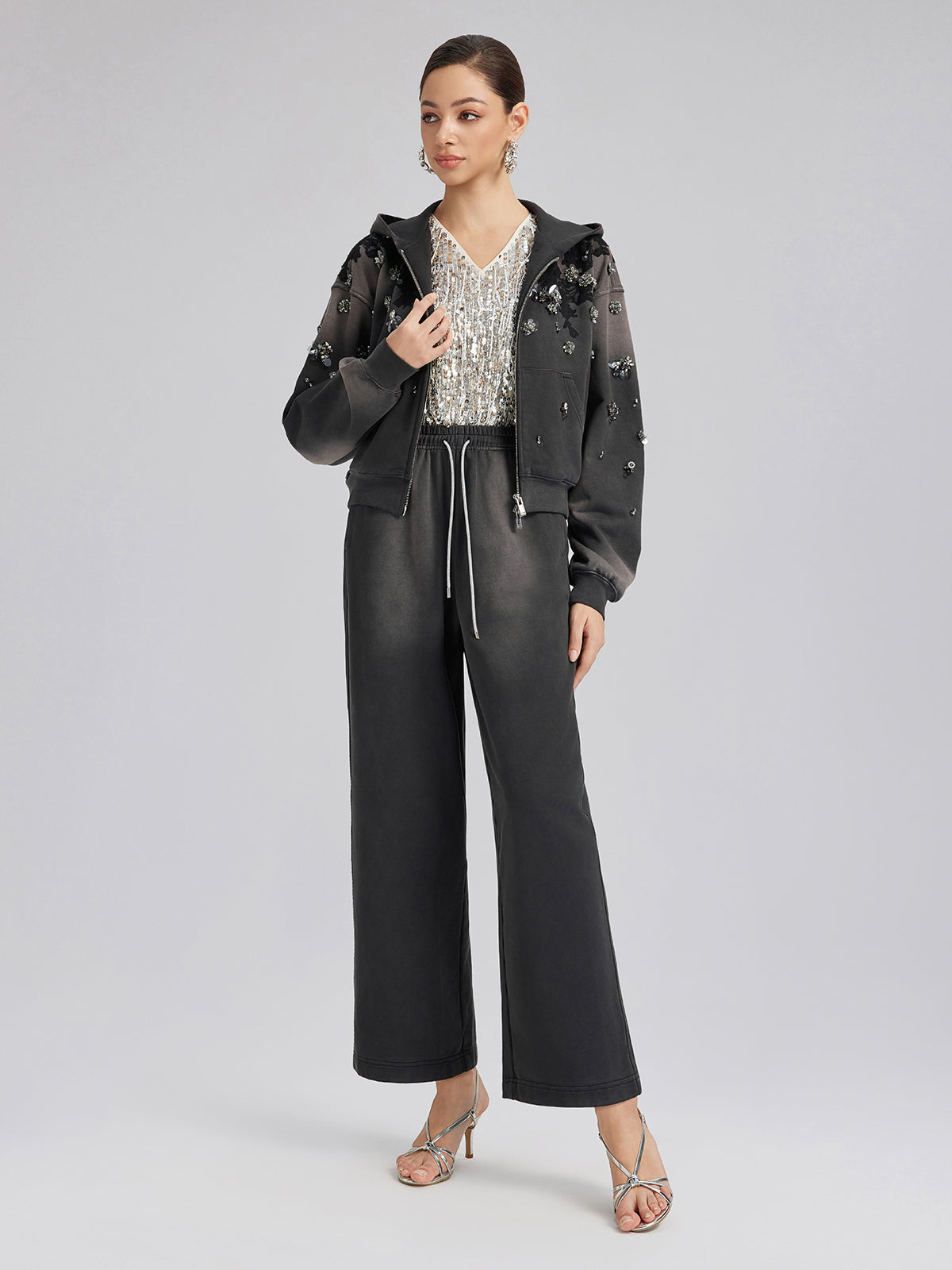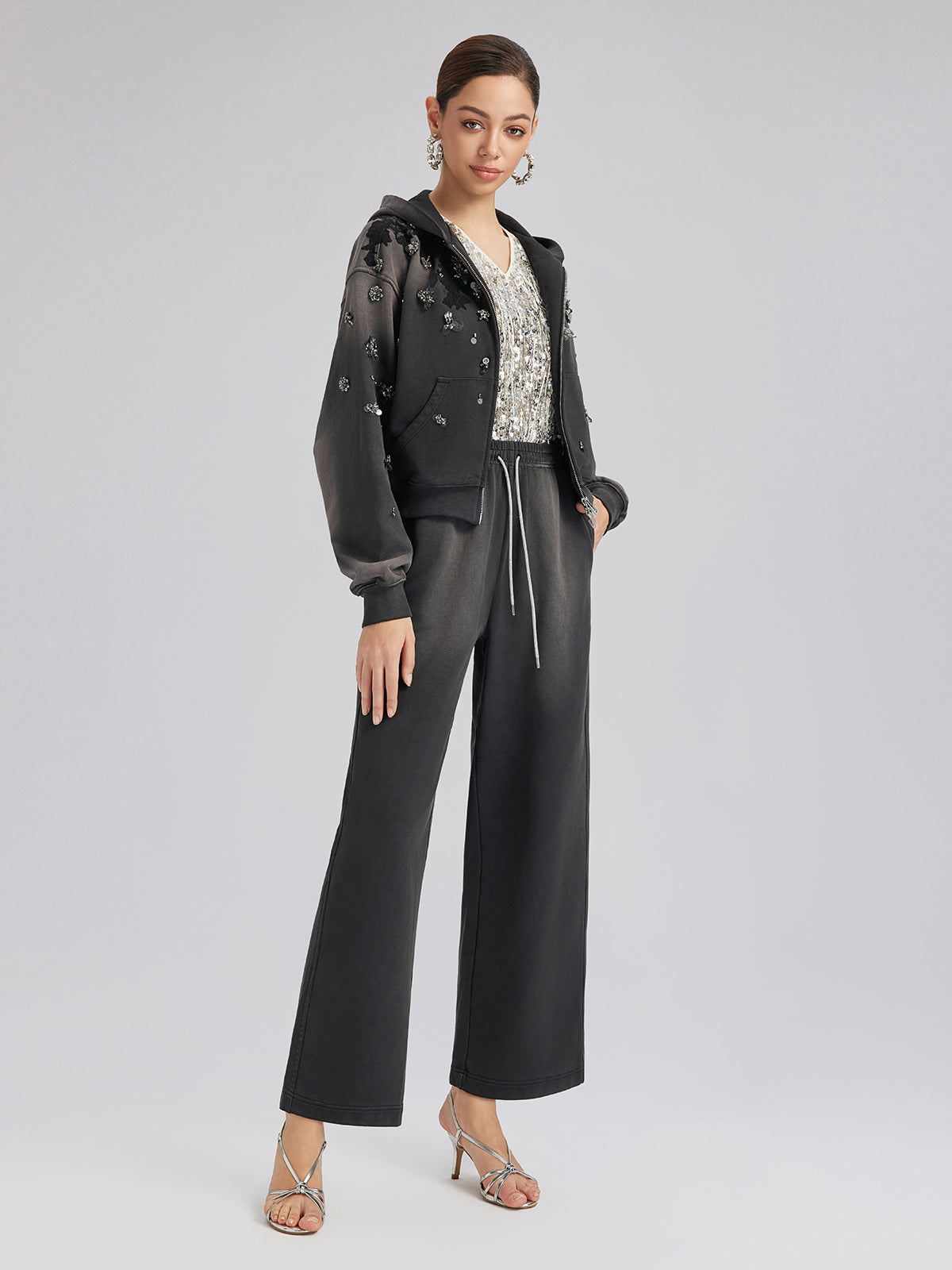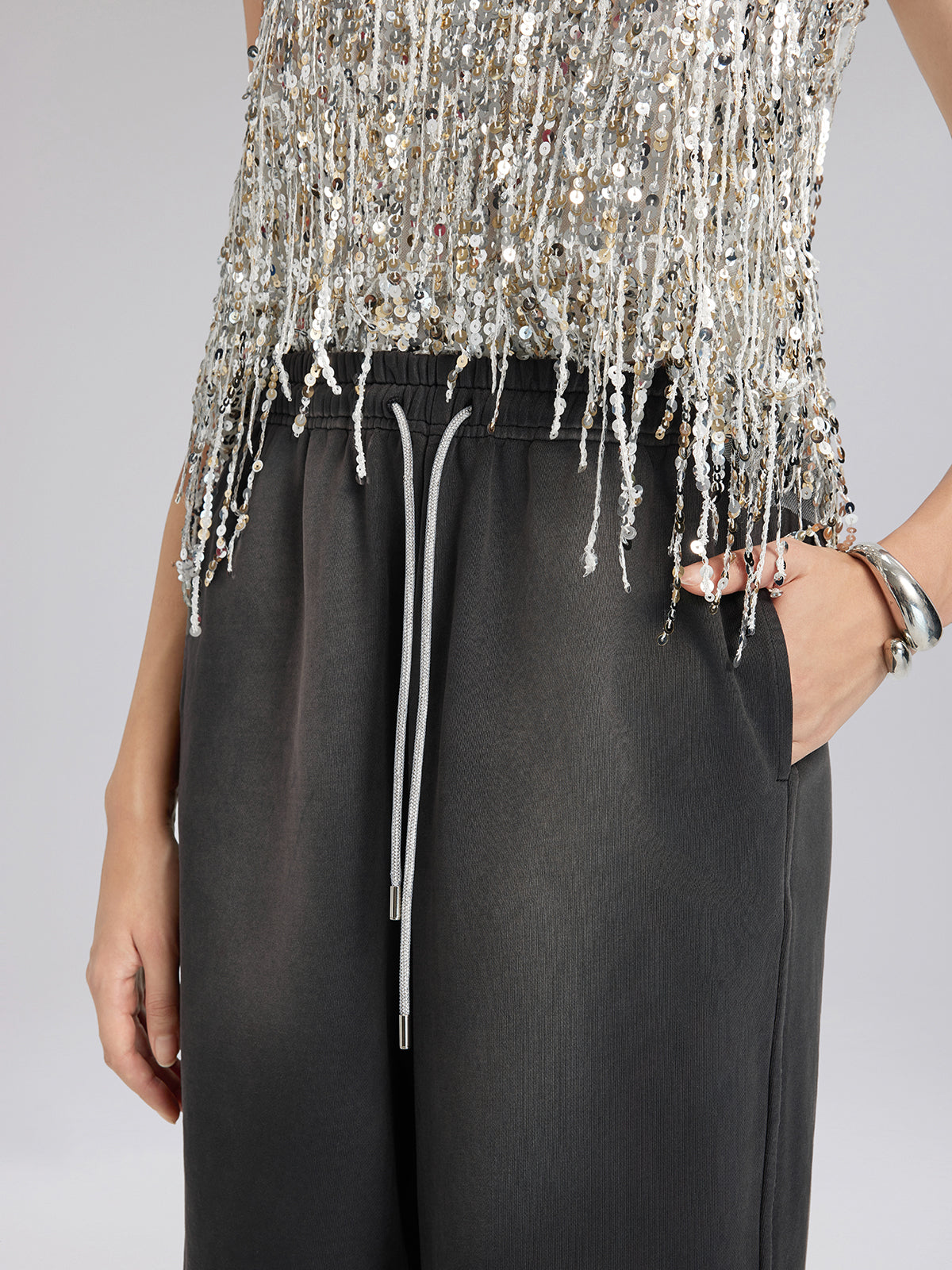 Crafted from washed gradient fabric with a layered, distinctive texture, these pants feature rhinestone drawstring that adds refined sparkle. The elastic waistband ensures comfort and flexibility for all body types. With a loose straight-leg fit, they flatter the silhouette while exuding effortless ease, perfect for daily wear or relaxed outings.