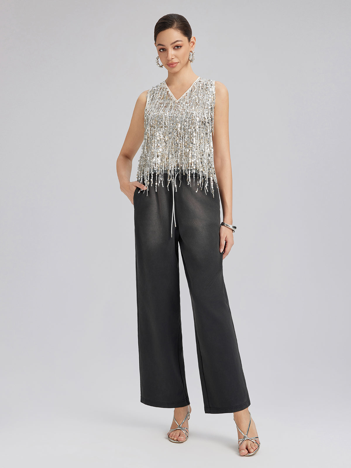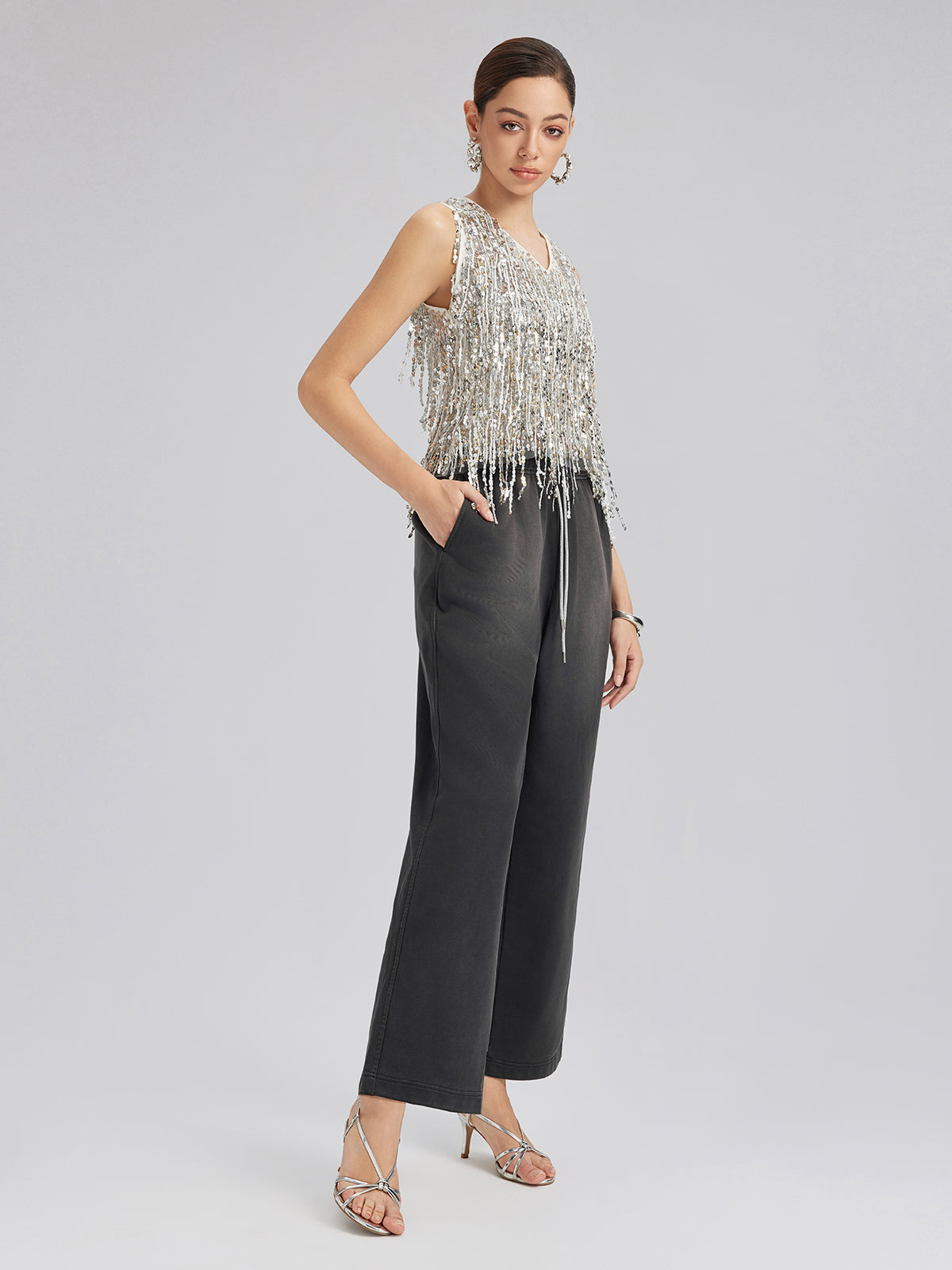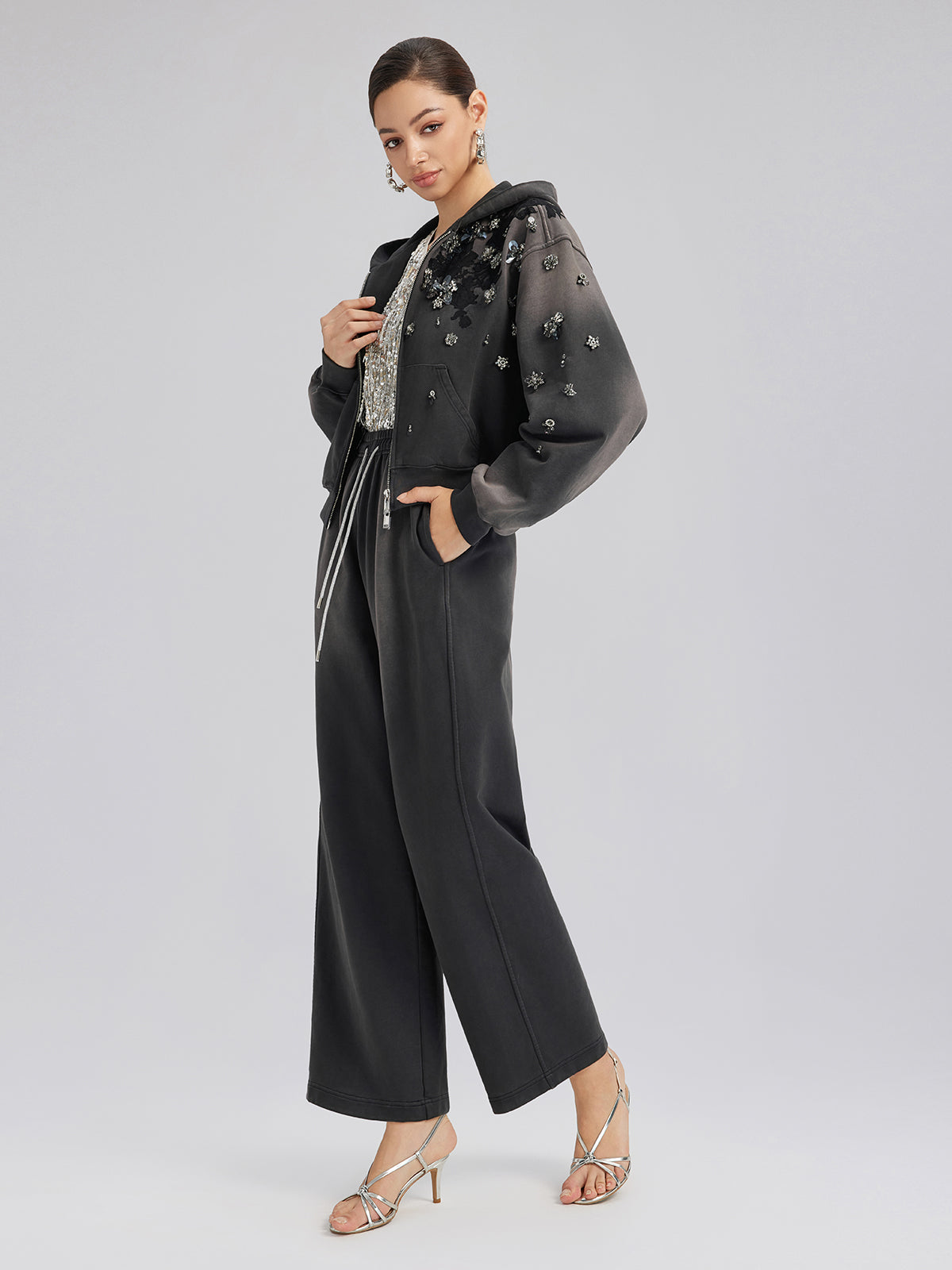 Crafted from washed gradient fabric with a layered, distinctive texture, these pants feature rhinestone drawstring that adds refined sparkle. The elastic waistband ensures comfort and flexibility for all body types. With a loose straight-leg fit, they flatter the silhouette while exuding effortless ease, perfect for daily wear or relaxed outings.