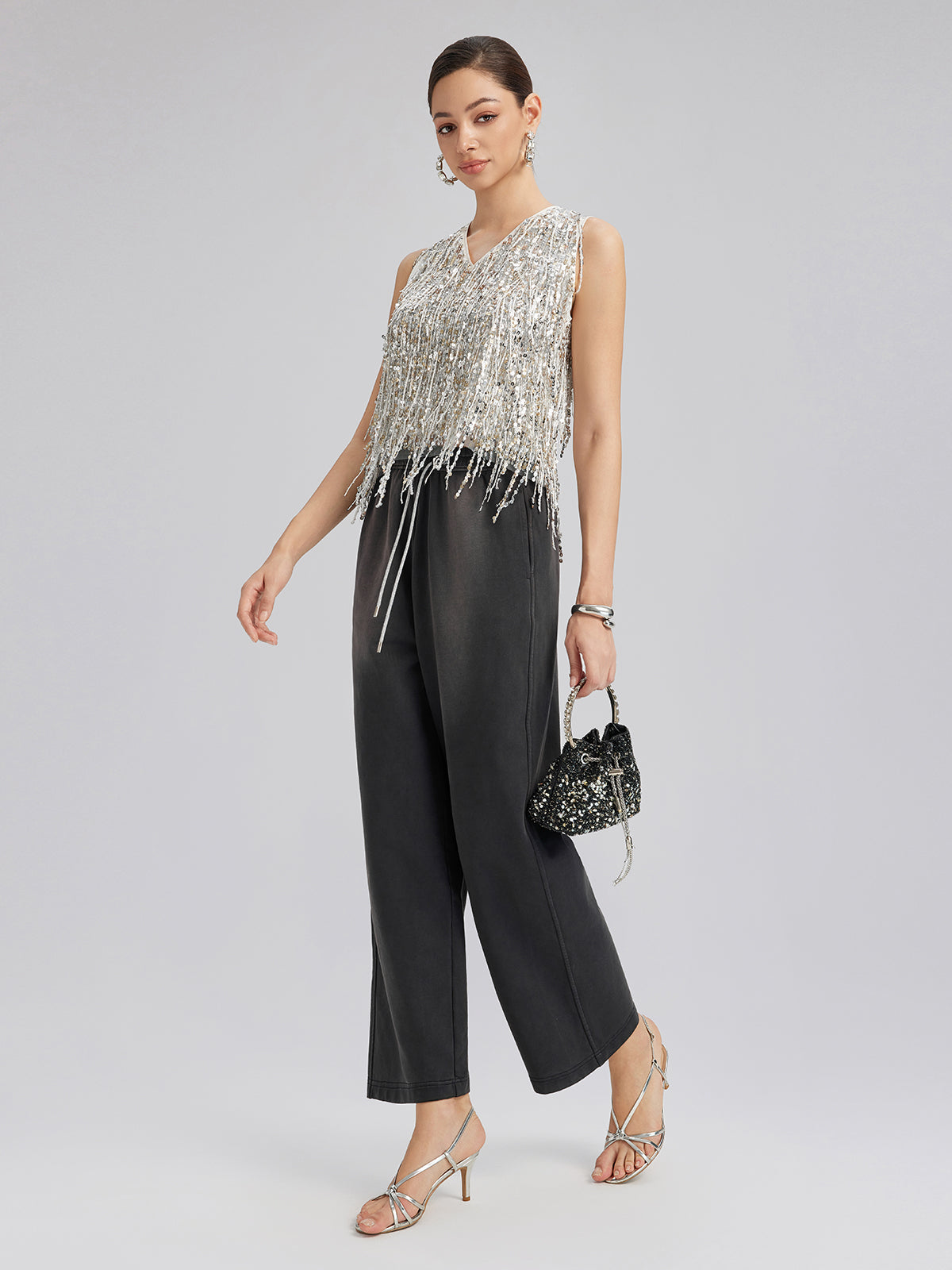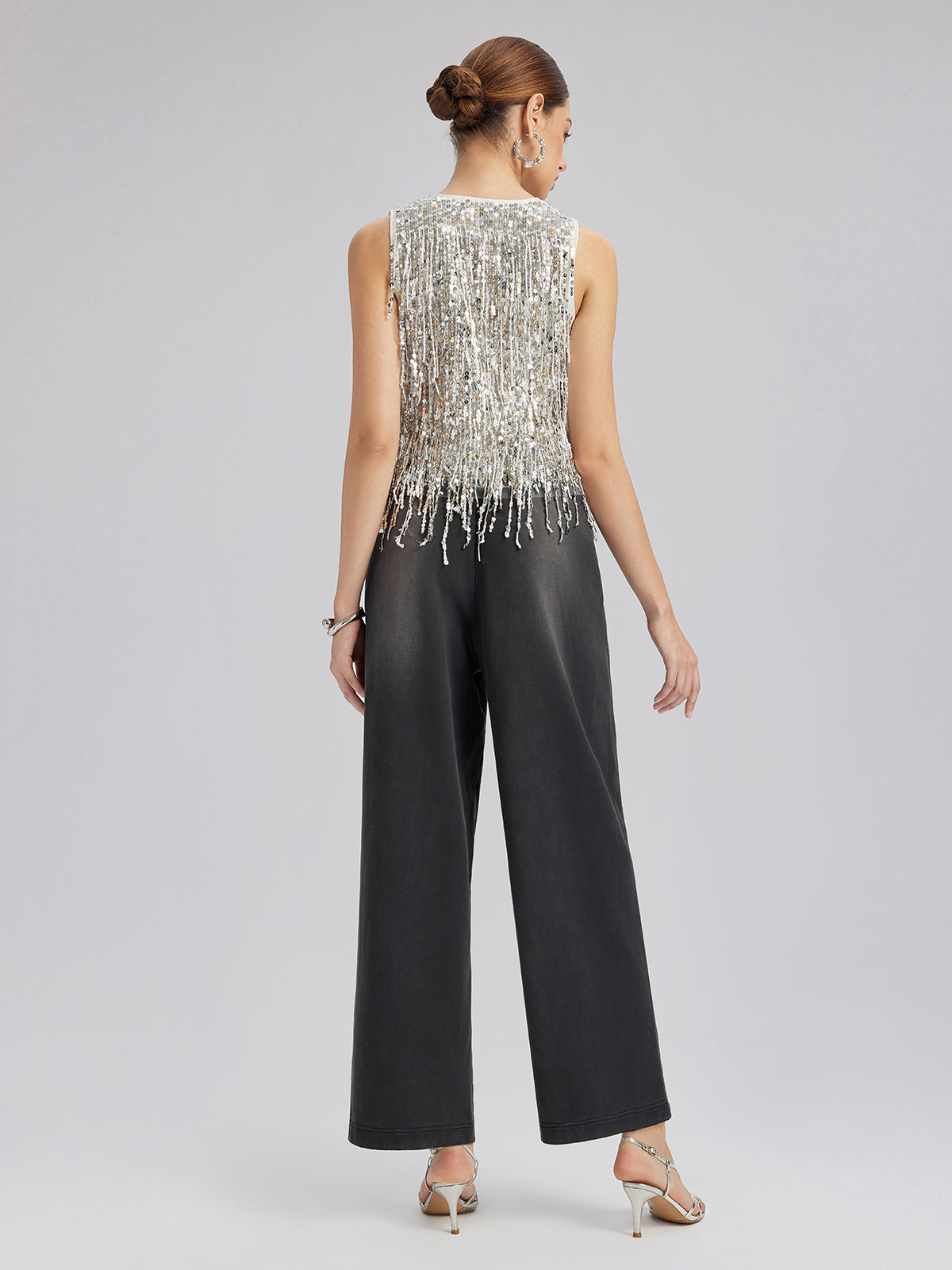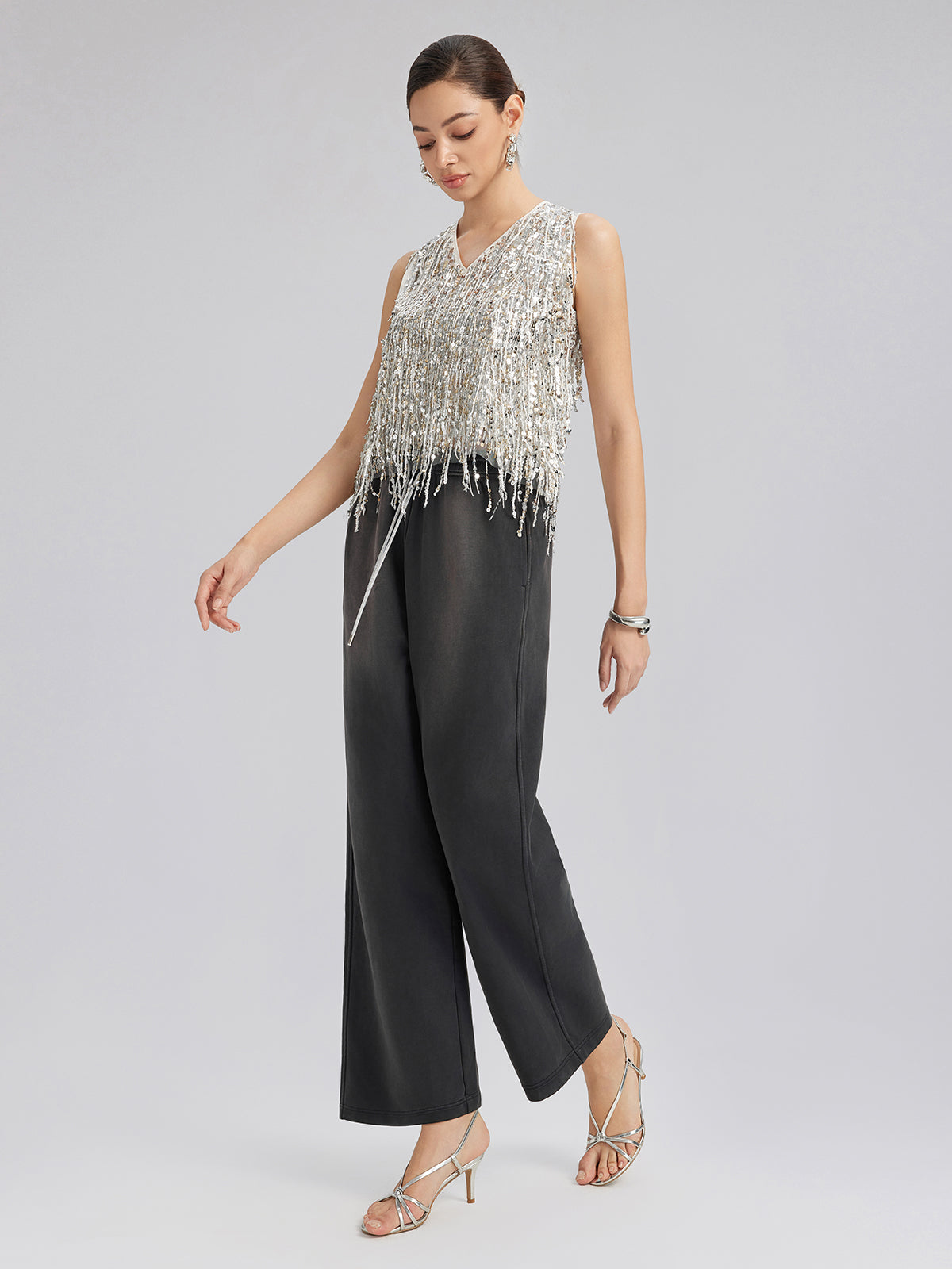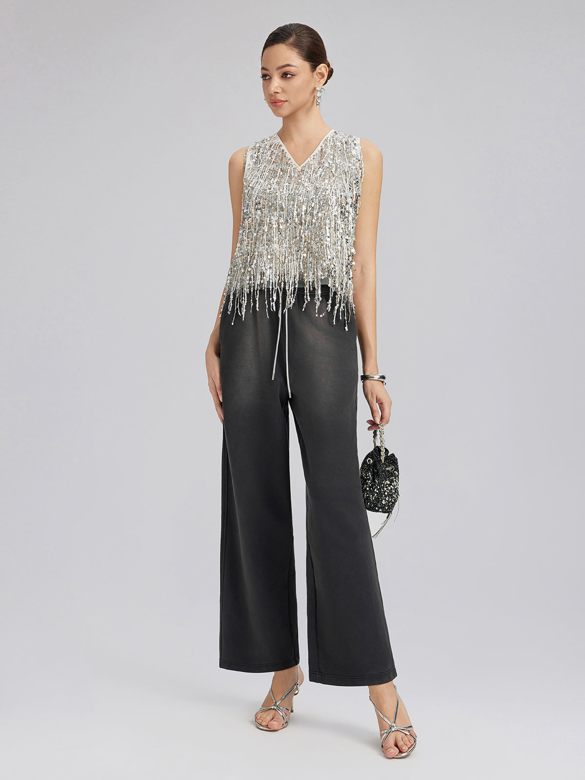 Crafted from washed gradient fabric with a layered, distinctive texture, these pants feature rhinestone drawstring that adds refined sparkle. The elastic waistband ensures comfort and flexibility for all body types. With a loose straight-leg fit, they flatter the silhouette while exuding effortless ease, perfect for daily wear or relaxed outings.