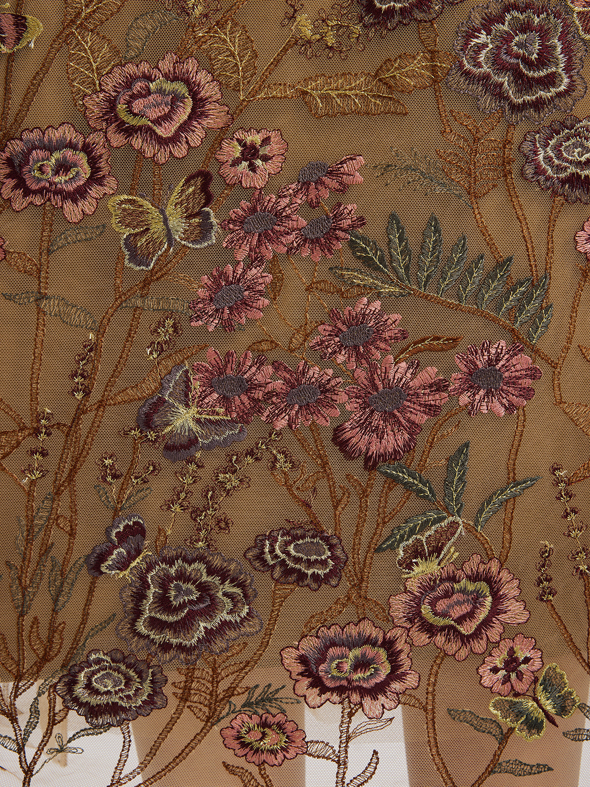 The upper part is crafted in knit fabric that drapes close to the body with a soft shimmer, while the mesh skirt flows light and sheer, densely embroidered with vivid florals. Together they create a dialogue of “gentle knit embrace + romantic embroidered tulle.”